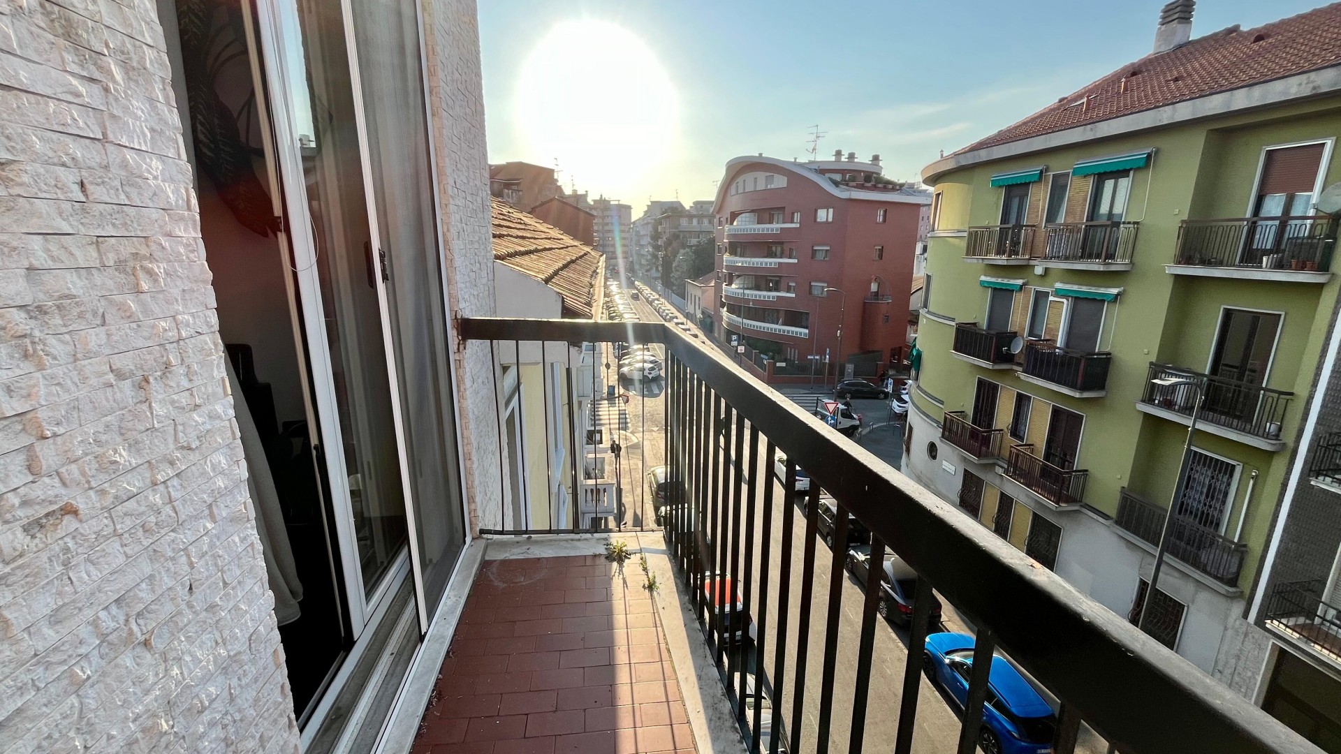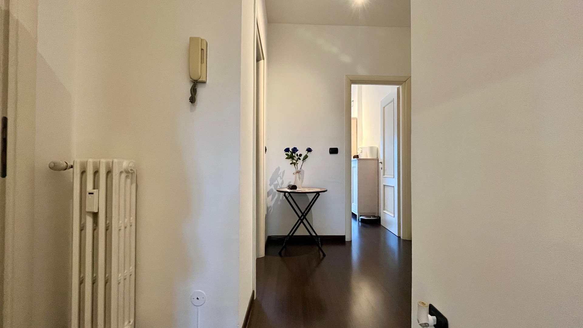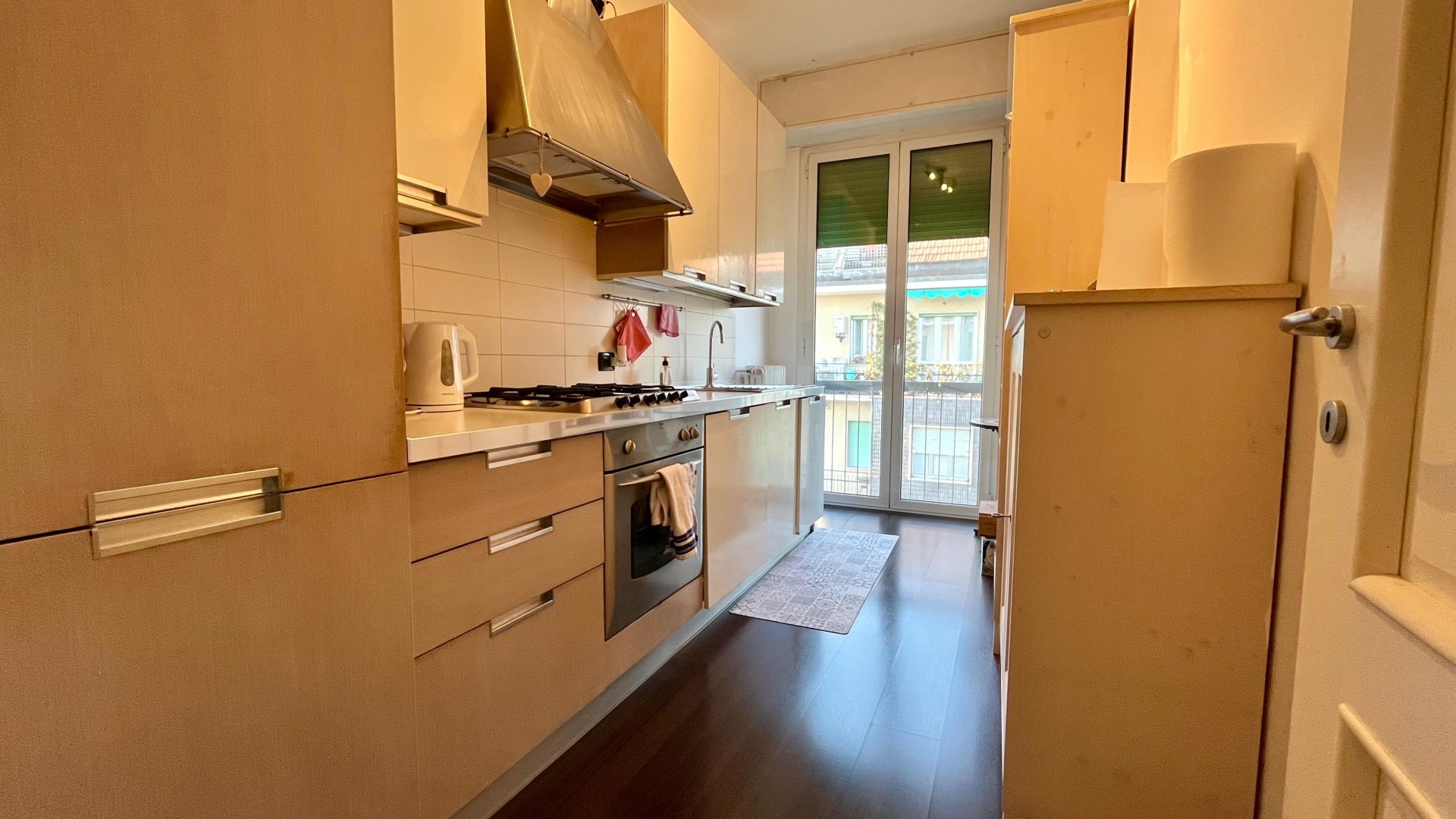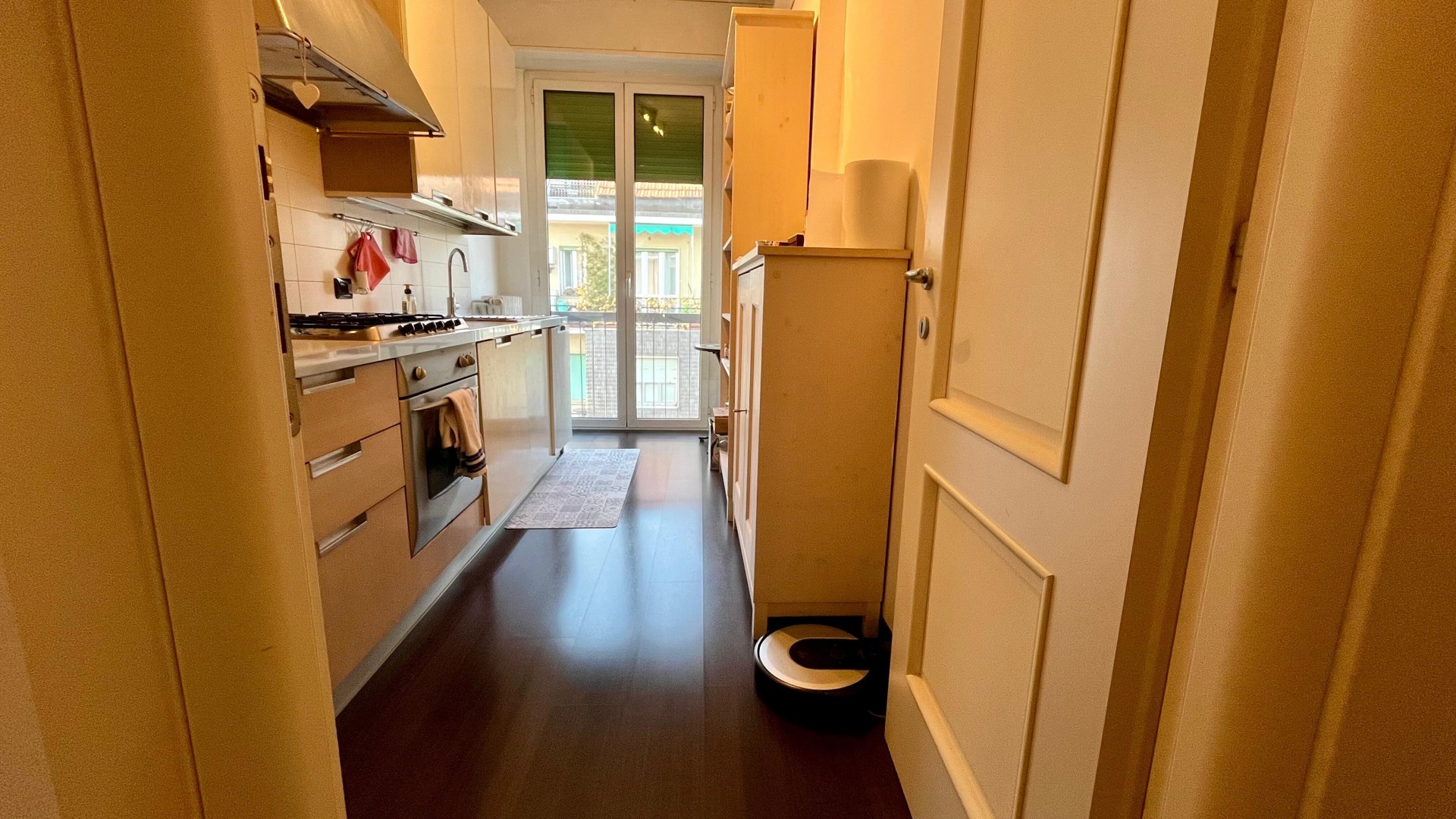 L’appartamento si apre su un ingresso con corridoio che collega in modo funzionale la zona giorno alla zona notte. La zona giorno è composta da un disimpegno che conduce a un ampio e luminoso soggiorno, arricchito da un piccolo balcone con affaccio esterno, e da una cucina abitabile, anch’essa molto luminosa grazie alla porta finestra. La zona notte è caratterizzata da una camera da letto di generose dimensioni, con accesso a un secondo balcone con affaccio interno. Completa la proprietà un ampio bagno finestrato, dotato di sanitari e vasca.