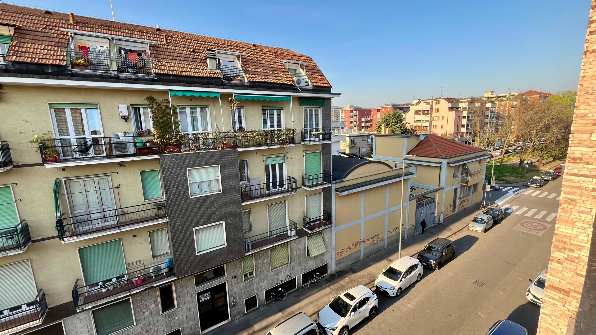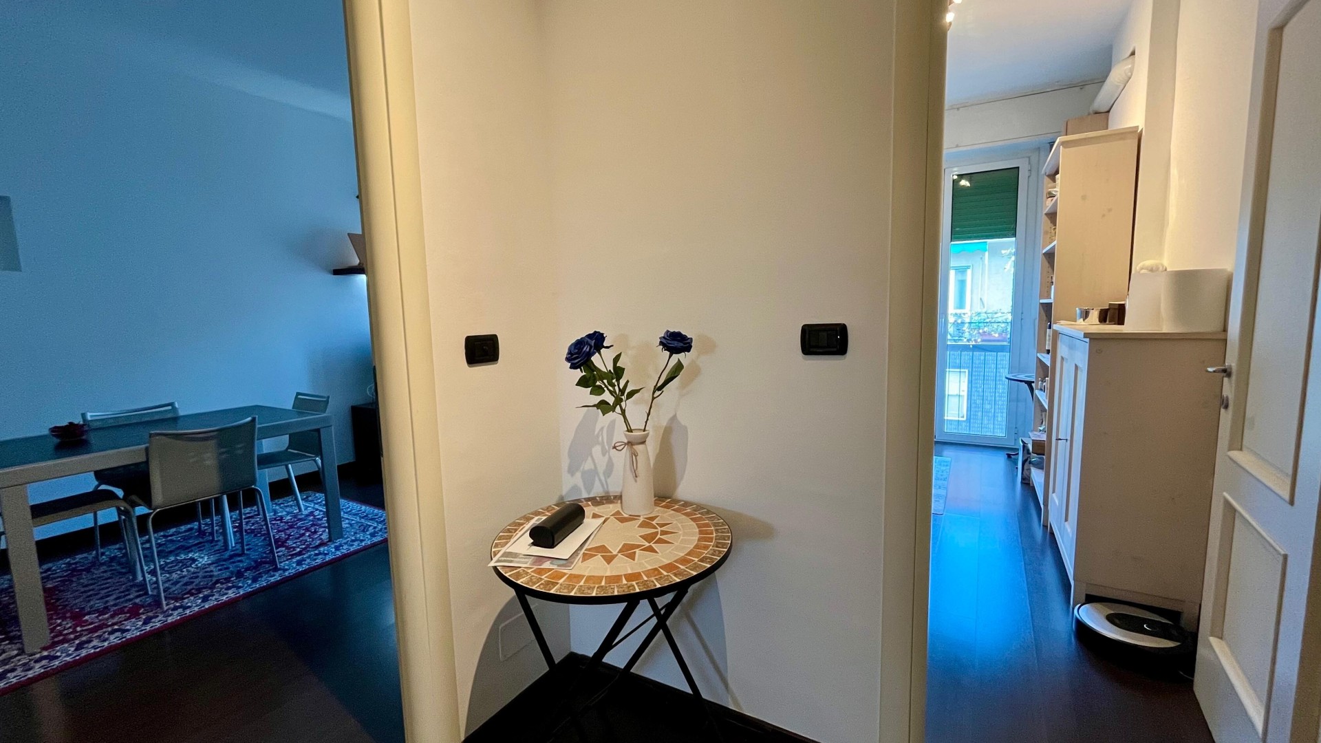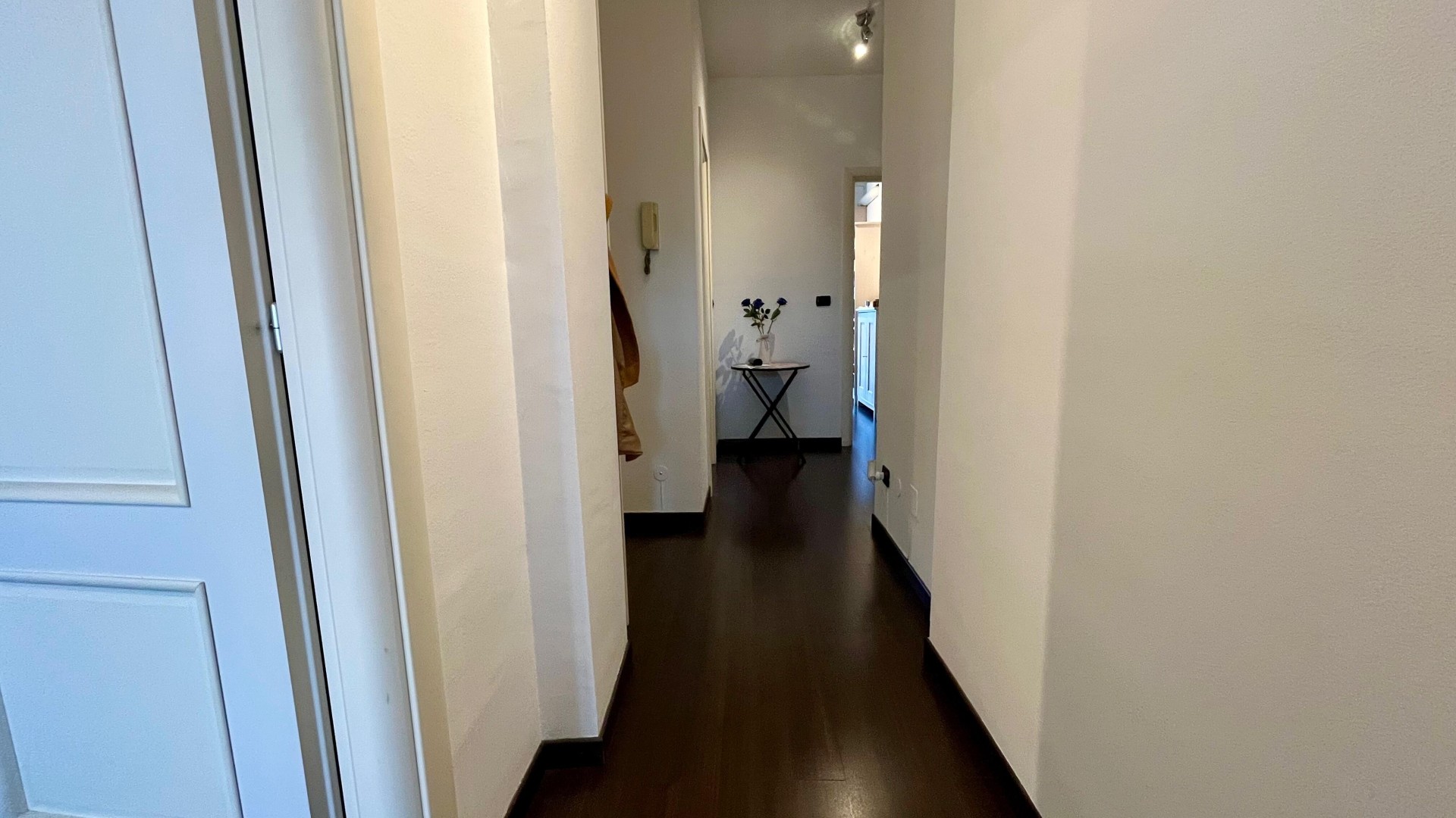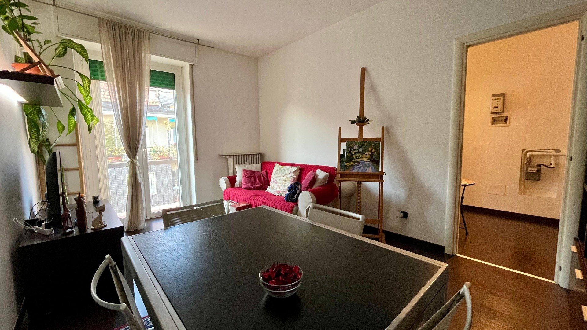 L’appartamento si apre su un ingresso con corridoio che collega in modo funzionale la zona giorno alla zona notte. La zona giorno è composta da un disimpegno che conduce a un ampio e luminoso soggiorno, arricchito da un piccolo balcone con affaccio esterno, e da una cucina abitabile, anch’essa molto luminosa grazie alla porta finestra. La zona notte è caratterizzata da una camera da letto di generose dimensioni, con accesso a un secondo balcone con affaccio interno. Completa la proprietà un ampio bagno finestrato, dotato di sanitari e vasca.