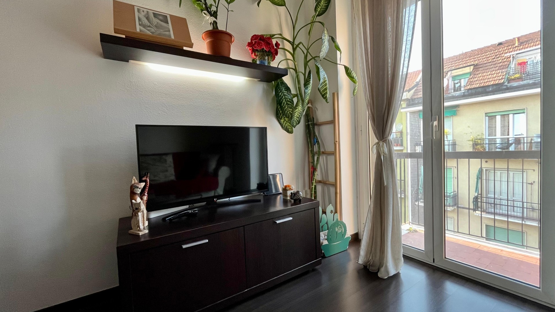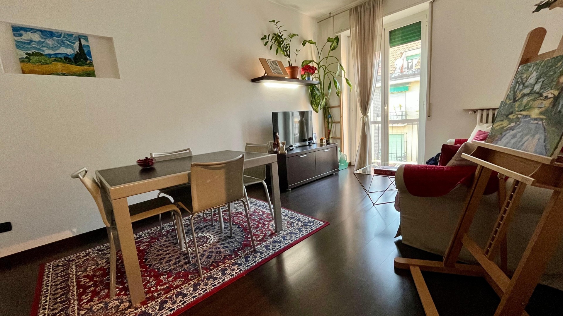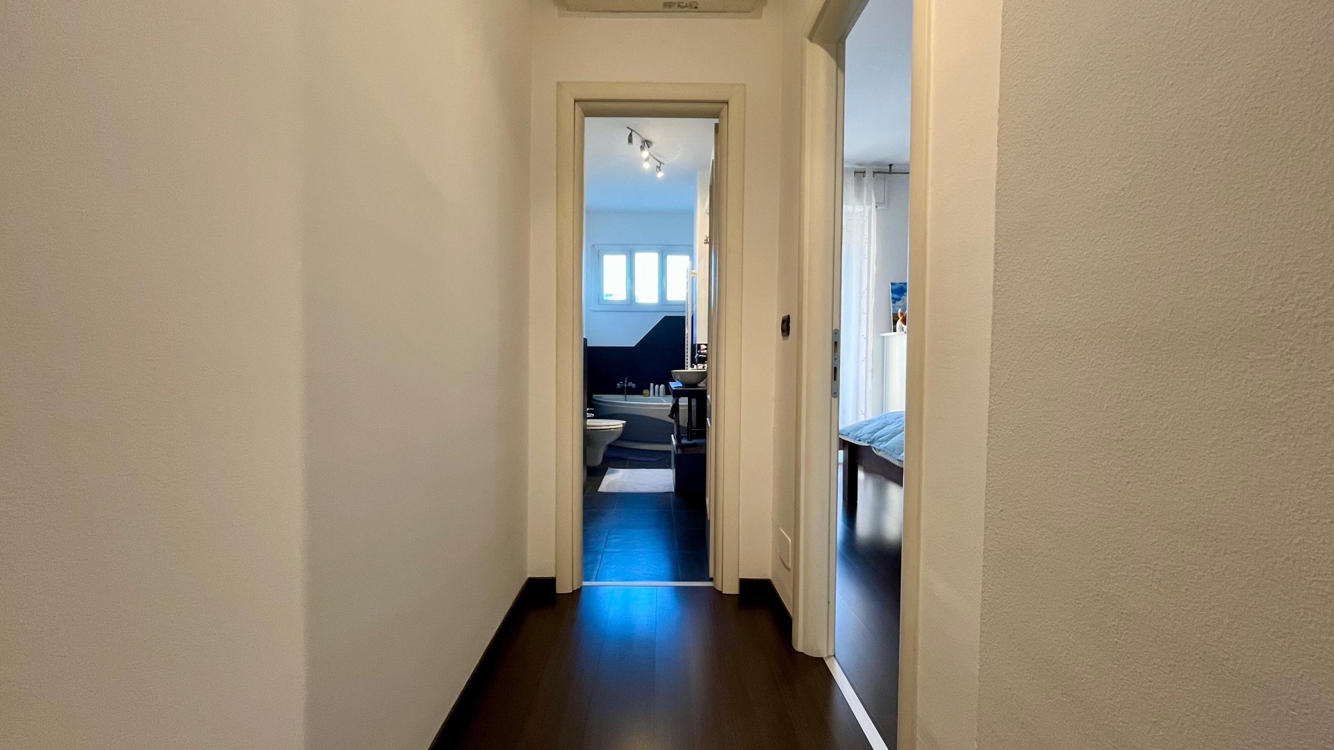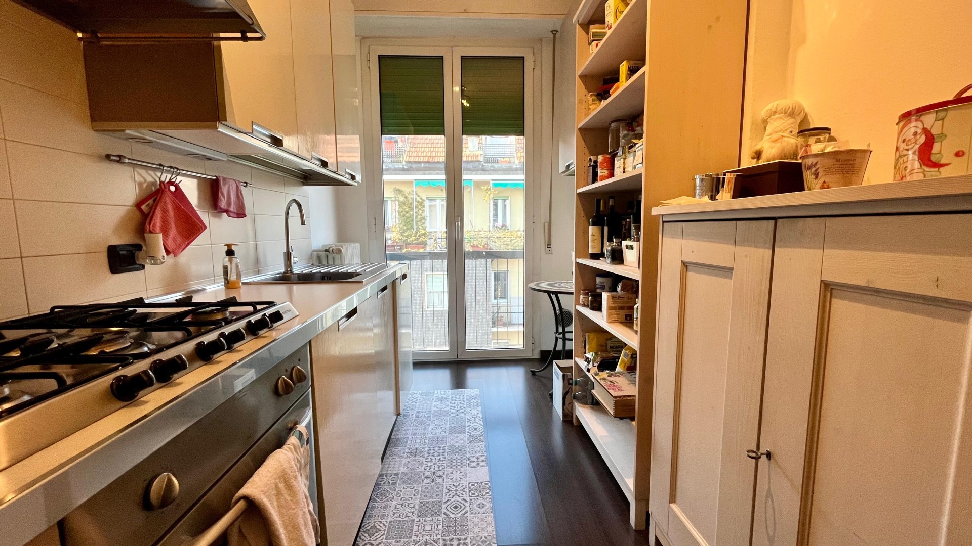 L’appartamento si apre su un ingresso con corridoio che collega in modo funzionale la zona giorno alla zona notte. La zona giorno è composta da un disimpegno che conduce a un ampio e luminoso soggiorno, arricchito da un piccolo balcone con affaccio esterno, e da una cucina abitabile, anch’essa molto luminosa grazie alla porta finestra. La zona notte è caratterizzata da una camera da letto di generose dimensioni, con accesso a un secondo balcone con affaccio interno. Completa la proprietà un ampio bagno finestrato, dotato di sanitari e vasca.