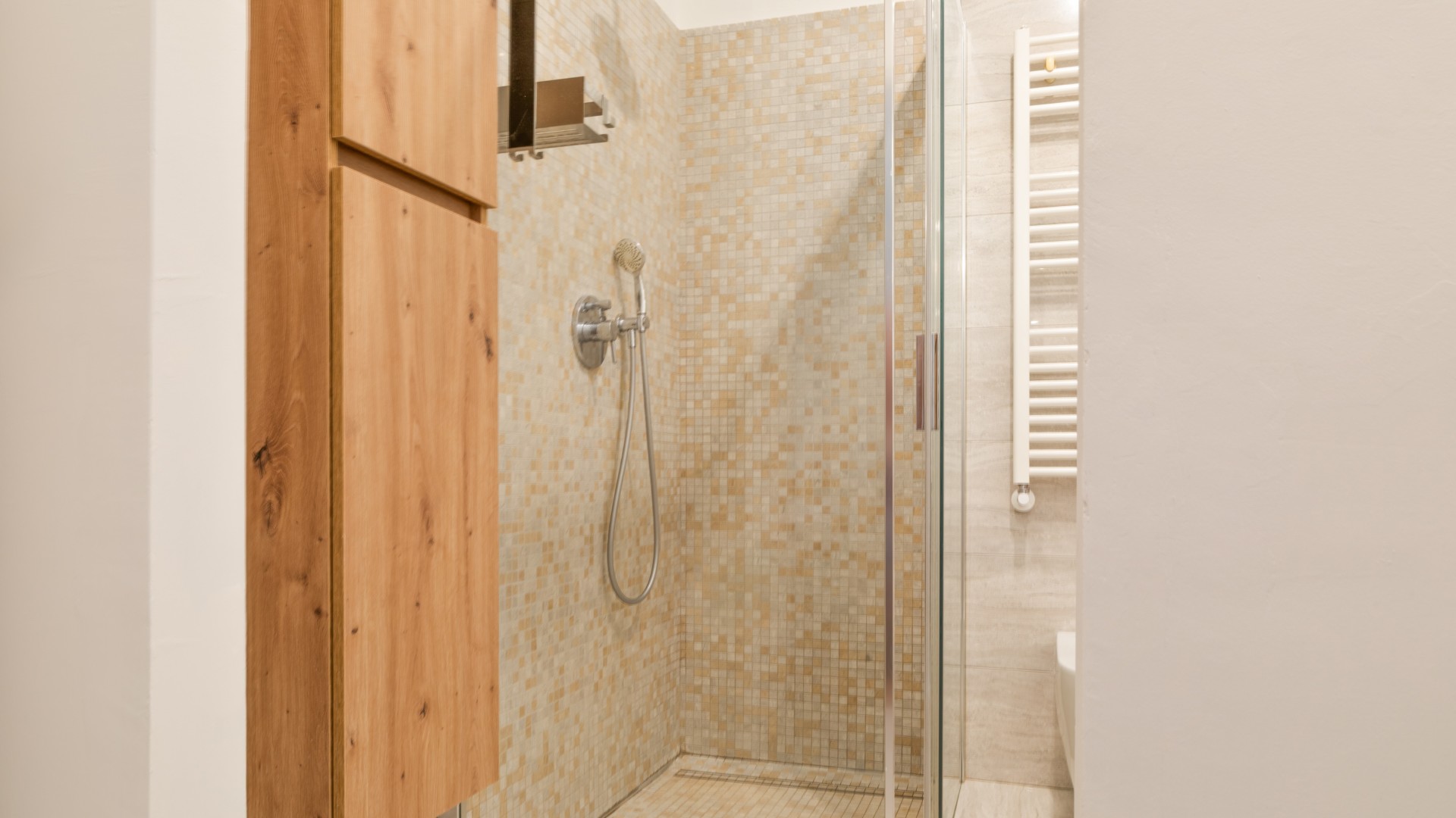 L'appartamento è stato rifinito con materiali di pregio, tra cui una calda pavimentazione in parquet di rovere in tutti gli ambienti. La disposizione degli spazi è funzionale e moderna:
