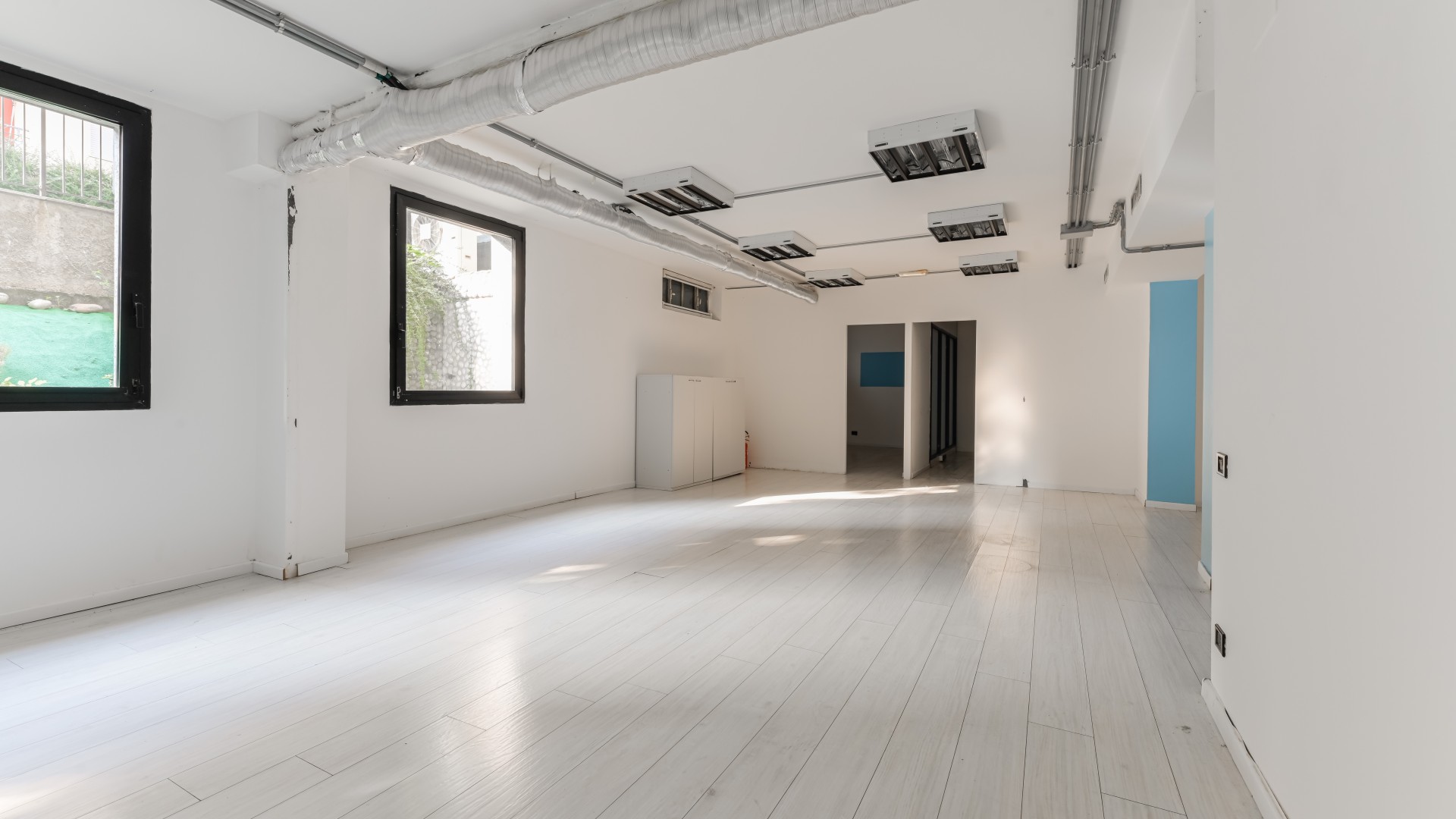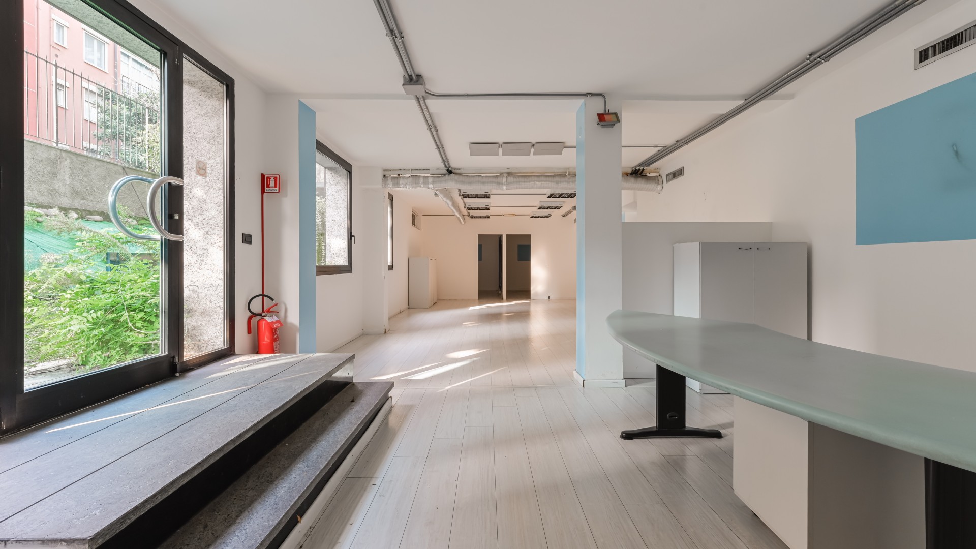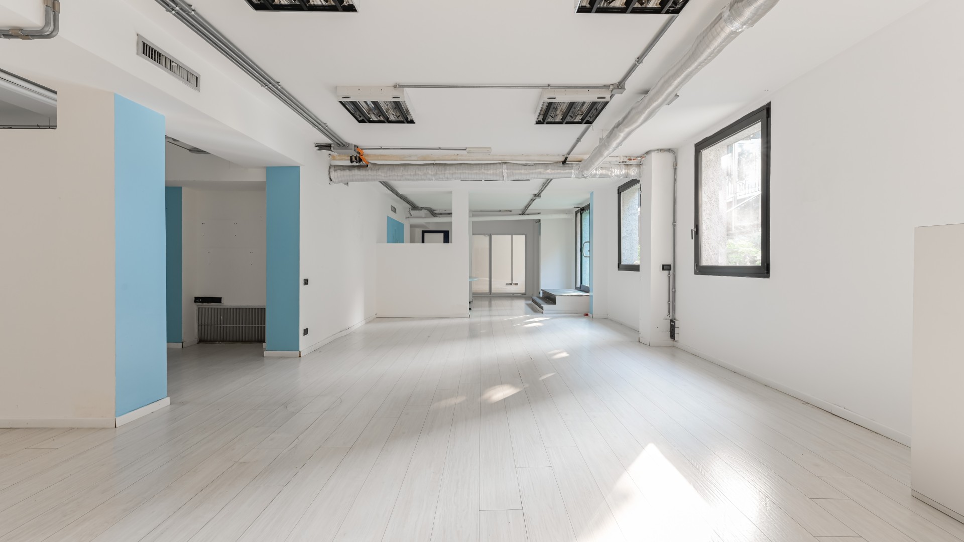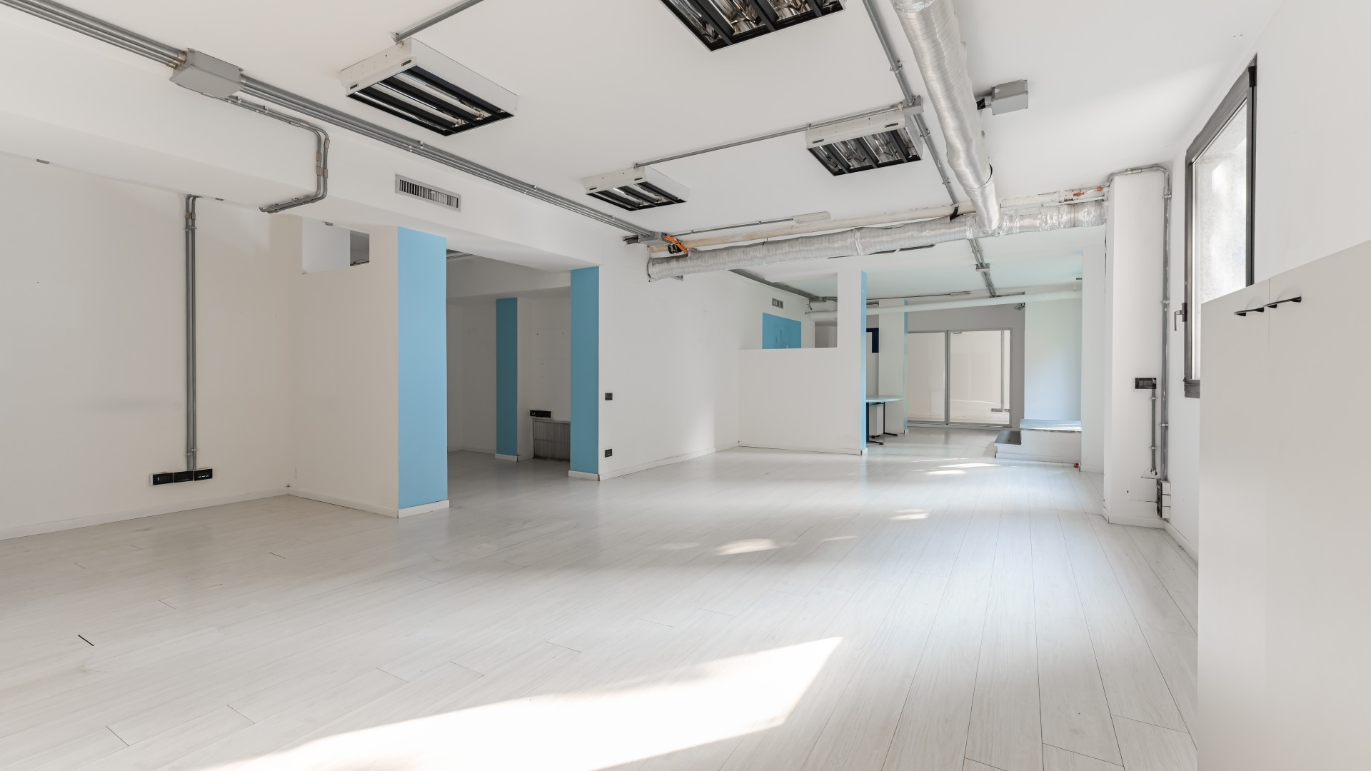 L’ufficio si sviluppa con spazi ampi e ben distribuiti, caratterizzati da una configurazione prevalentemente open space e da una forte luminosità, grazie alla presenza di numerose finestre. All’ingresso, sulla sinistra, si apre una grande zona multifunzionale, adatta a ospitare postazioni operative, un archivio o una sala riunioni, accompagnata da un pratico ripostiglio. Sulla destra, un corridoio conduce ad altri ambienti e al bagno finestrato, con affaccio su via Negroli.