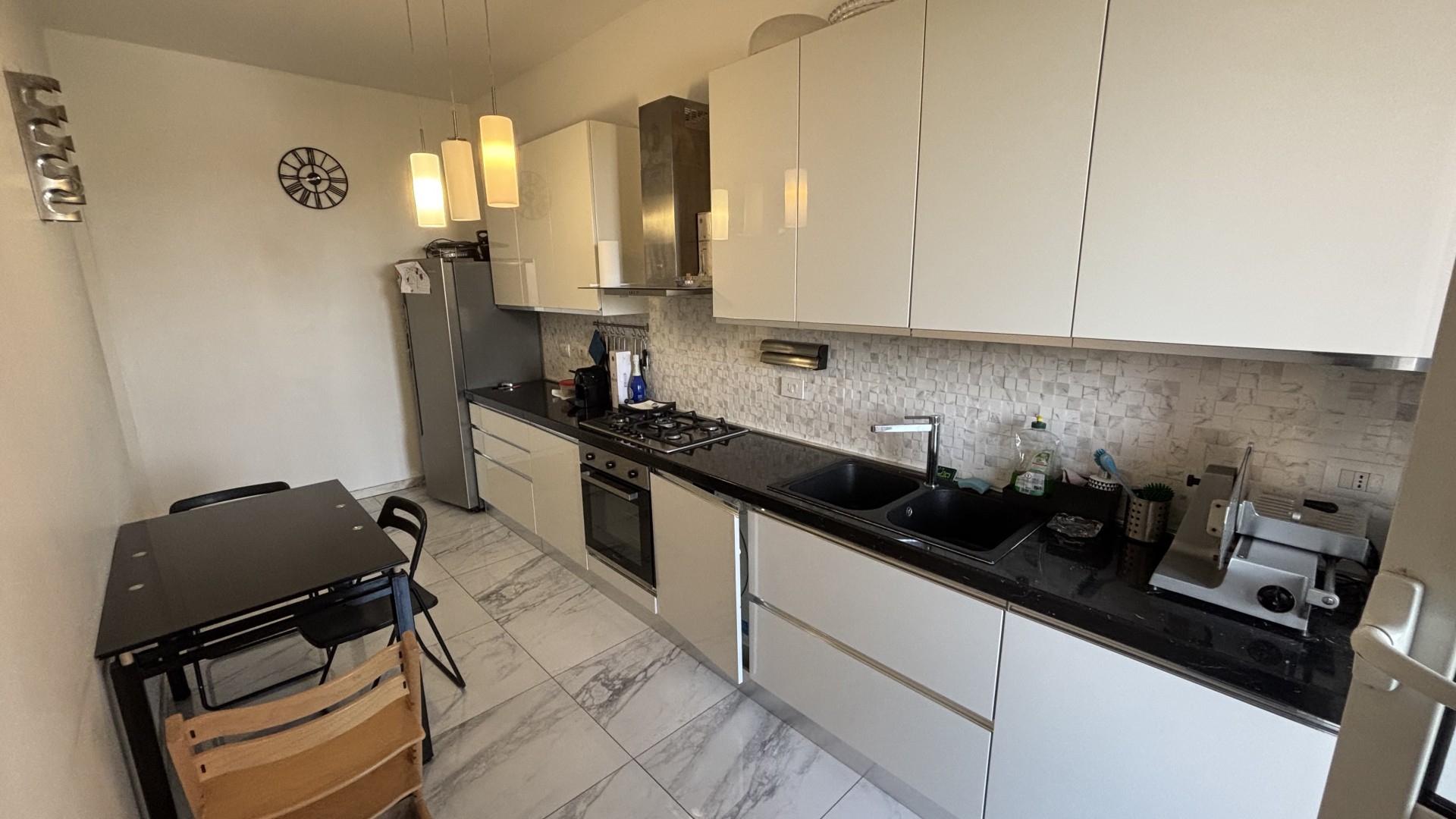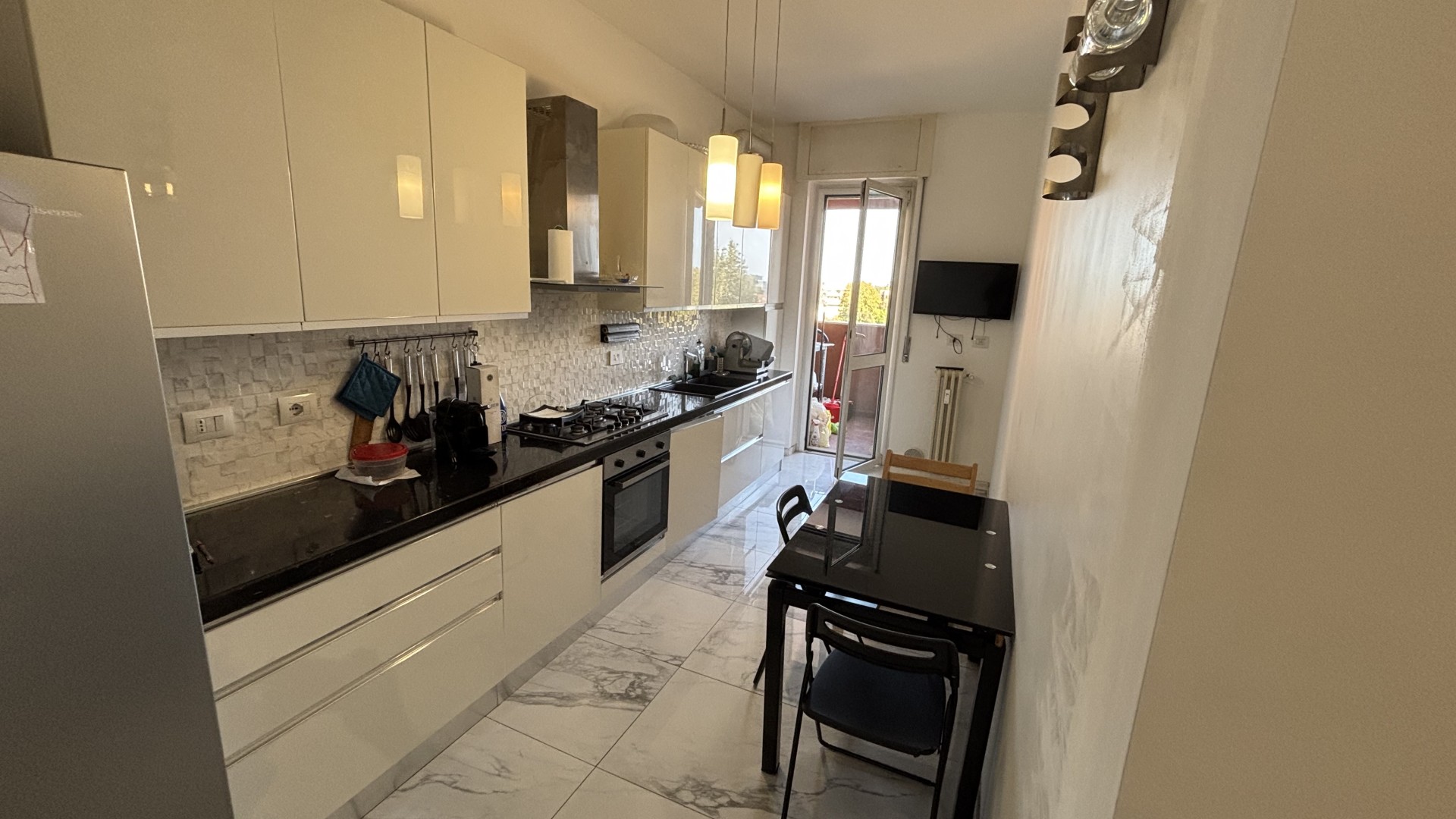 La cucina, semi abitabile, è moderna, ben organizzata e dotata di tutti i comfort necessari per la vita quotidiana. Anche da qui si accede a un secondo terrazzino, che garantisce ulteriore luce naturale e può essere sfruttato come piccolo spazio aggiuntivo.