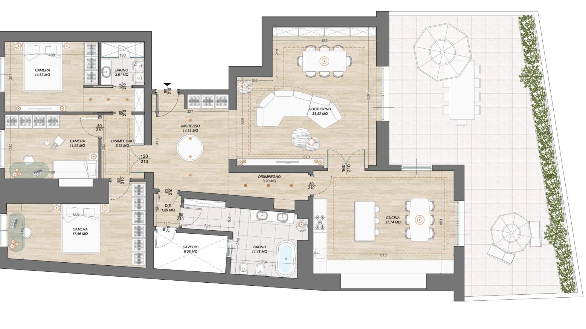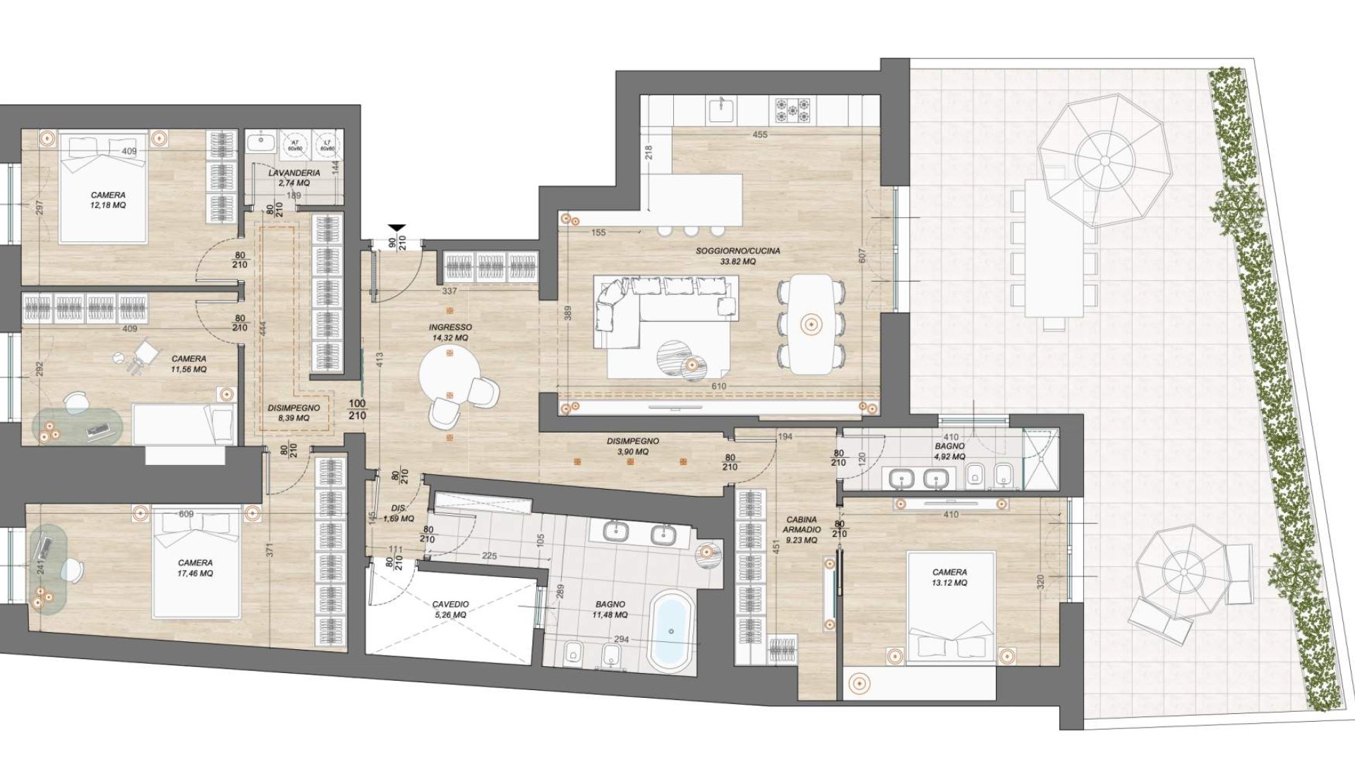Un ulteriore disimpegno conduce alla zona servizi, composta da due bagni comunicanti, entrambi dotati di box doccia, preceduti da un comodo ripostiglio.