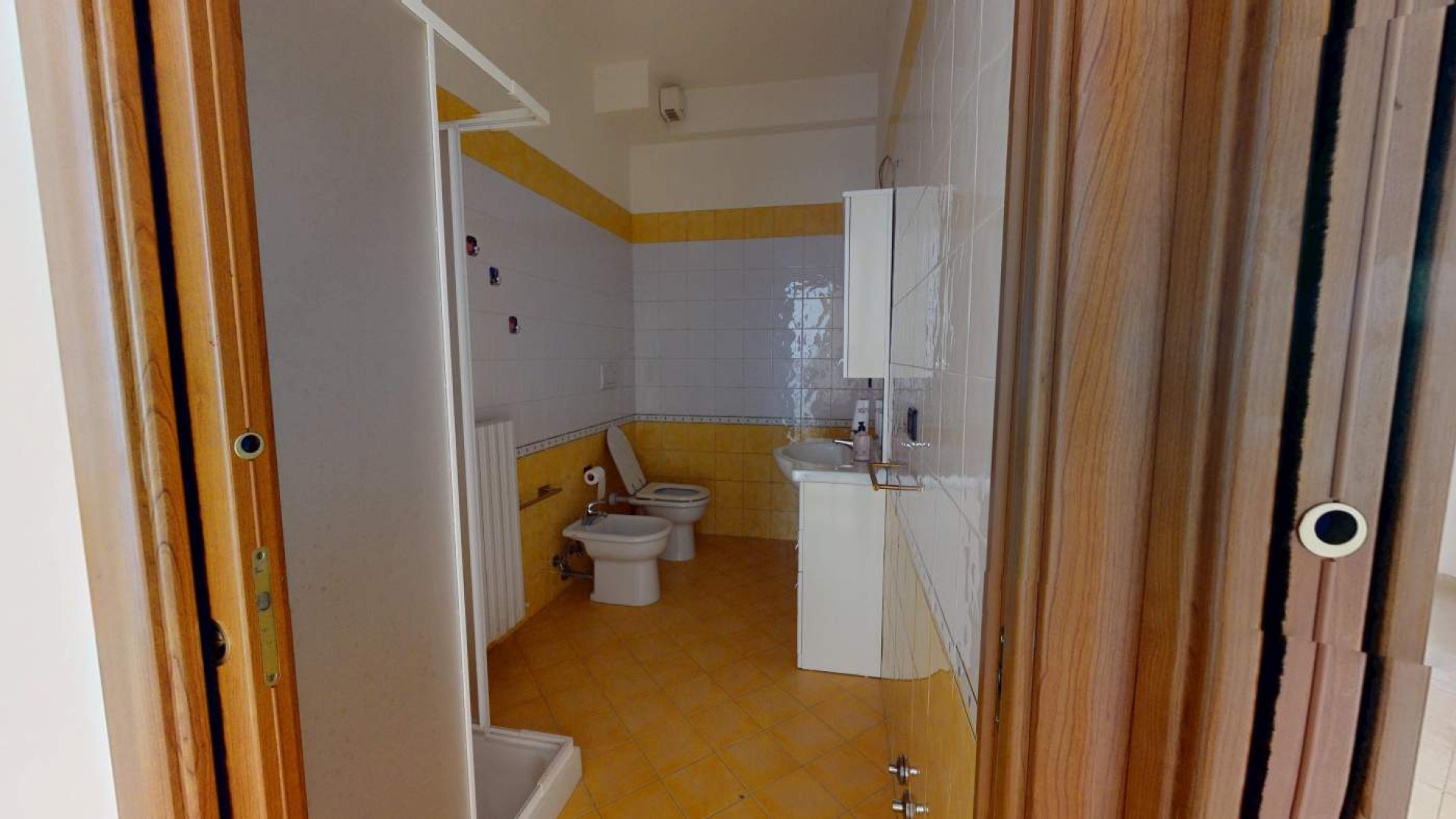 Il bagno, dotato di box doccia e sistema di ventilazione forzata, è funzionale e ben rifinito.