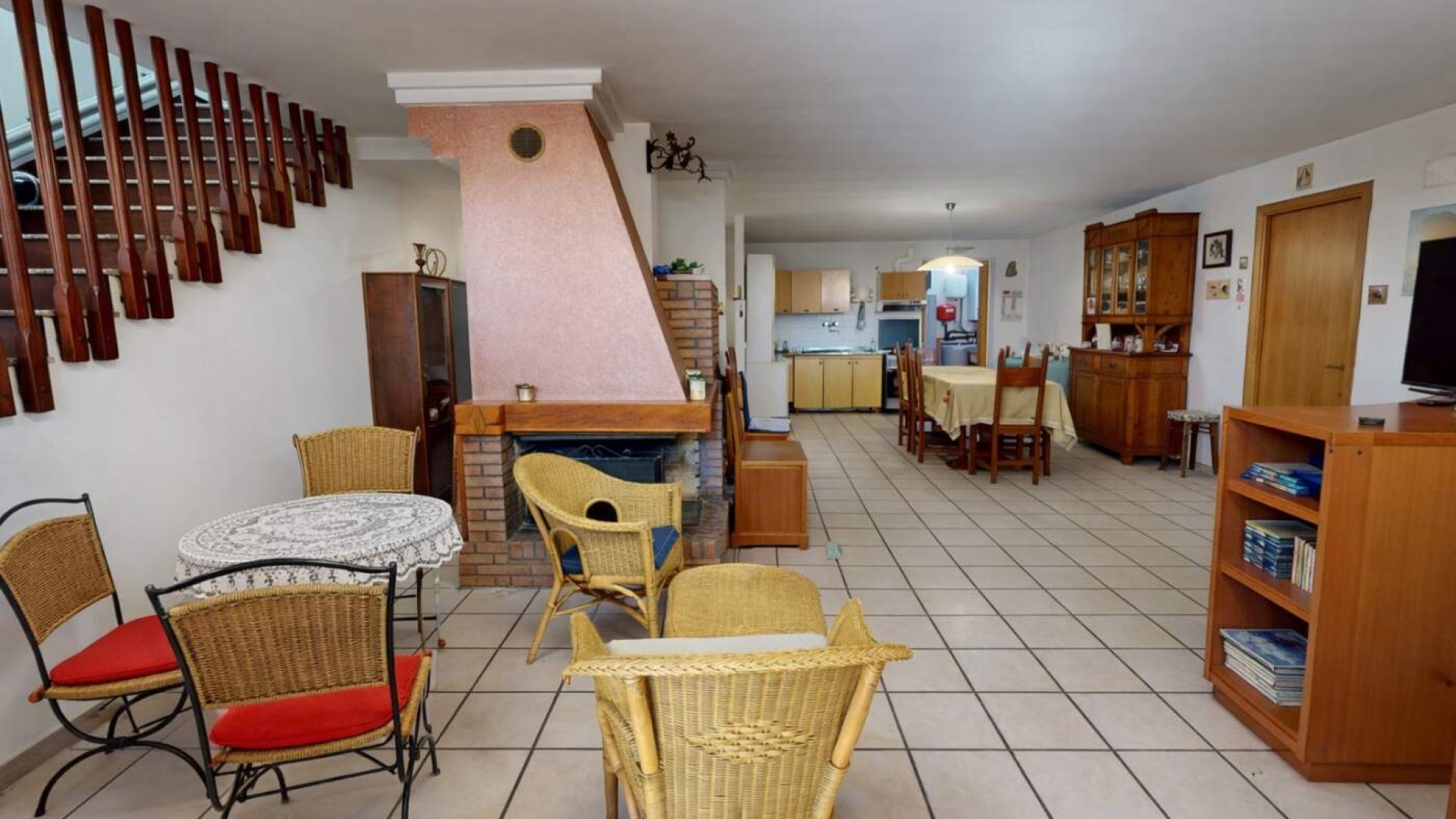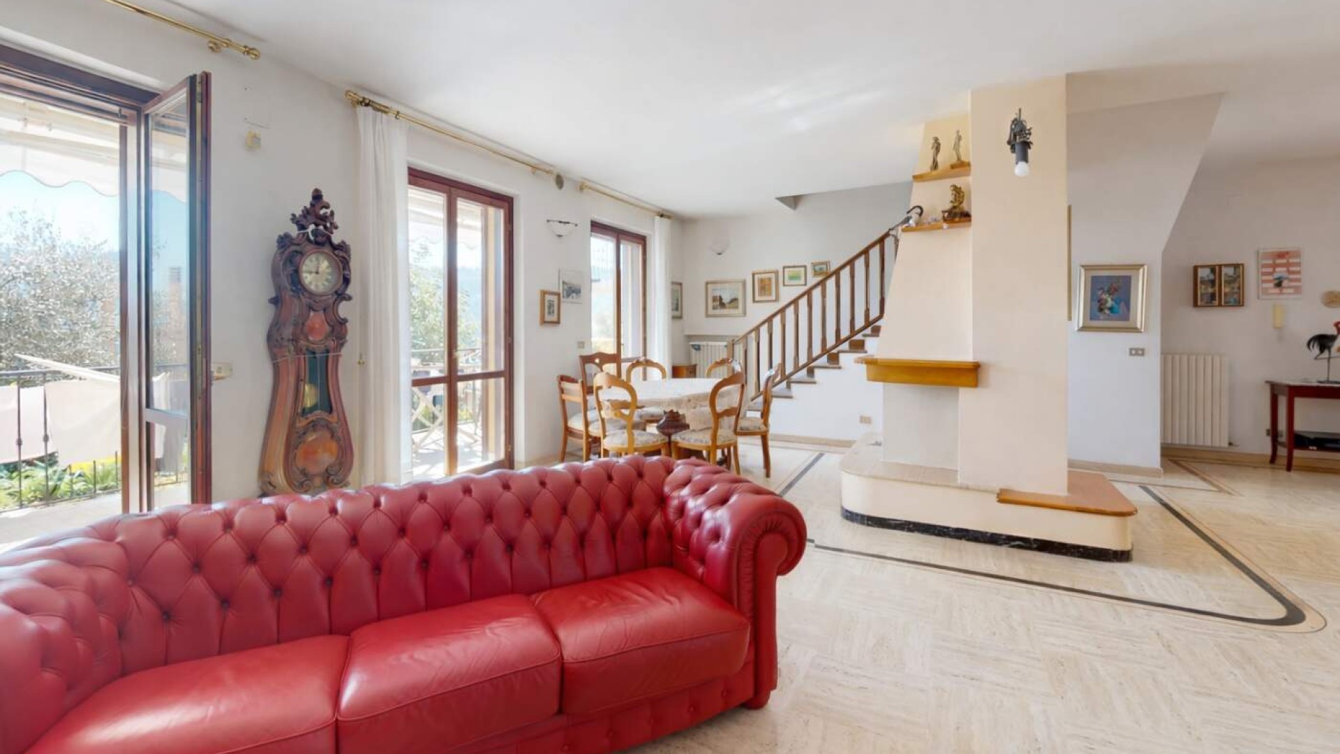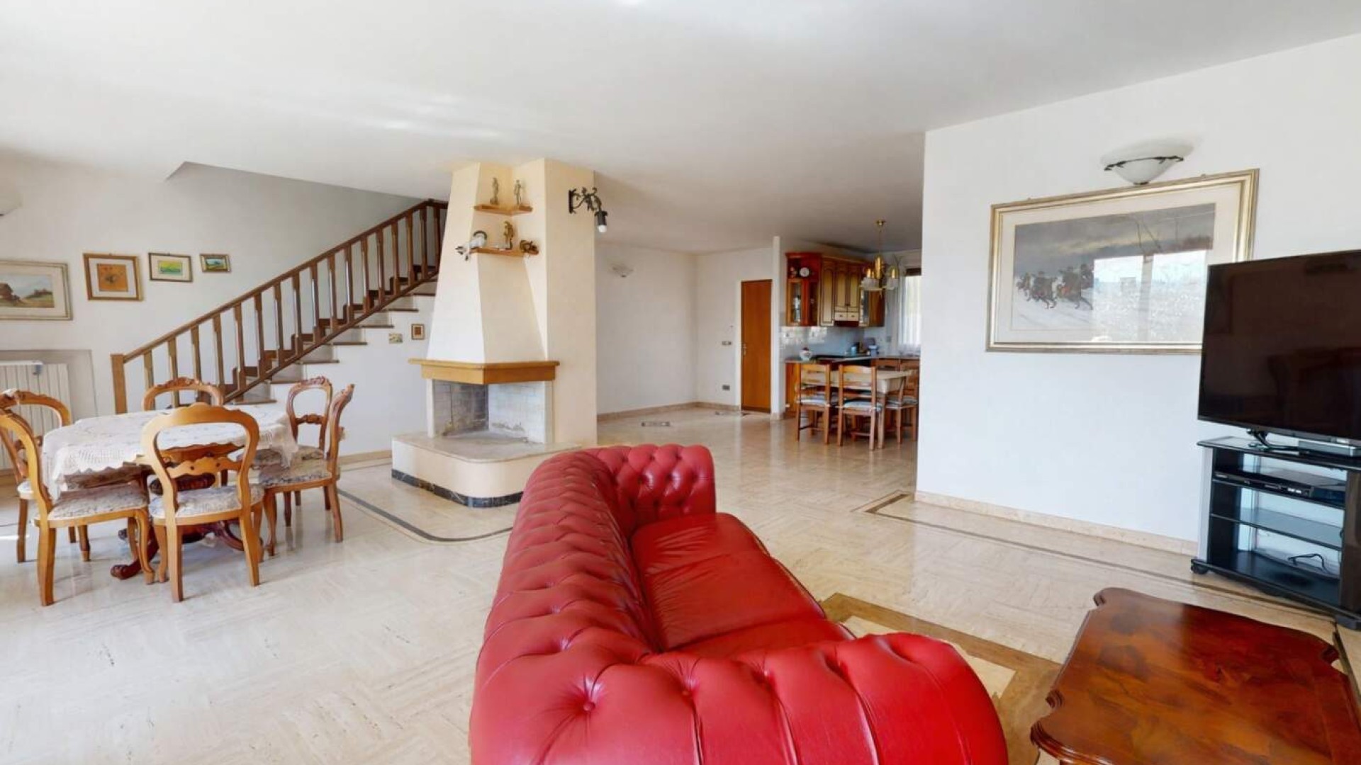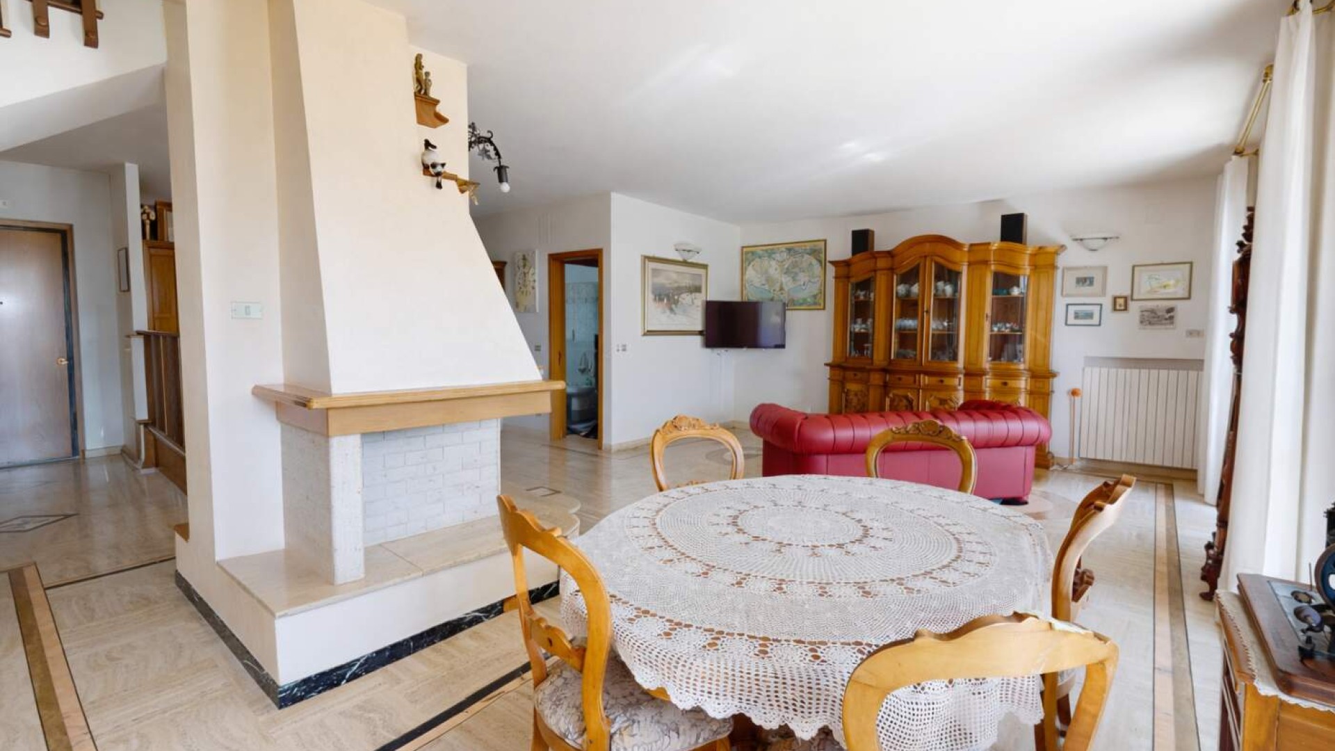 Varcata la soglia si viene accolti da un ampio e luminoso soggiorno, ambiente raffinato impreziosito dal camino, dove gli spazi sono pensati per offrire comfort e convivialità.
