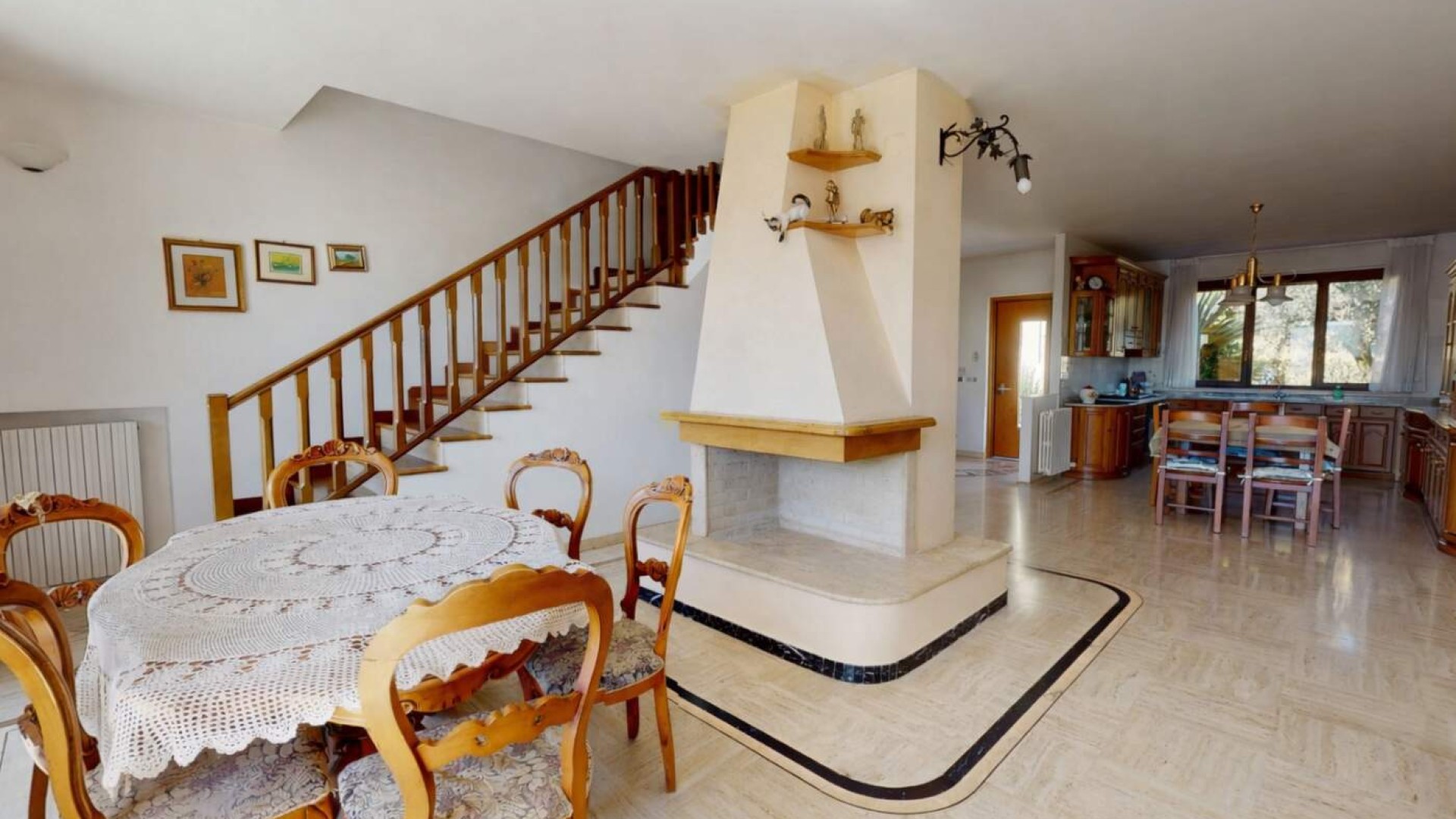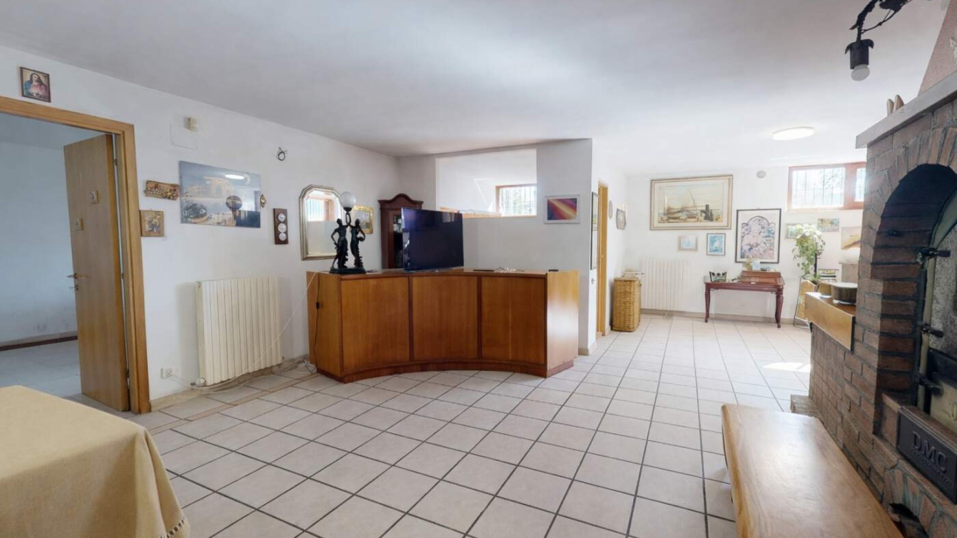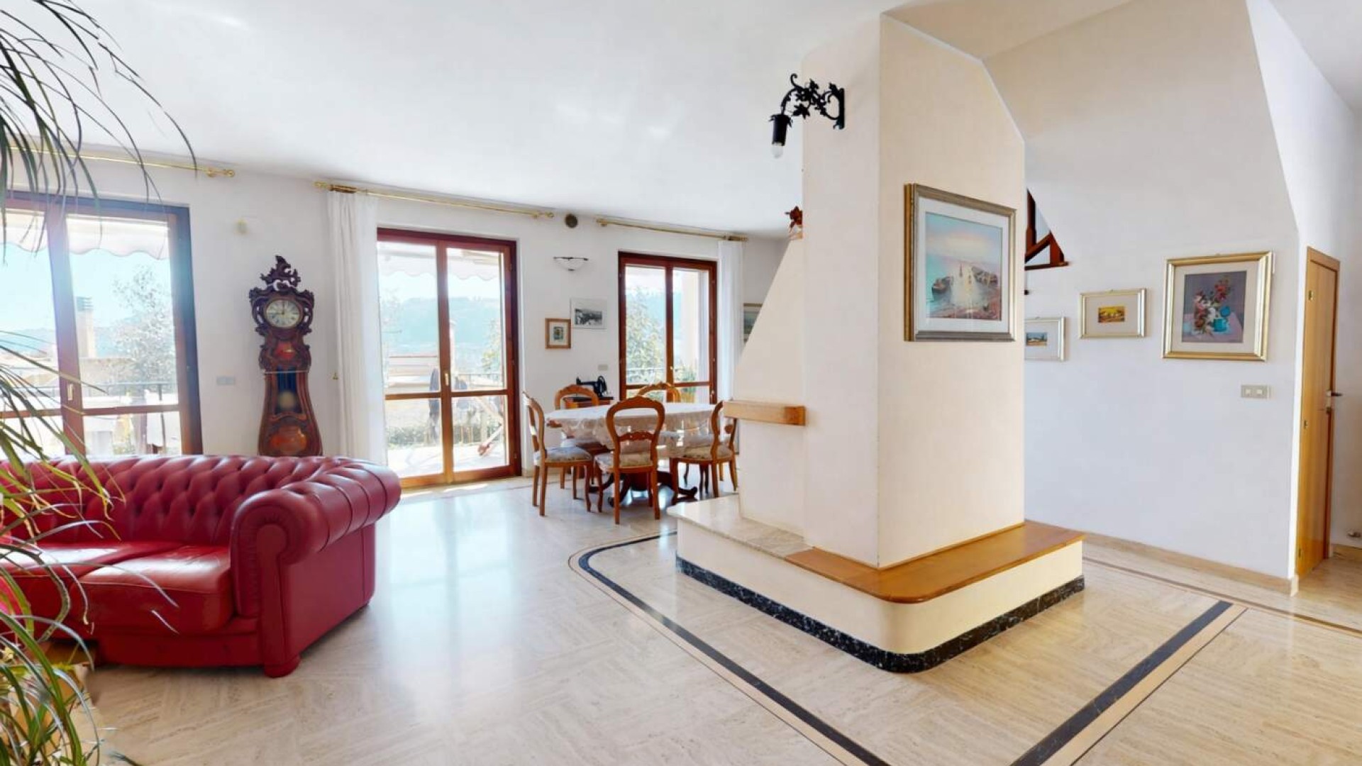Varcata la soglia si viene accolti da un ampio e luminoso soggiorno, ambiente raffinato impreziosito dal camino, dove gli spazi sono pensati per offrire comfort e convivialità.