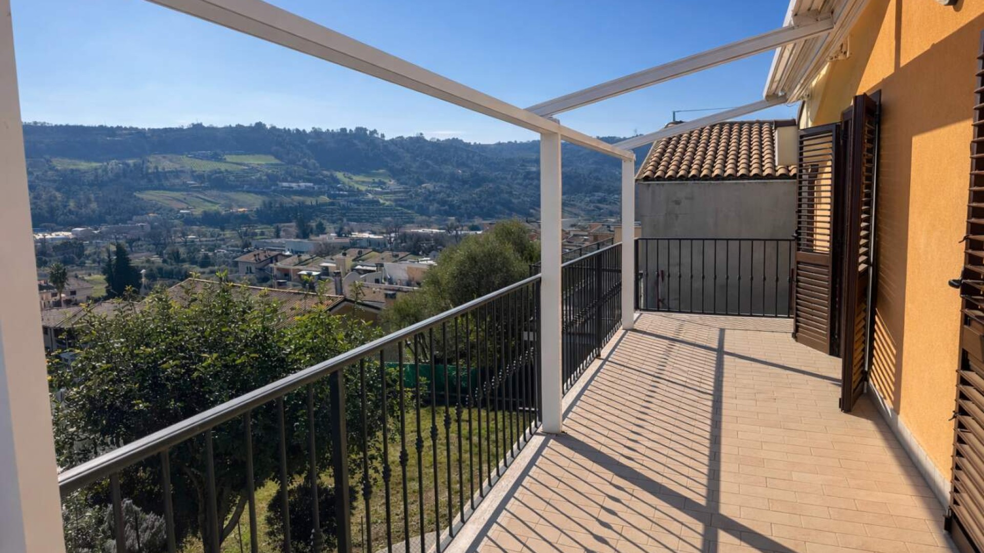 Uno dei terrazzi, impreziosito da una suggestiva Pergo tenda, regala una splendida vista mare e monti, uno scenario unico da vivere ogni giorno.