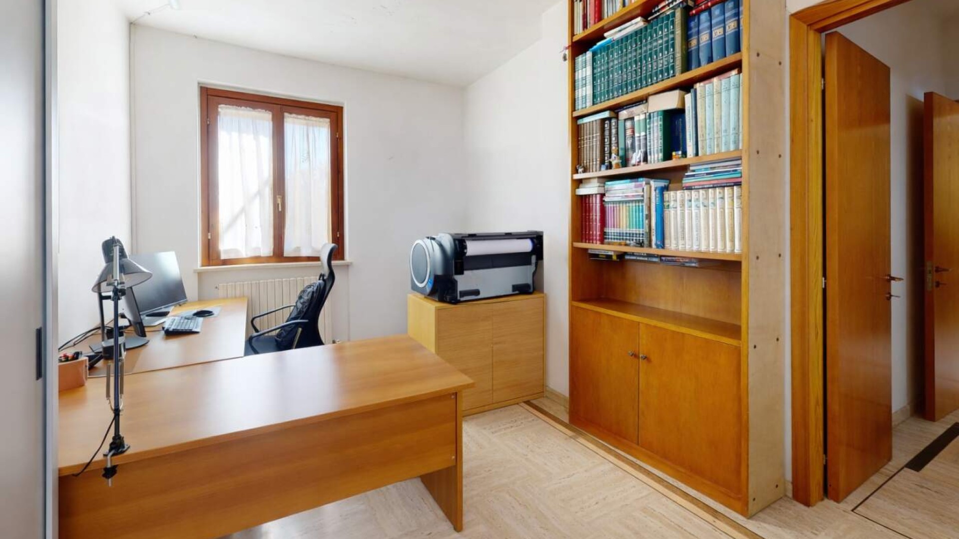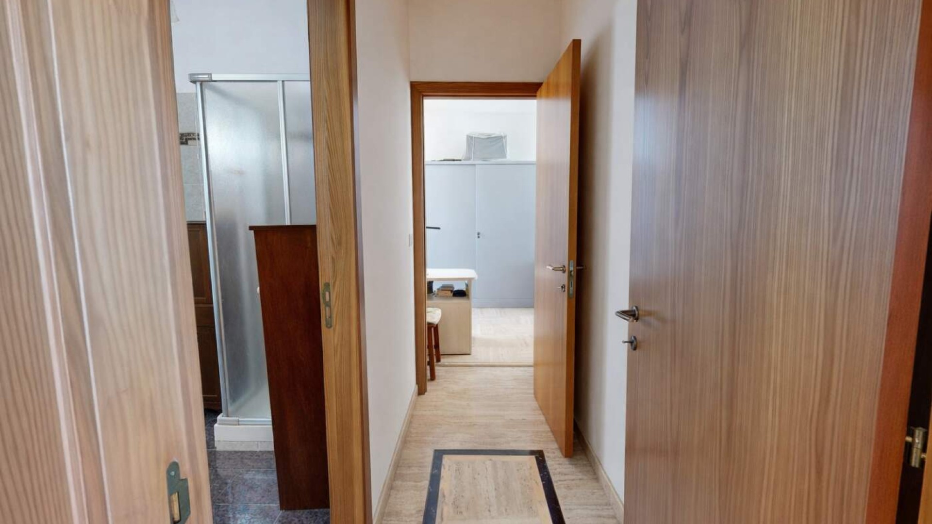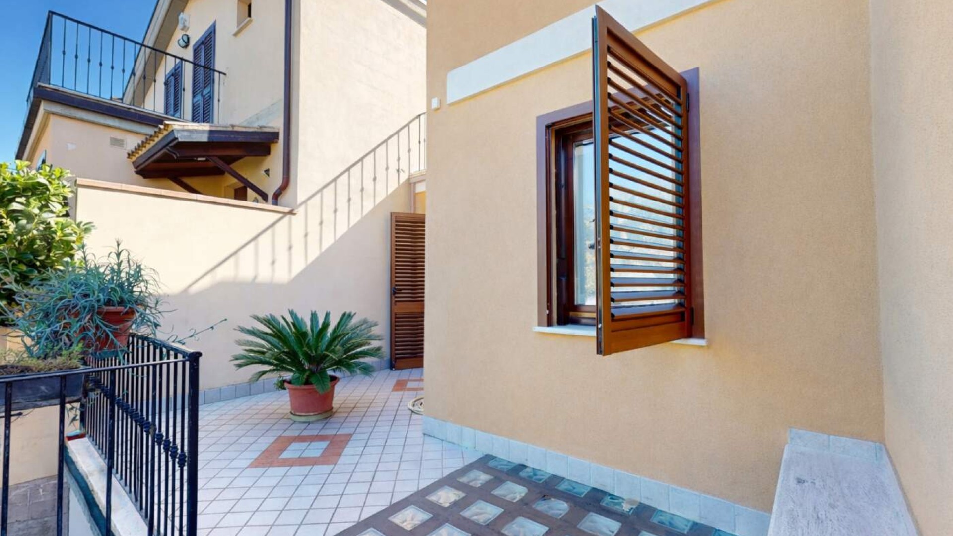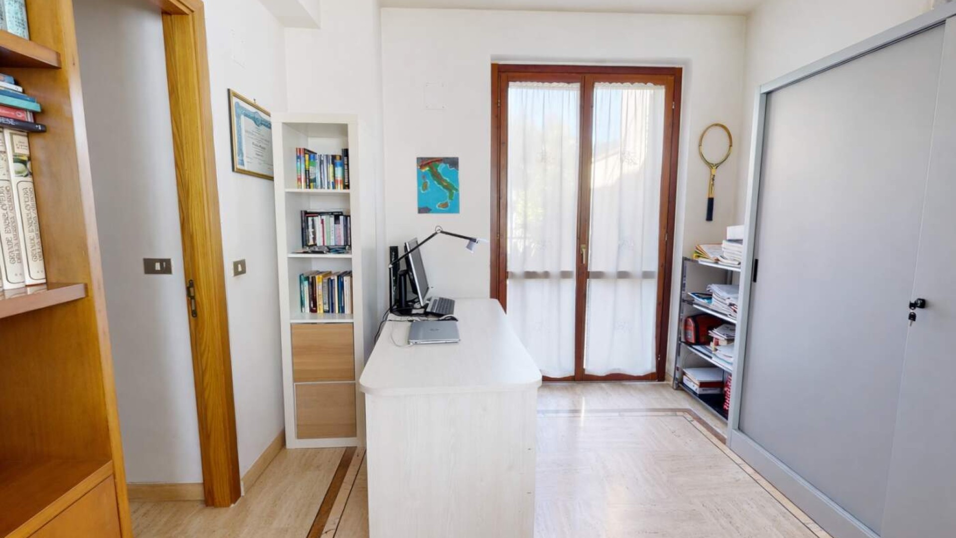 Sullo stesso livello trovano spazio anche uno studio con uscita indipendente sulla corte e un bagno finestrato con box doccia, rendendo il piano funzionale e ben distribuito.