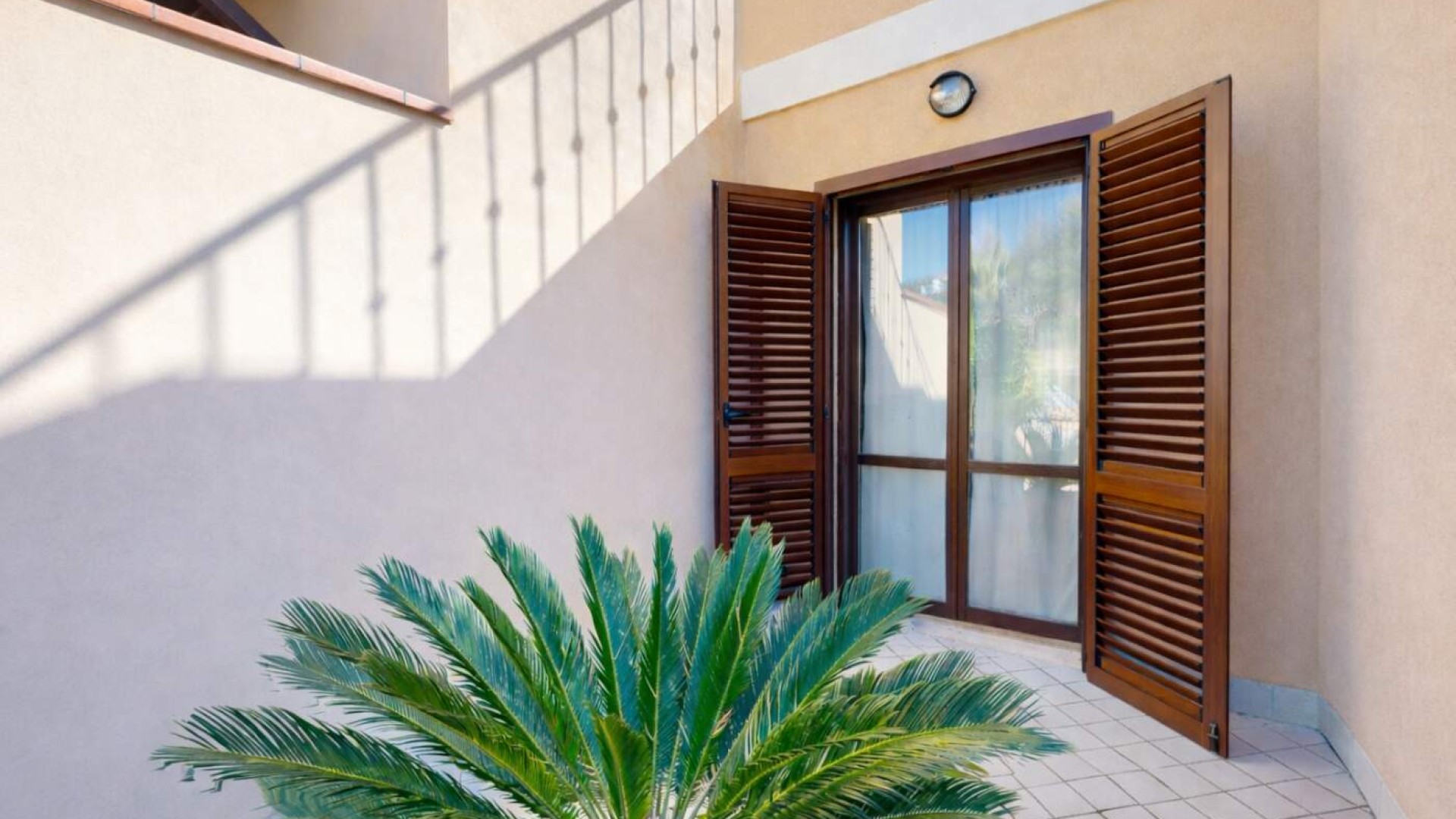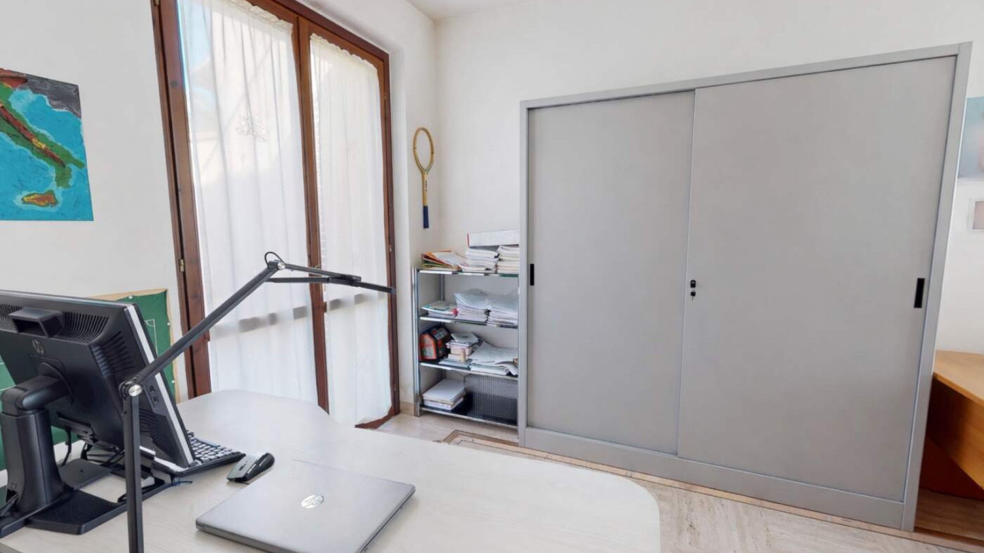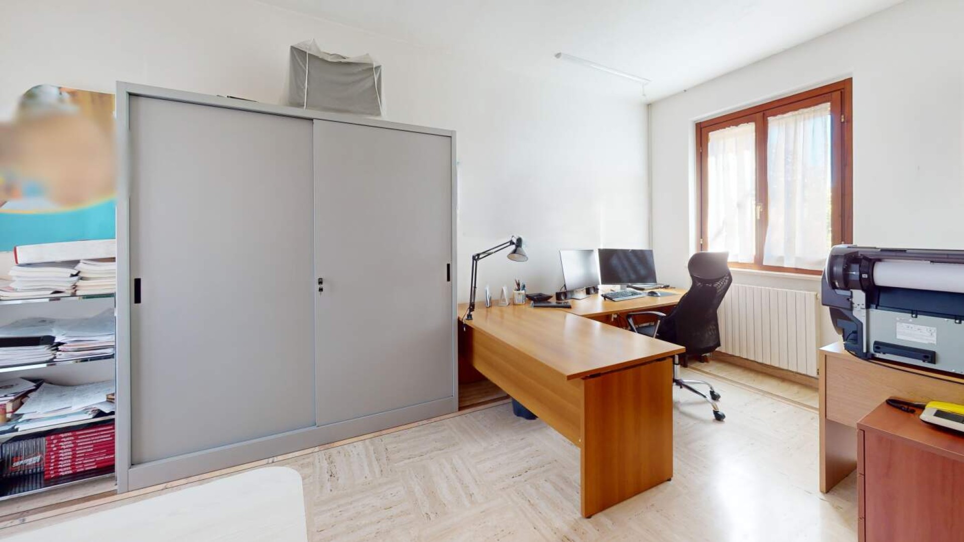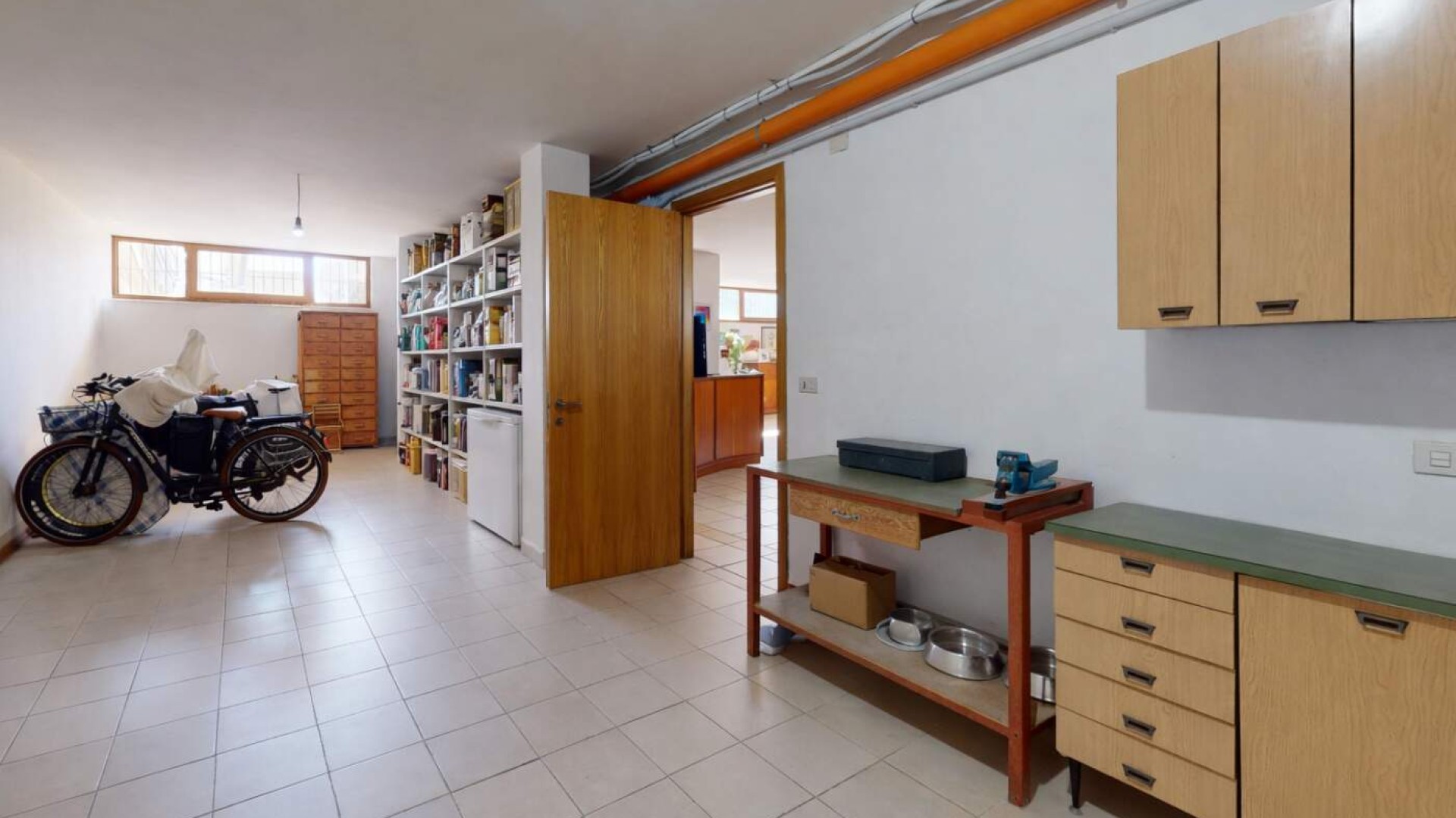 Sullo stesso livello trovano spazio anche uno studio con uscita indipendente sulla corte e un bagno finestrato con box doccia, rendendo il piano funzionale e ben distribuito.