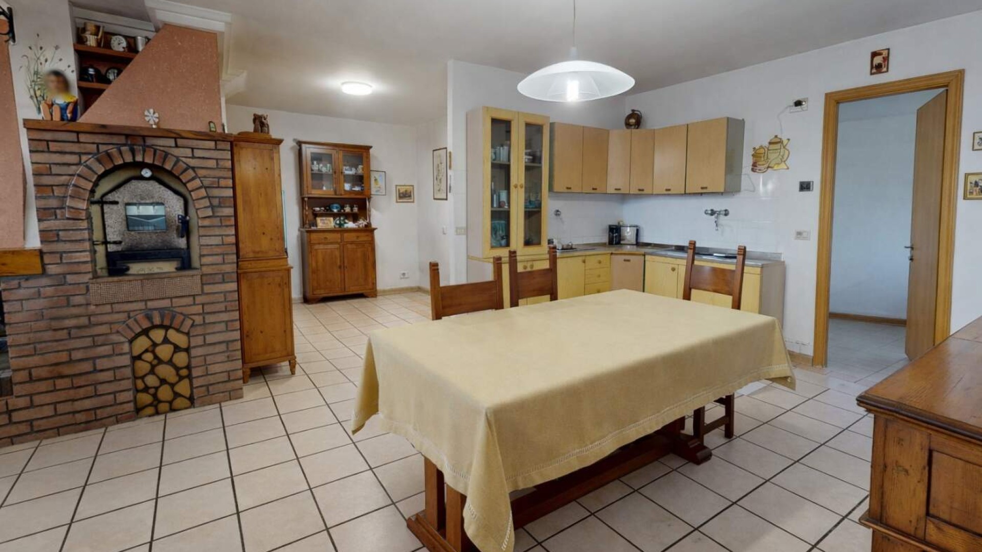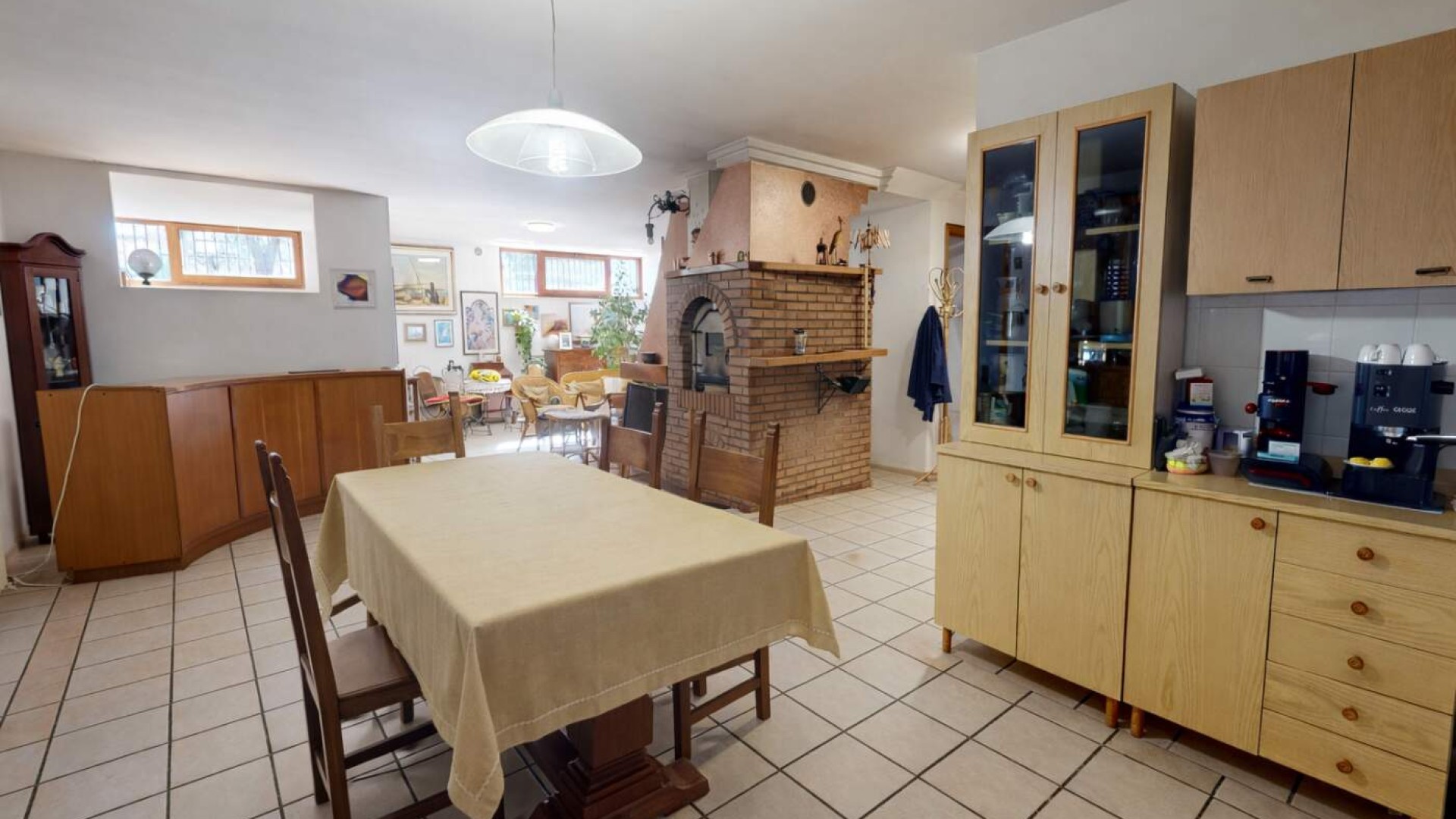 Il piano interrato ospita una straordinaria Taverna di circa 115 mq, collegata internamente tramite una comoda scala dotata di montascale. Questo ambiente rappresenta il cuore conviviale della casa: Un grande salone con camino e forno a legna crea un’atmosfera calda e accogliente, affiancato da una cucina a vista abitabile e da un bagno finestrato con doccia.