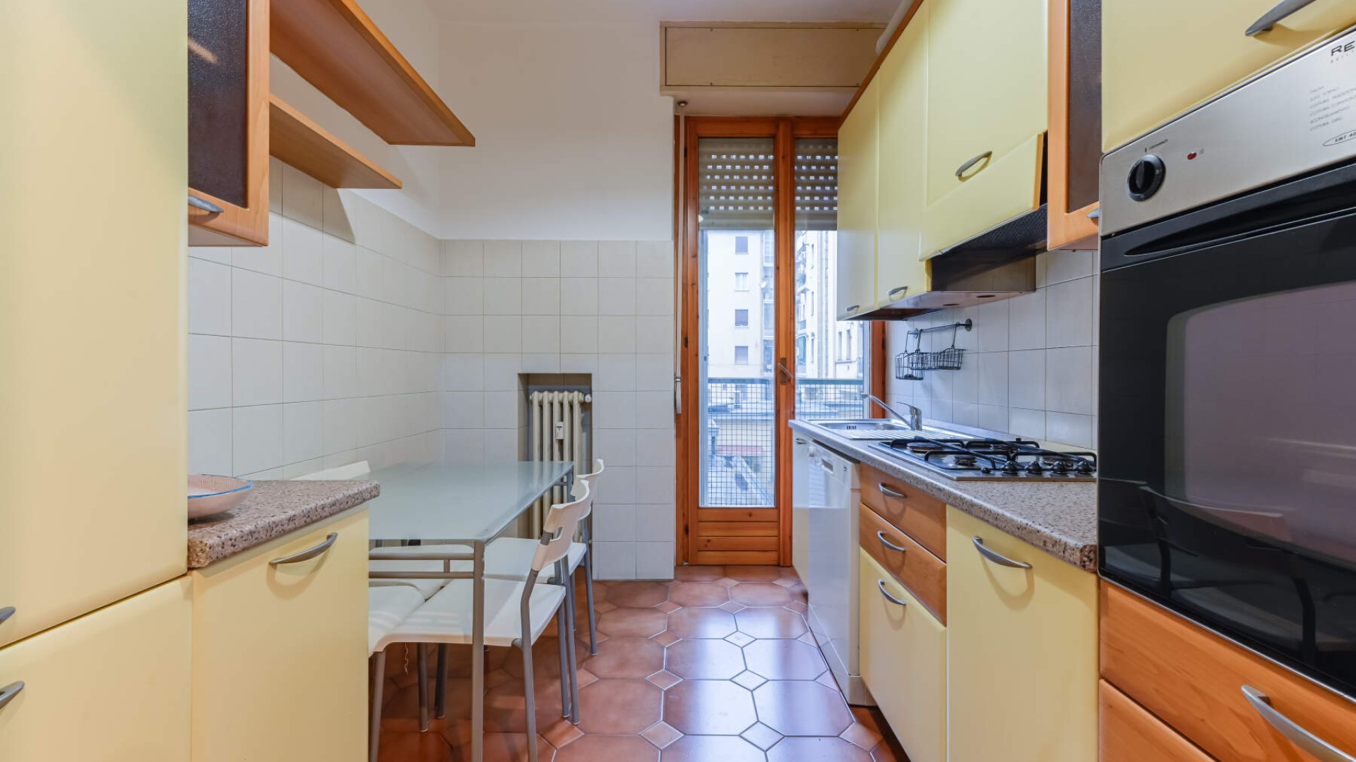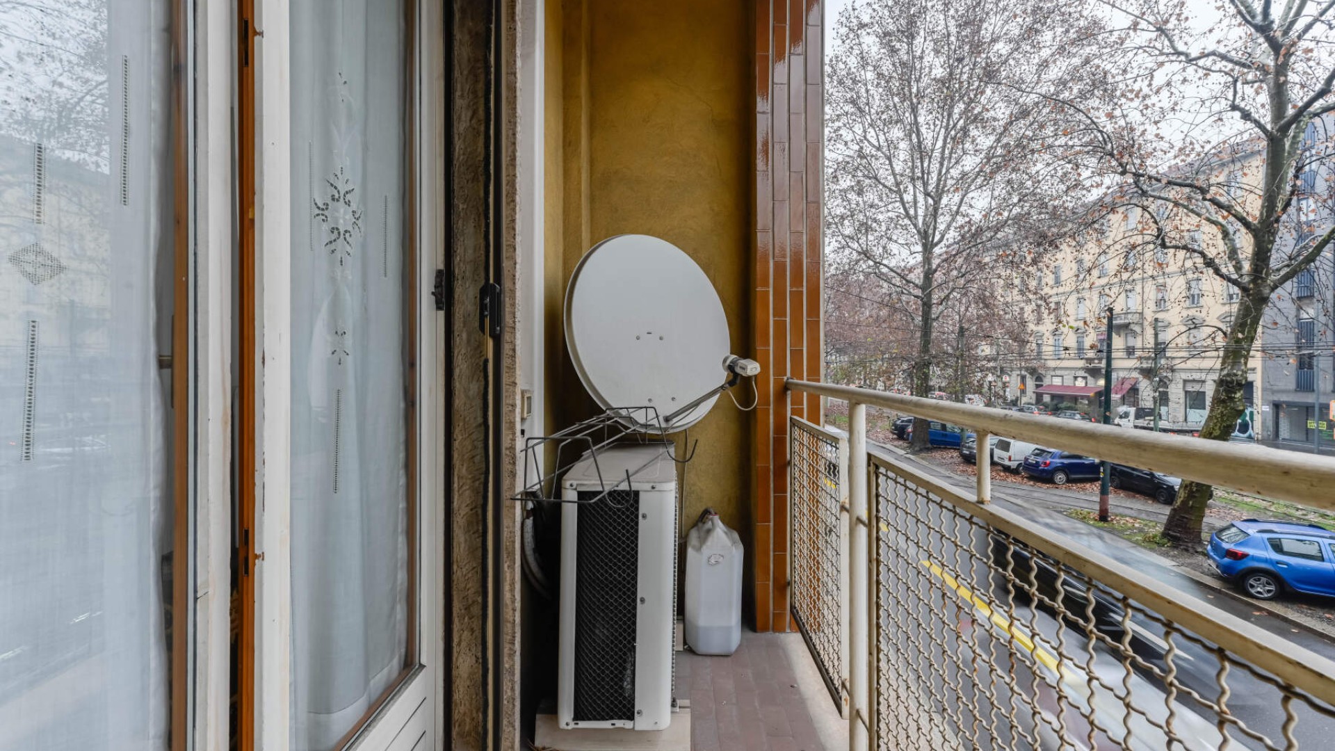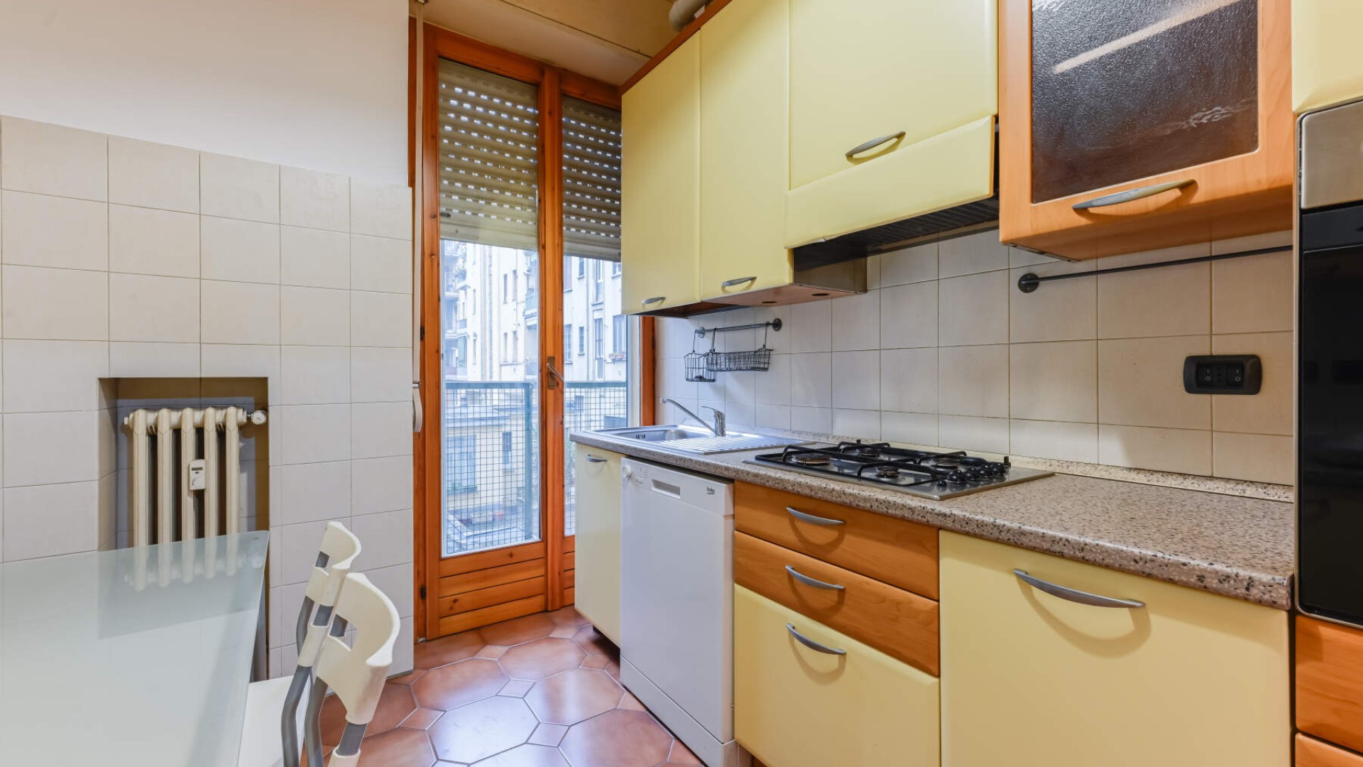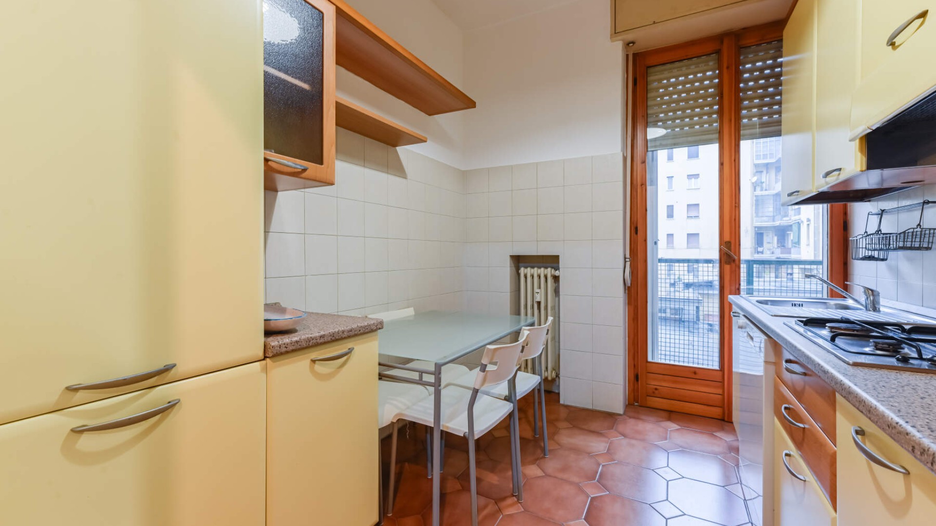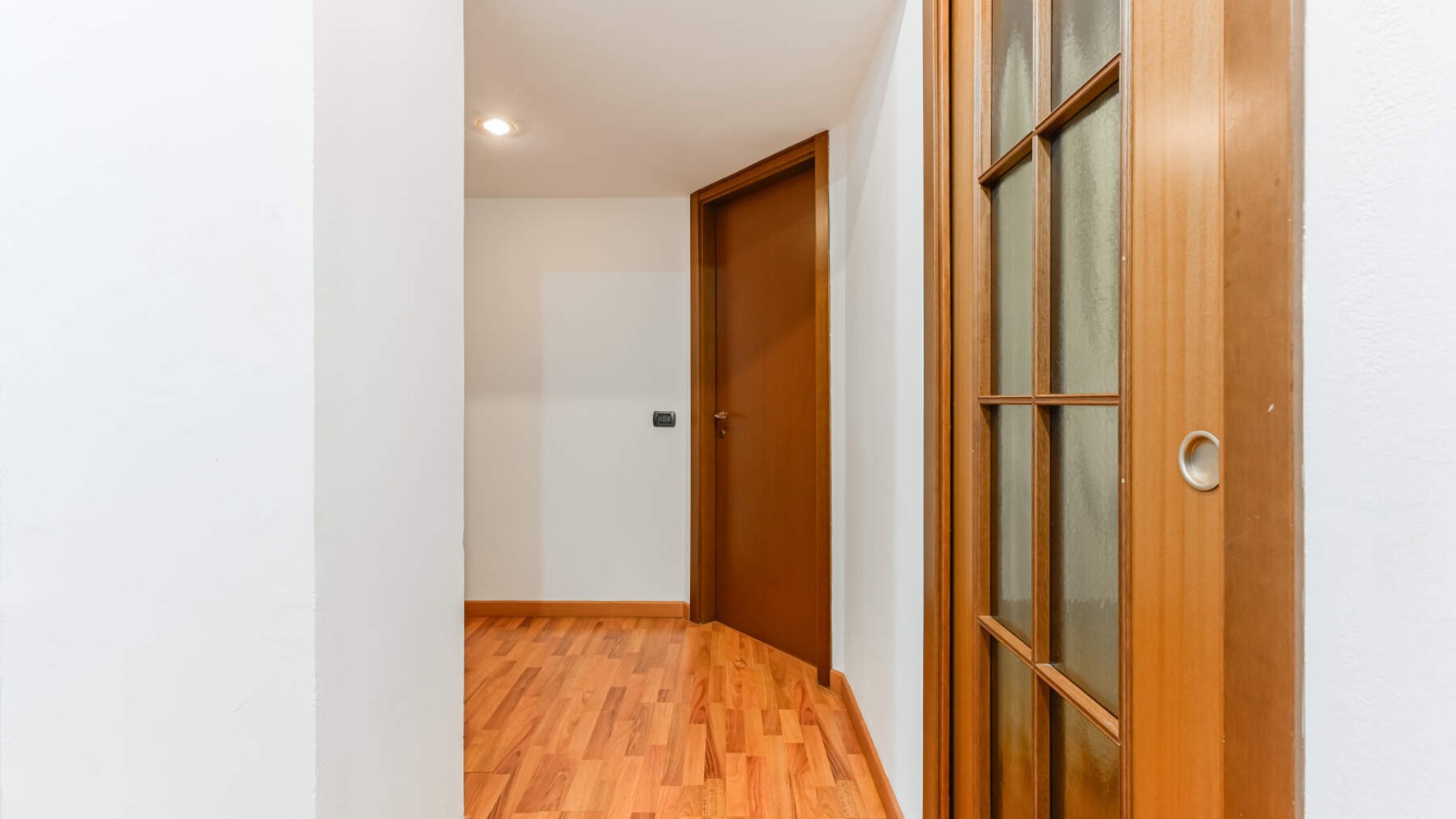 L’ingresso si apre su un ampio soggiorno con parquet e grandi finestre, ideale come zona living e relax. La cucina semiabitabile, separata e funzionale, gode di accesso diretto al balcone.