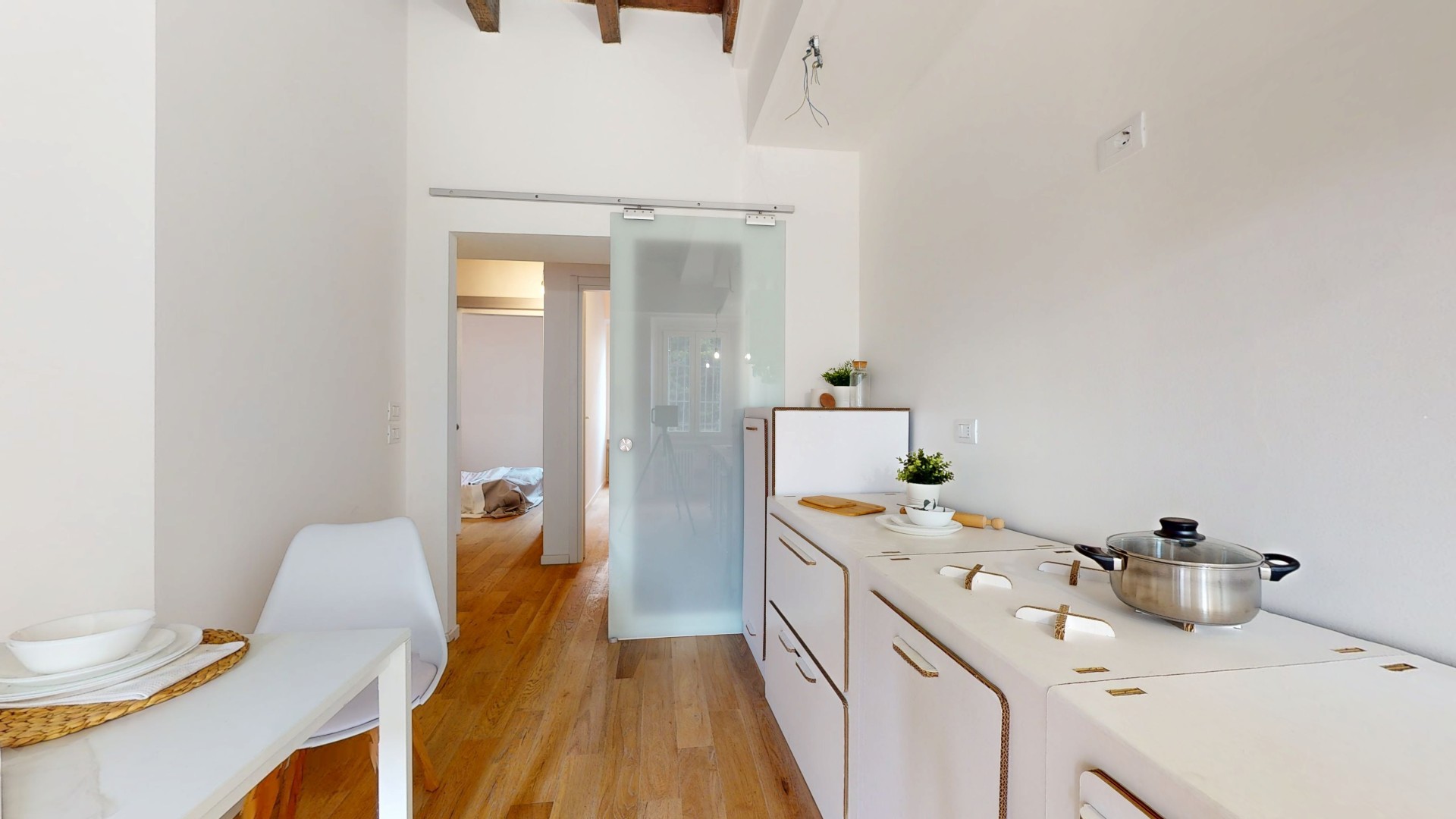 La disposizione interna prevede un ingresso sul soggiorno con cucina a vista una camera matrimoniale spaziosa una cameretta ideale anche come studio o cabina armadio e un bagno.