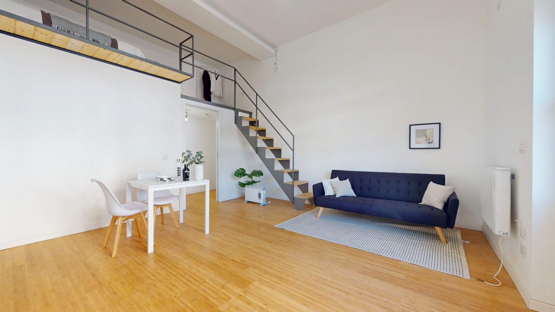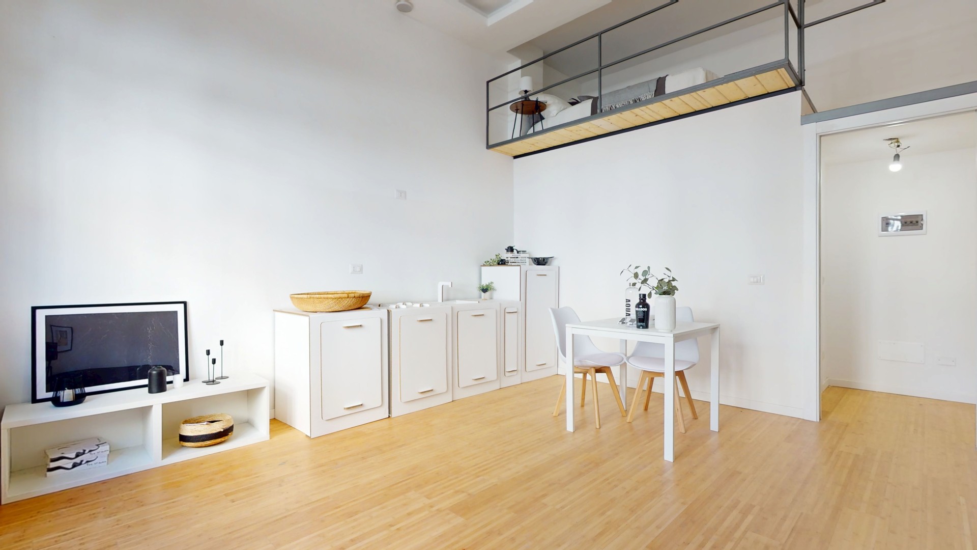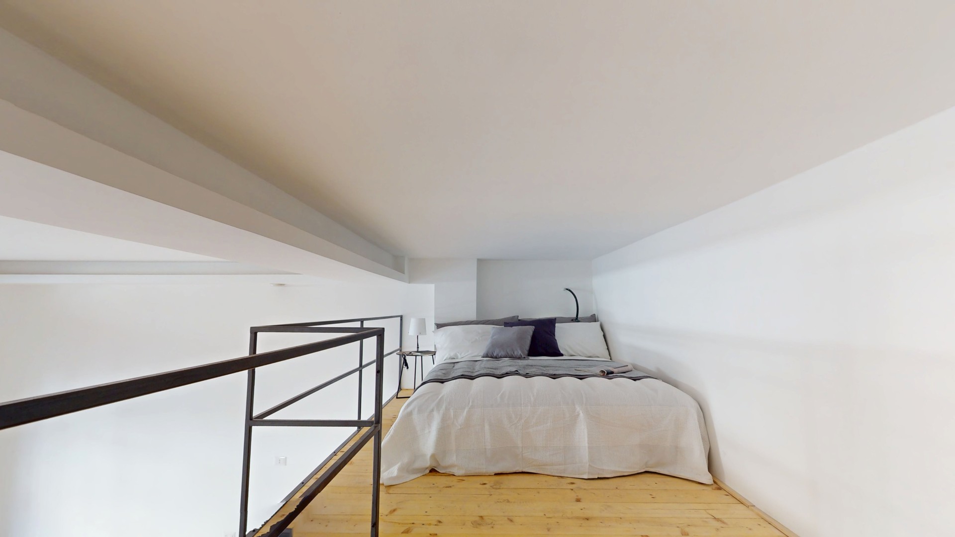 La zona notte è stata realizzata interamente su un pratico soppalco, una soluzione intelligente che consente di sfruttare al meglio l’altezza dell’ambiente e ottimizzare gli spazi disponibili.