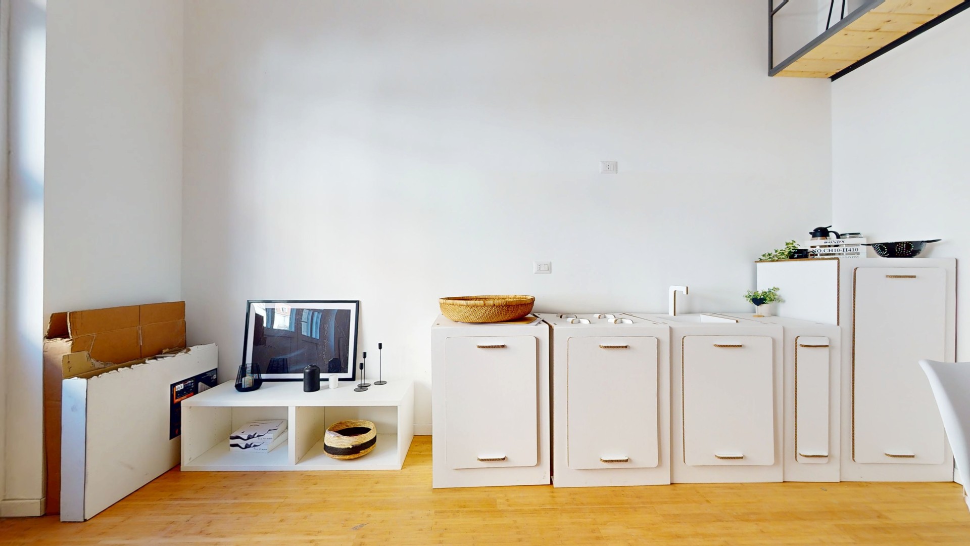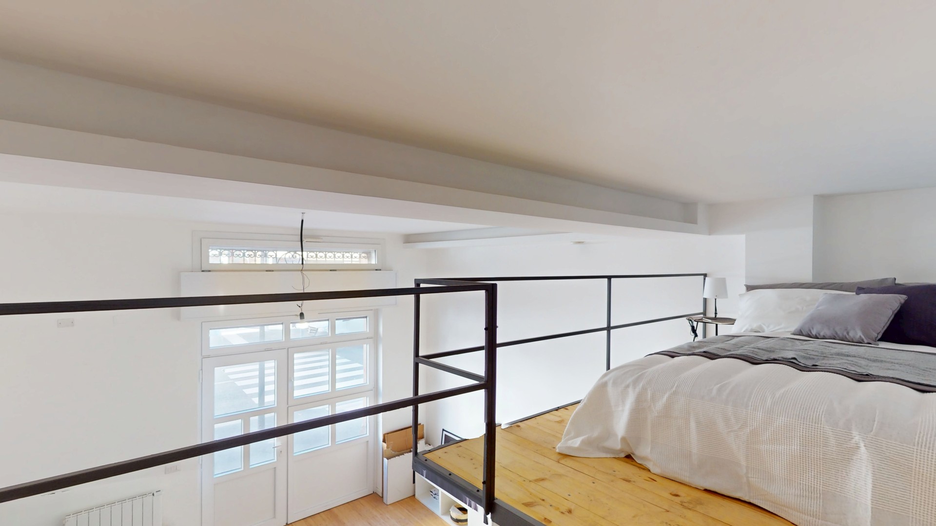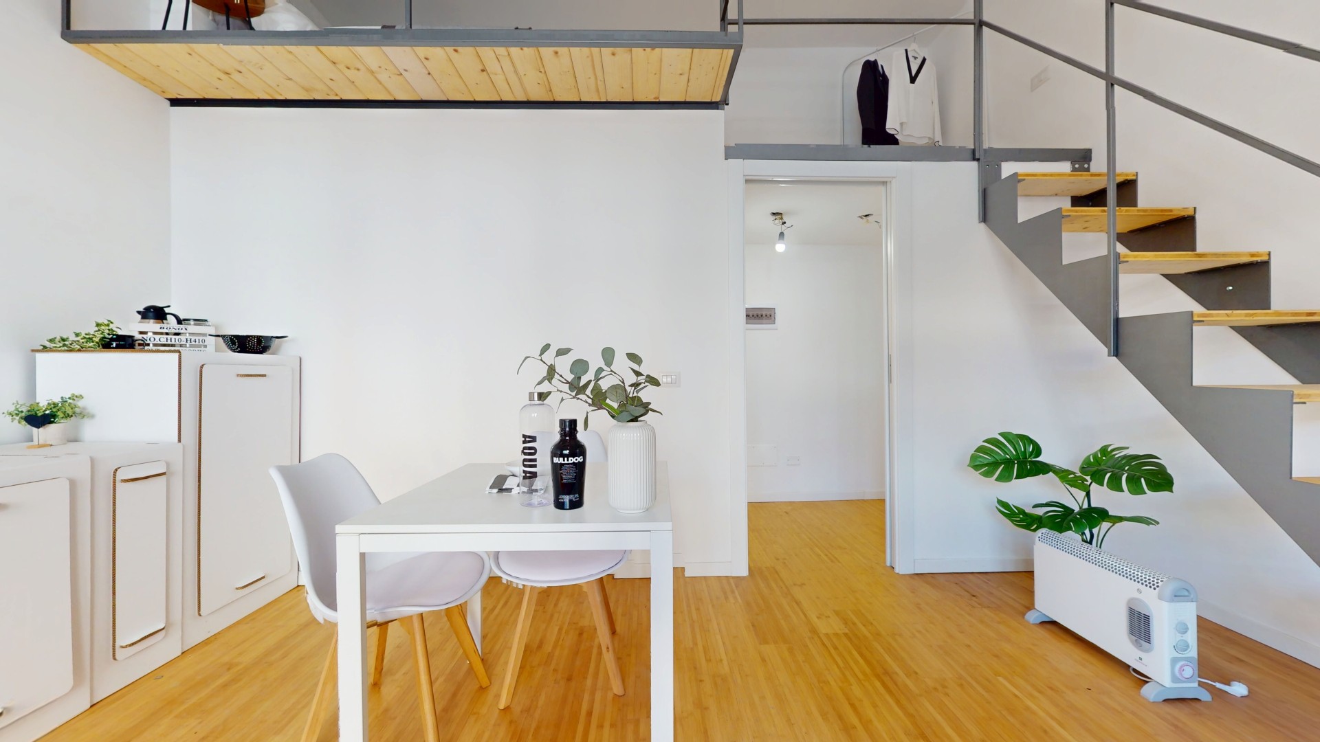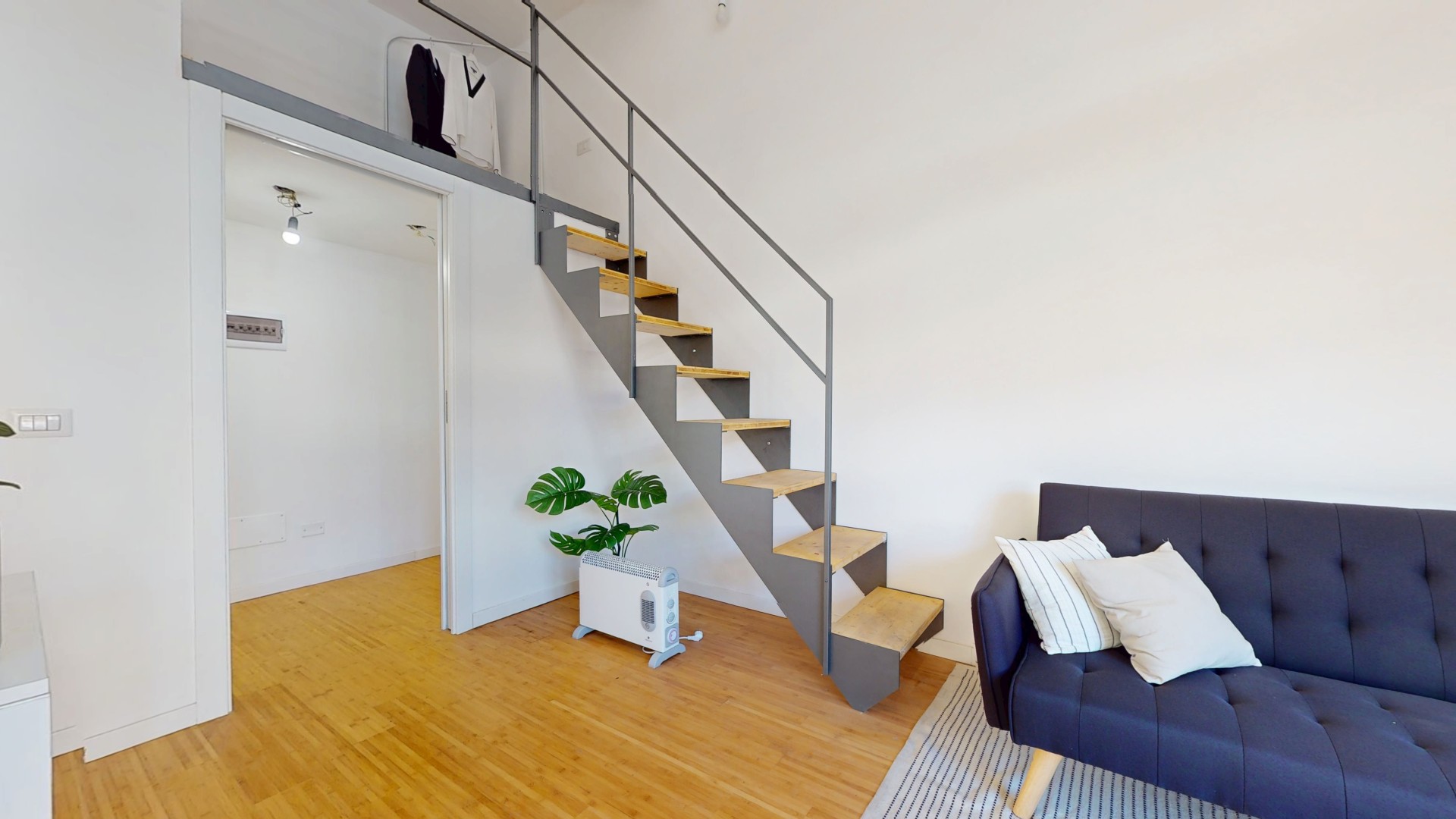 La zona notte è stata realizzata interamente su un pratico soppalco, una soluzione intelligente che consente di sfruttare al meglio l’altezza dell’ambiente e ottimizzare gli spazi disponibili.