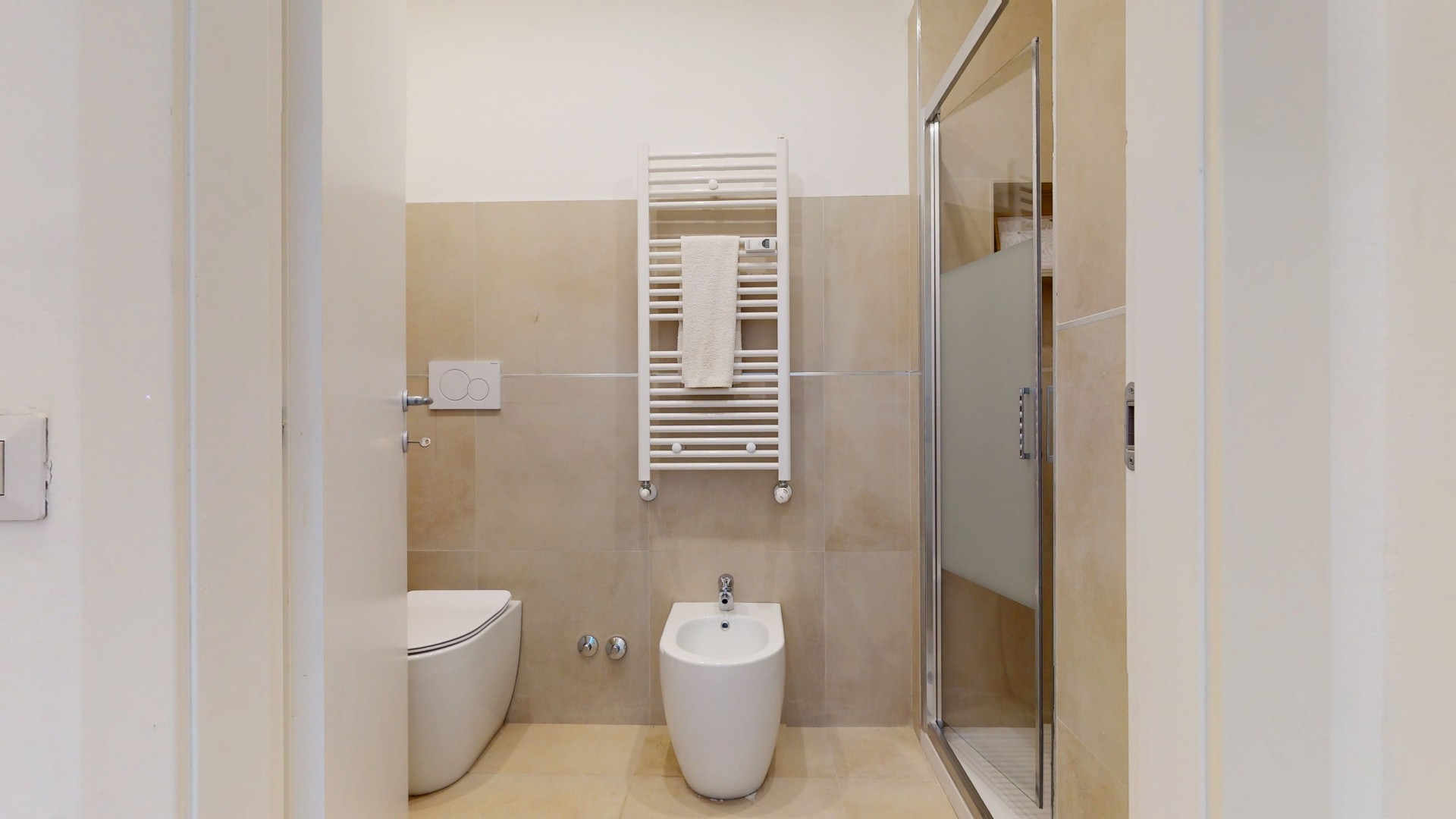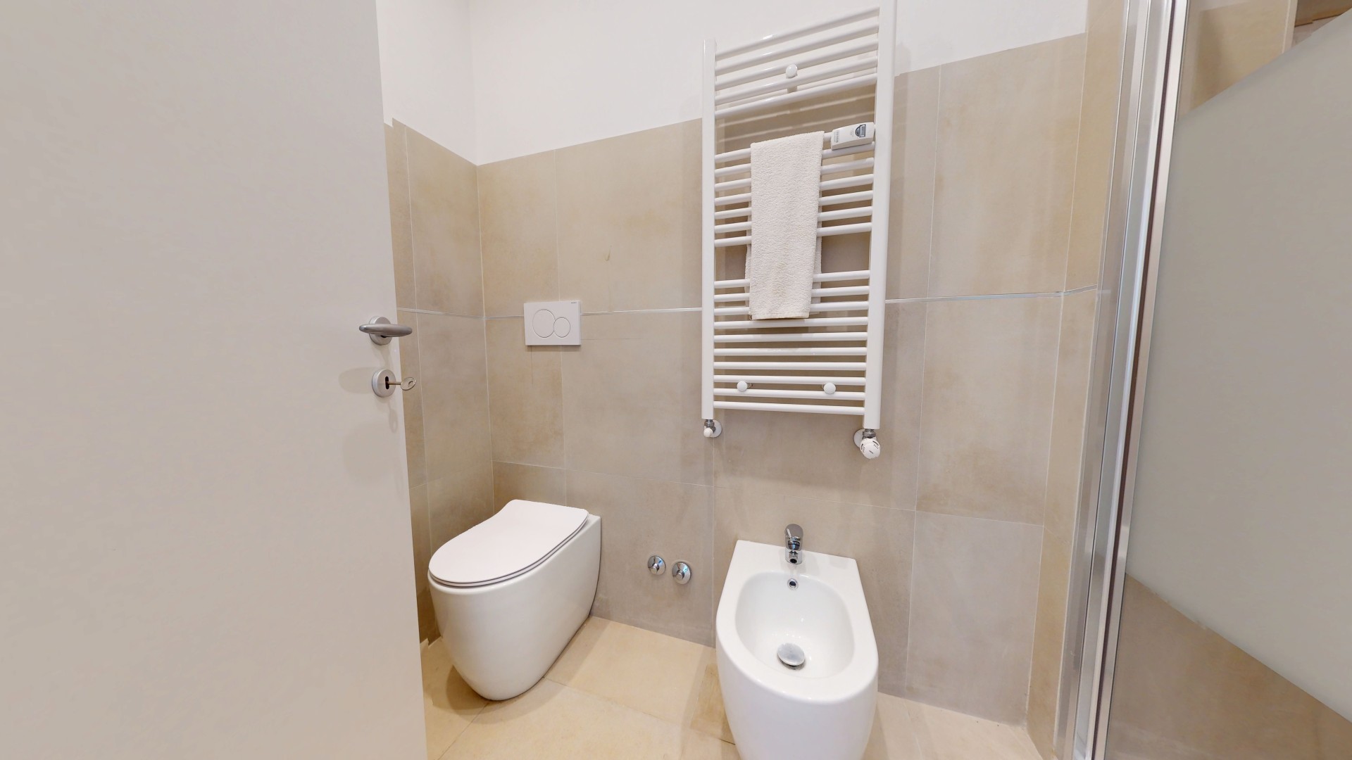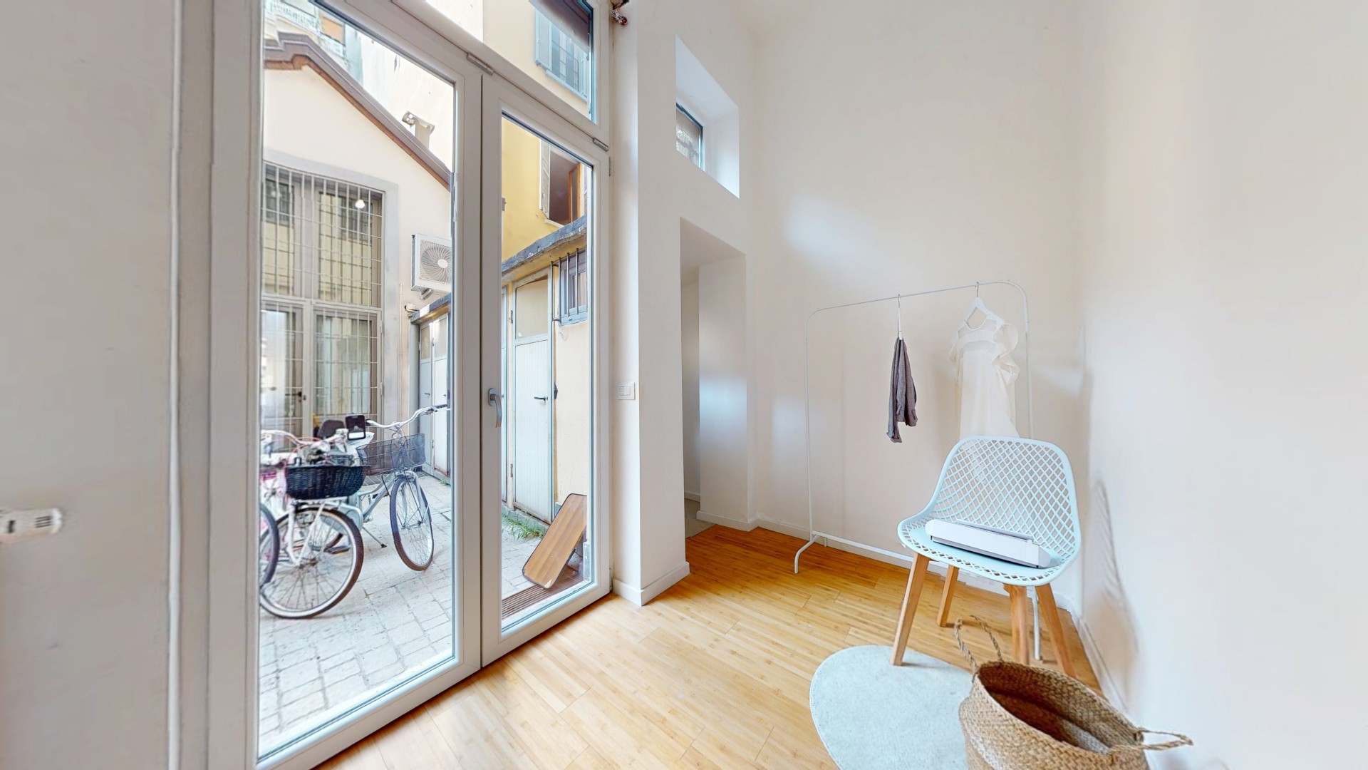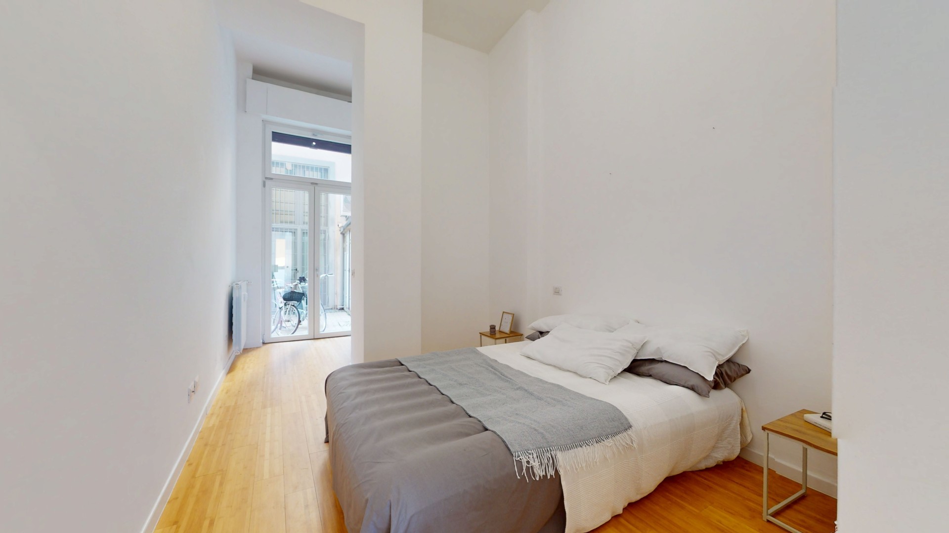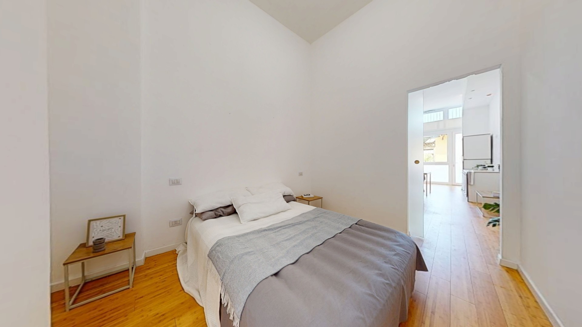 La zona notte è composta da una spaziosa camera matrimoniale, caratterizzata da dimensioni generose e da una comoda area dedicata all’armadio. La camera affaccia su una porta finestra che conduce al cortile comune, offrendo luce e tranquillità, nonché possibilità d'ingresso.