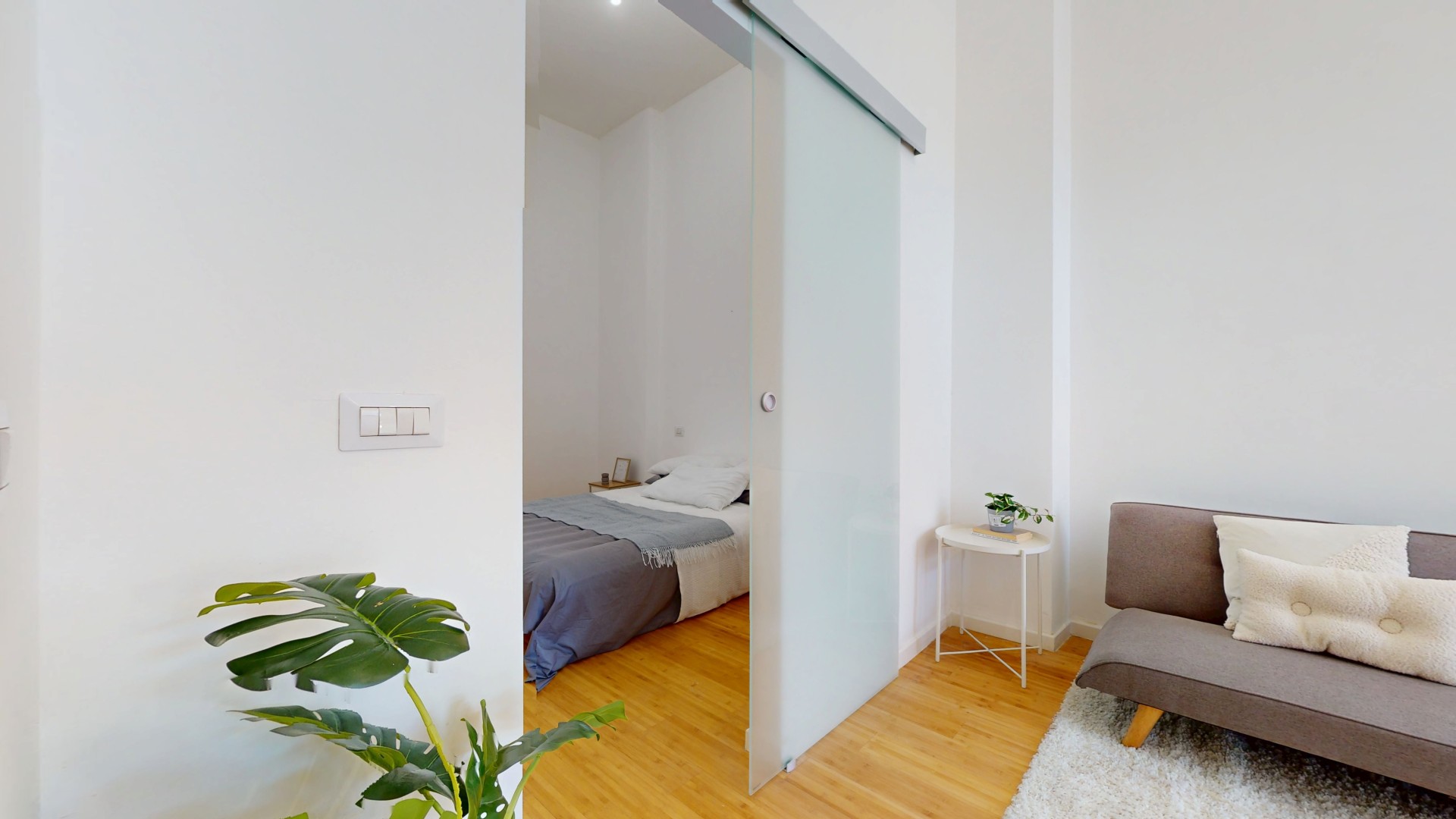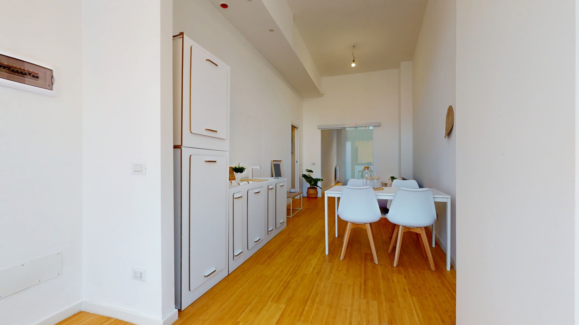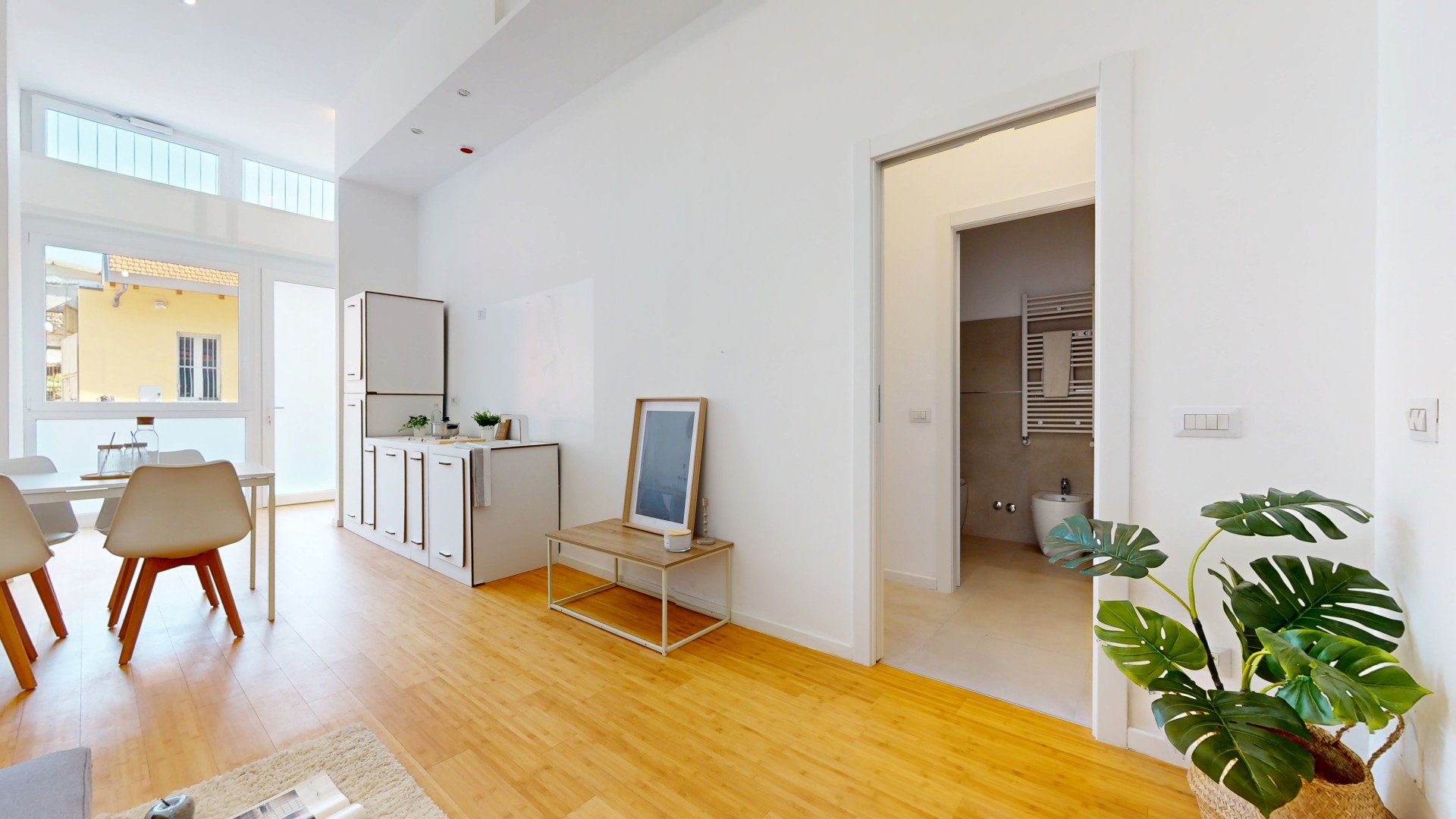 L’ingresso conduce a un ampio soggiorno con cucina a vista, un ambiente accogliente e luminoso grazie alla parete finestrata che garantisce un’ottima illuminazione naturale. La zona giorno è completata da un bagno moderno dotato di doccia.