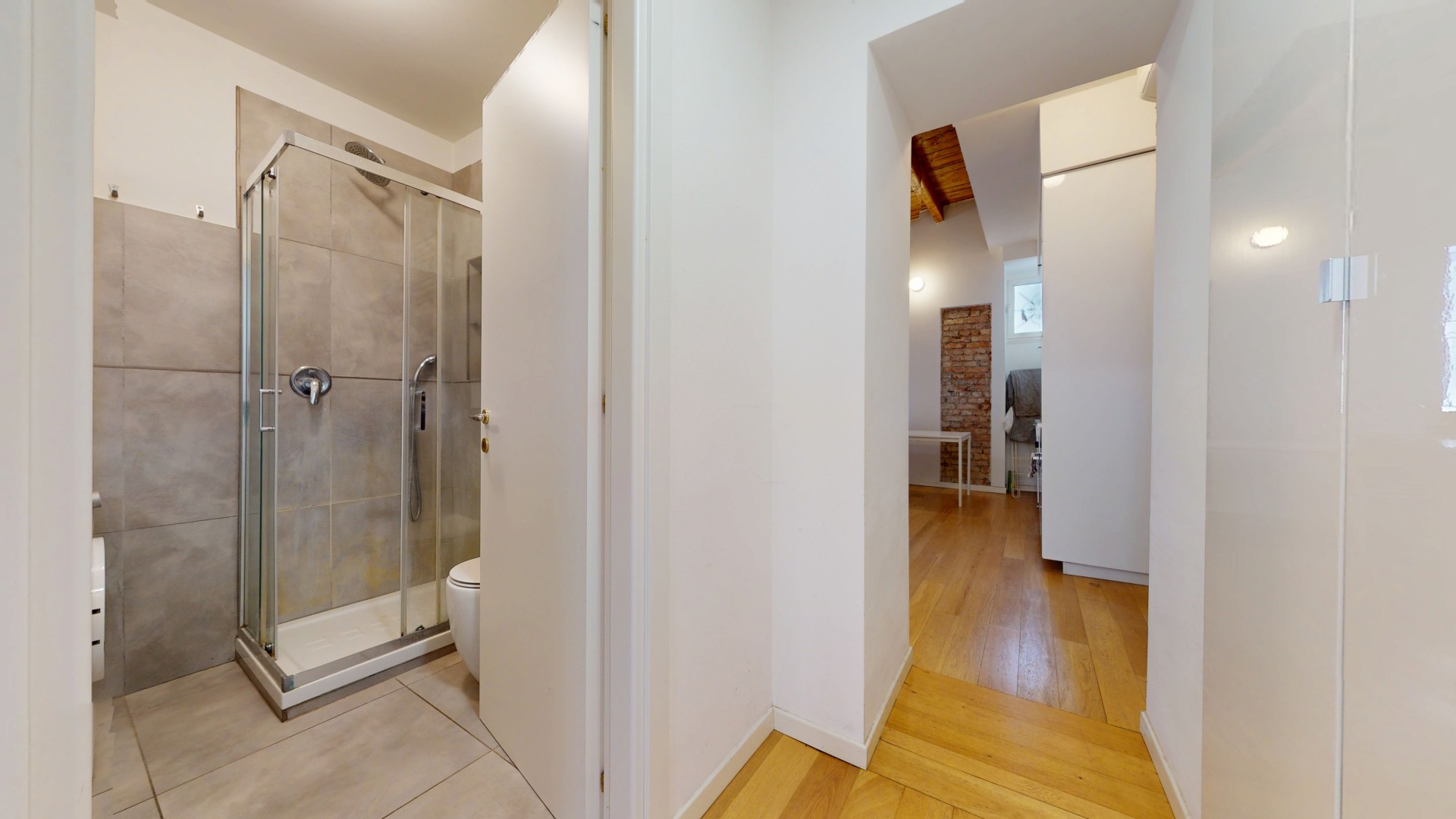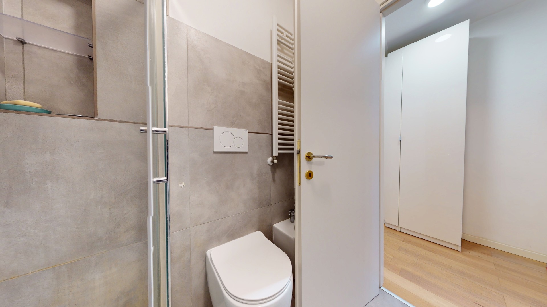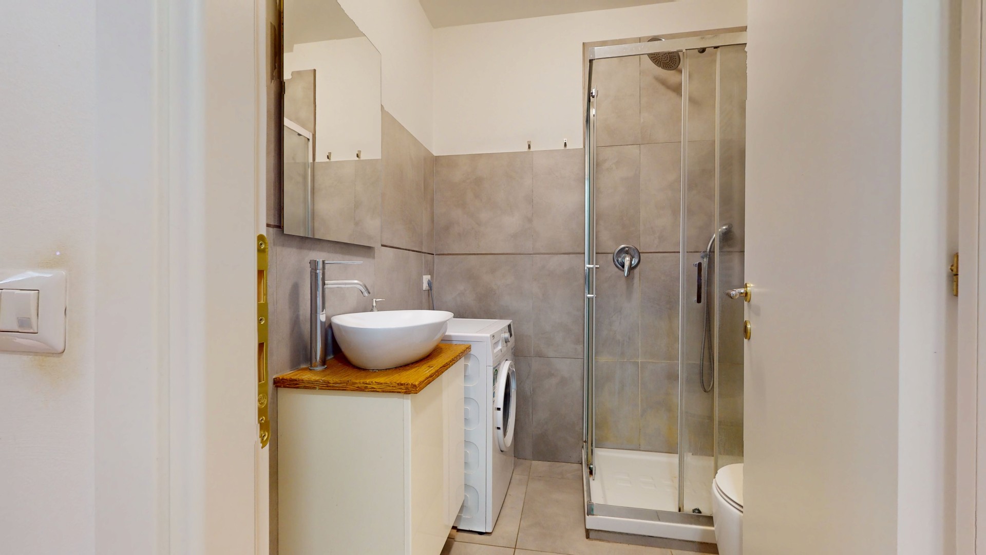 Un disimpegno introduce alla zona notte, garantendo una separazione funzionale tra gli spazi. Il bagno, moderno e ben rifinito, è dotato di sanitari filo muro e box doccia. La camera da letto matrimoniale, spaziosa e luminosa grazie all'esposizione a sud-ovest.