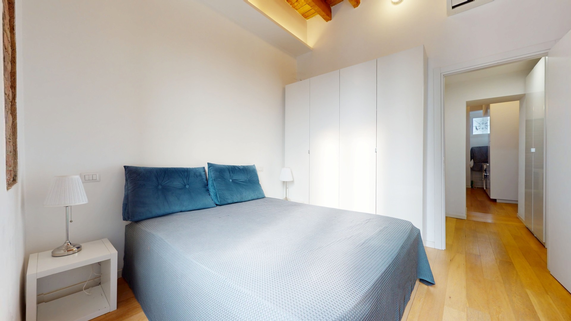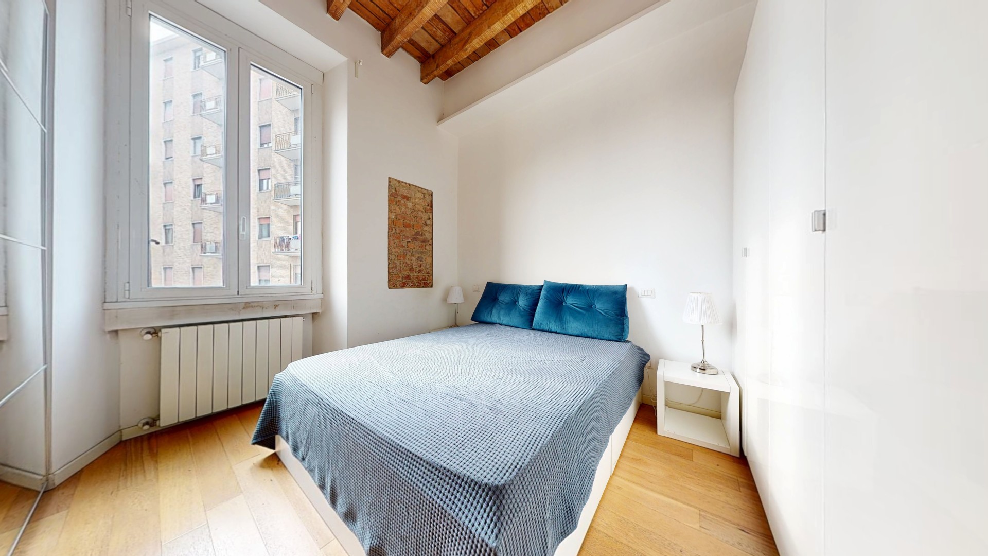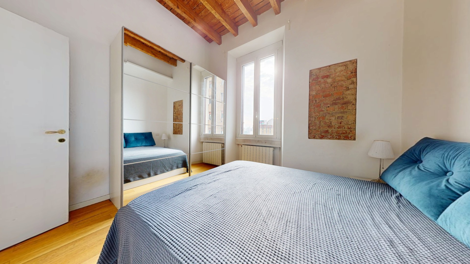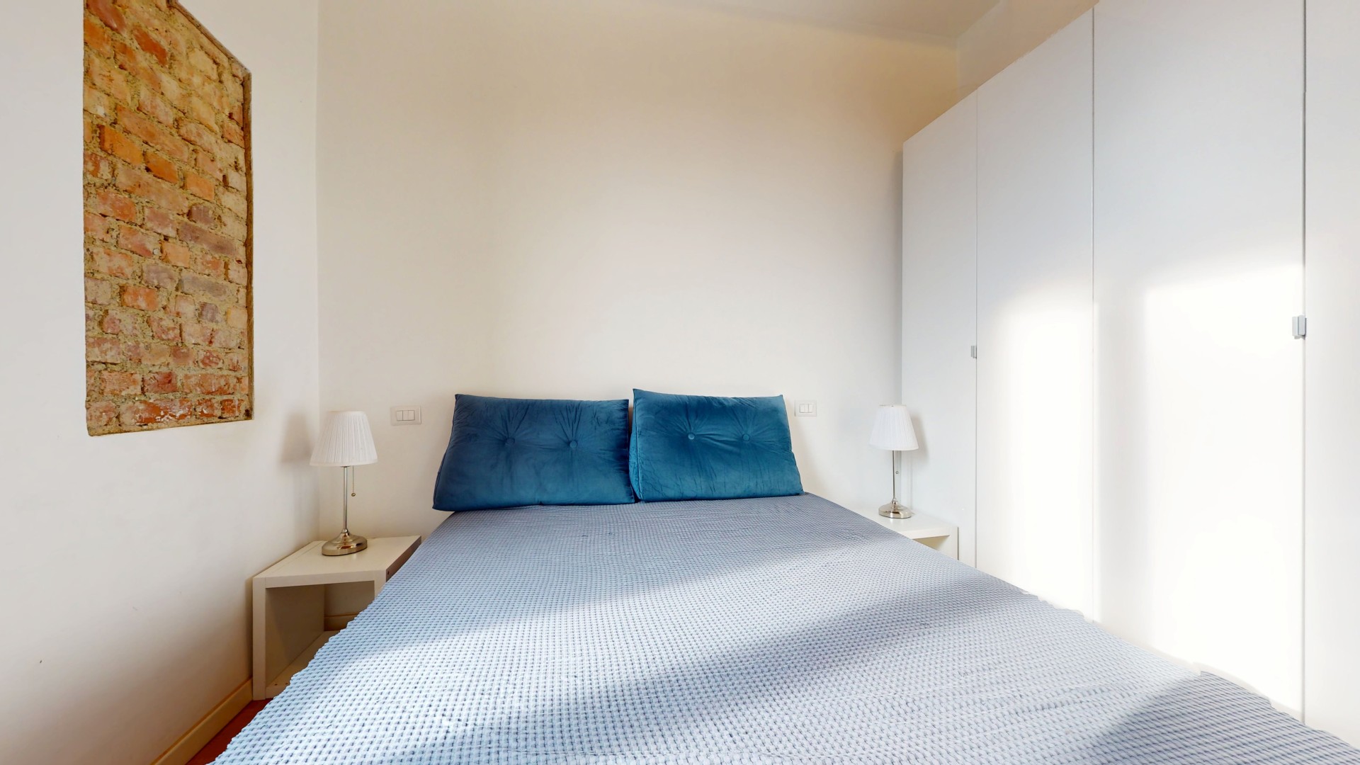 Un disimpegno introduce alla zona notte, garantendo una separazione funzionale tra gli spazi. Il bagno, moderno e ben rifinito, è dotato di sanitari filo muro e box doccia. La camera da letto matrimoniale, spaziosa e luminosa grazie all'esposizione a sud-ovest.