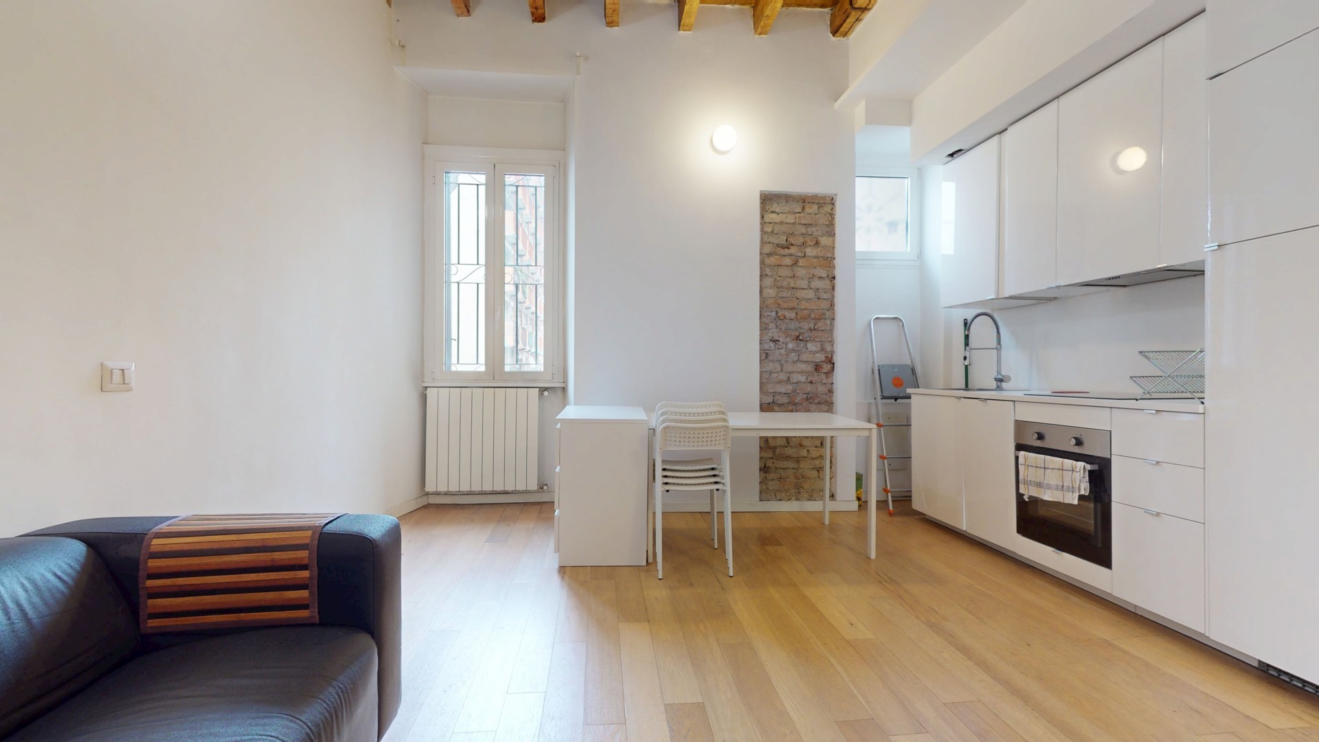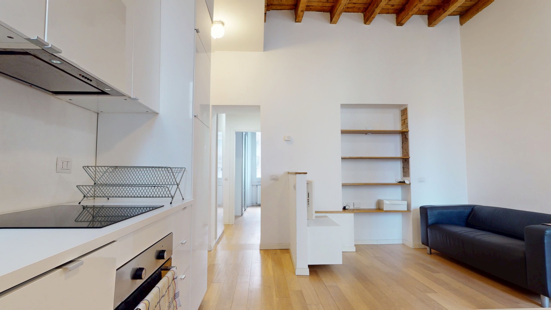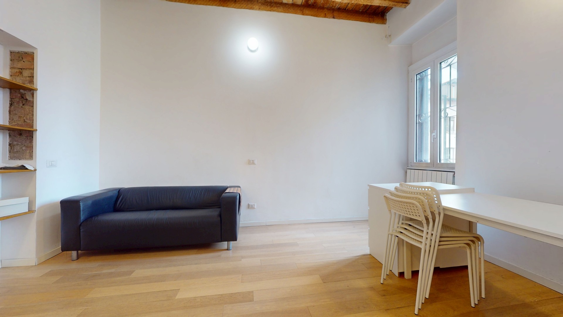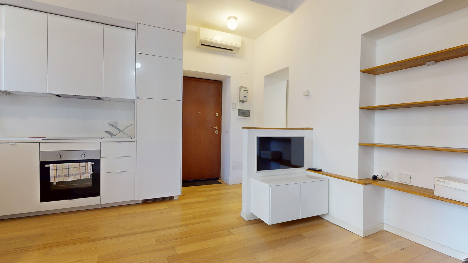 L’ingresso conduce direttamente all’ampia zona giorno, composta da un soggiorno con cucina a vista. Una finestra con affaccio interno illumina l’ambiente, creando un’atmosfera accogliente e riservata.