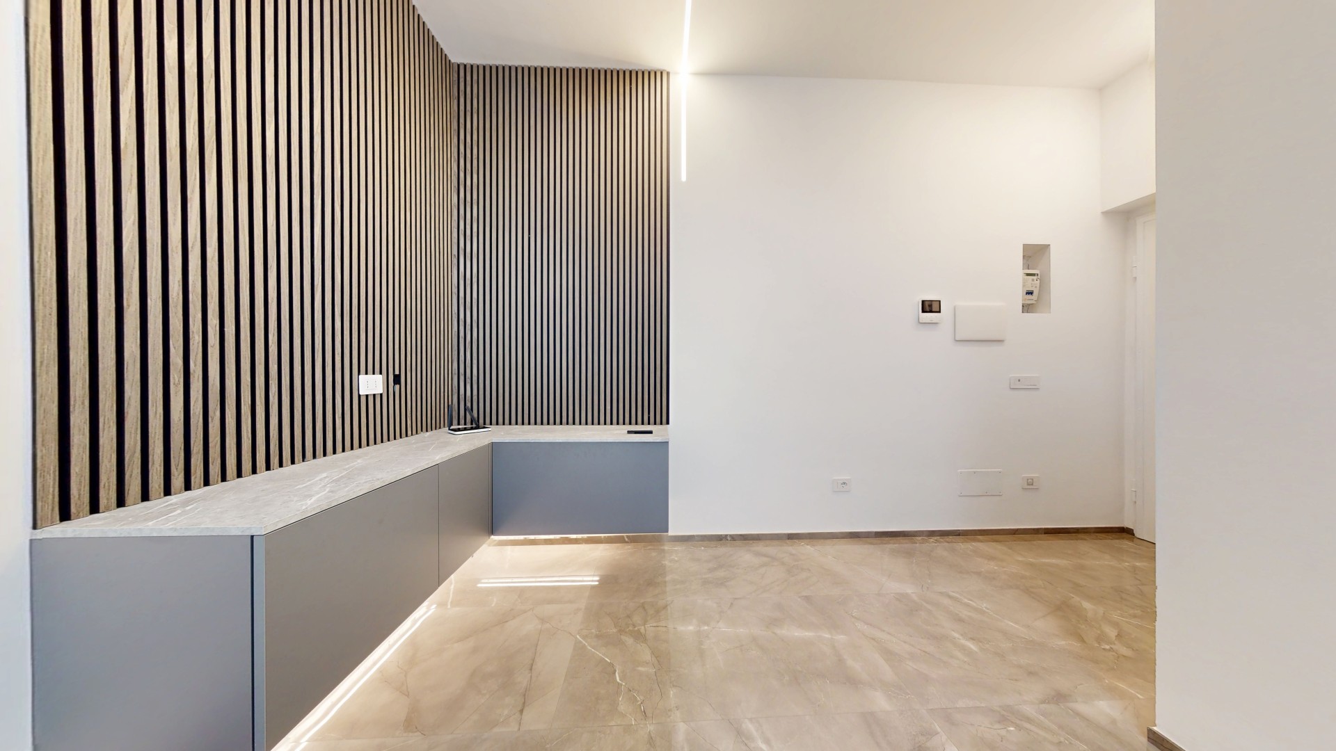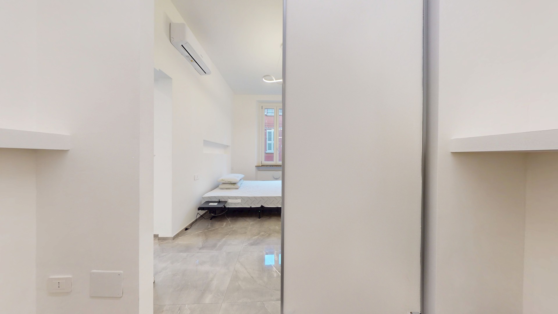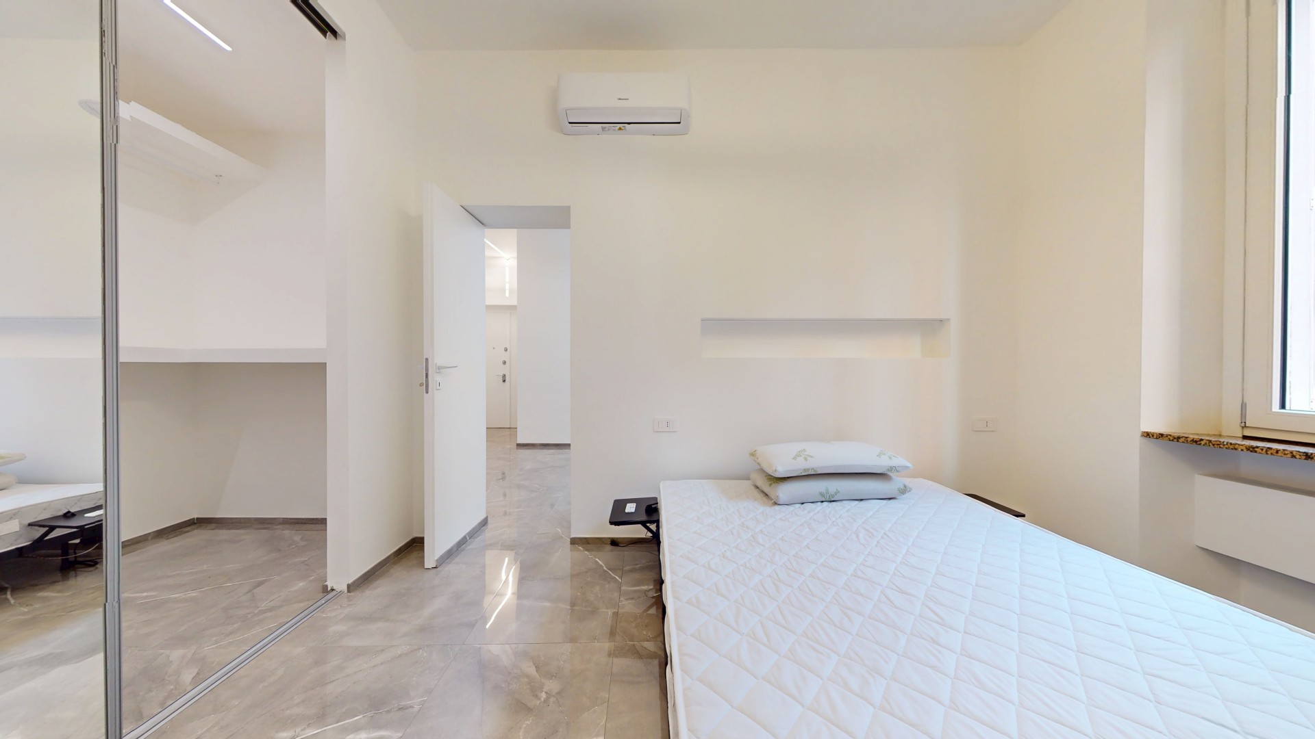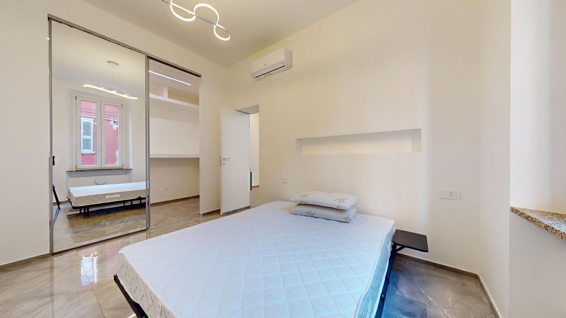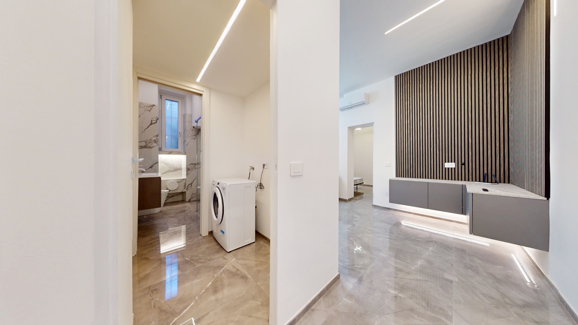 L’ingresso conduce a un disimpegno che collega il bagno alla zona giorno. Prima di accedere al bagno troviamo una lavanderia con attacchi per lavatrice e asciugatrice e un pratico ripostiglio in quota. Il bagno finestrato è stato completamente ristrutturato, comprensivo di nuovi impianti e scarichi. La zona living è composta da un’area dedicata al living e al relax, con cucina a vista, ed è caratterizzata da una porzione rivestita con pannelli fonoassorbenti che garantiscono un elevato comfort acustico. L’ambiente risulta funzionale e ben organizzato, ideale sia per la vita quotidiana che per momenti di convivialità. Living e cucina sono arredati su misura dal brand ARREDO3, con elettrodomestici integrati, piano a induzione, cappa integrata e tutto l’arredo presente incluso. La zona notte ospita una camera da letto già arredata, con accesso diretto a una spaziosa cabina armadio, realizzata con porte scorrevoli a specchio che ottimizzano lo spazio e donano maggiore profondità e luminosità all’ambiente.