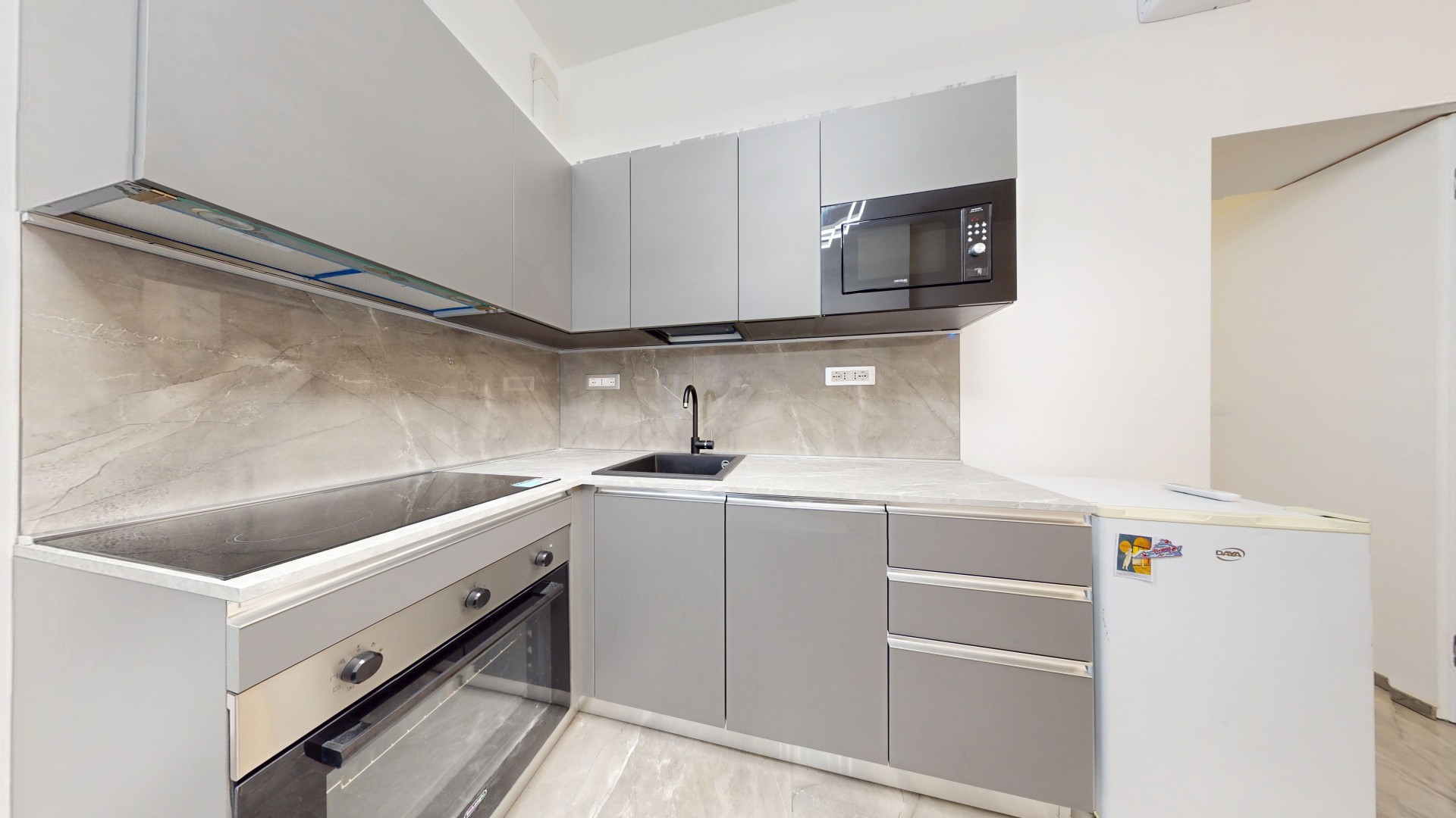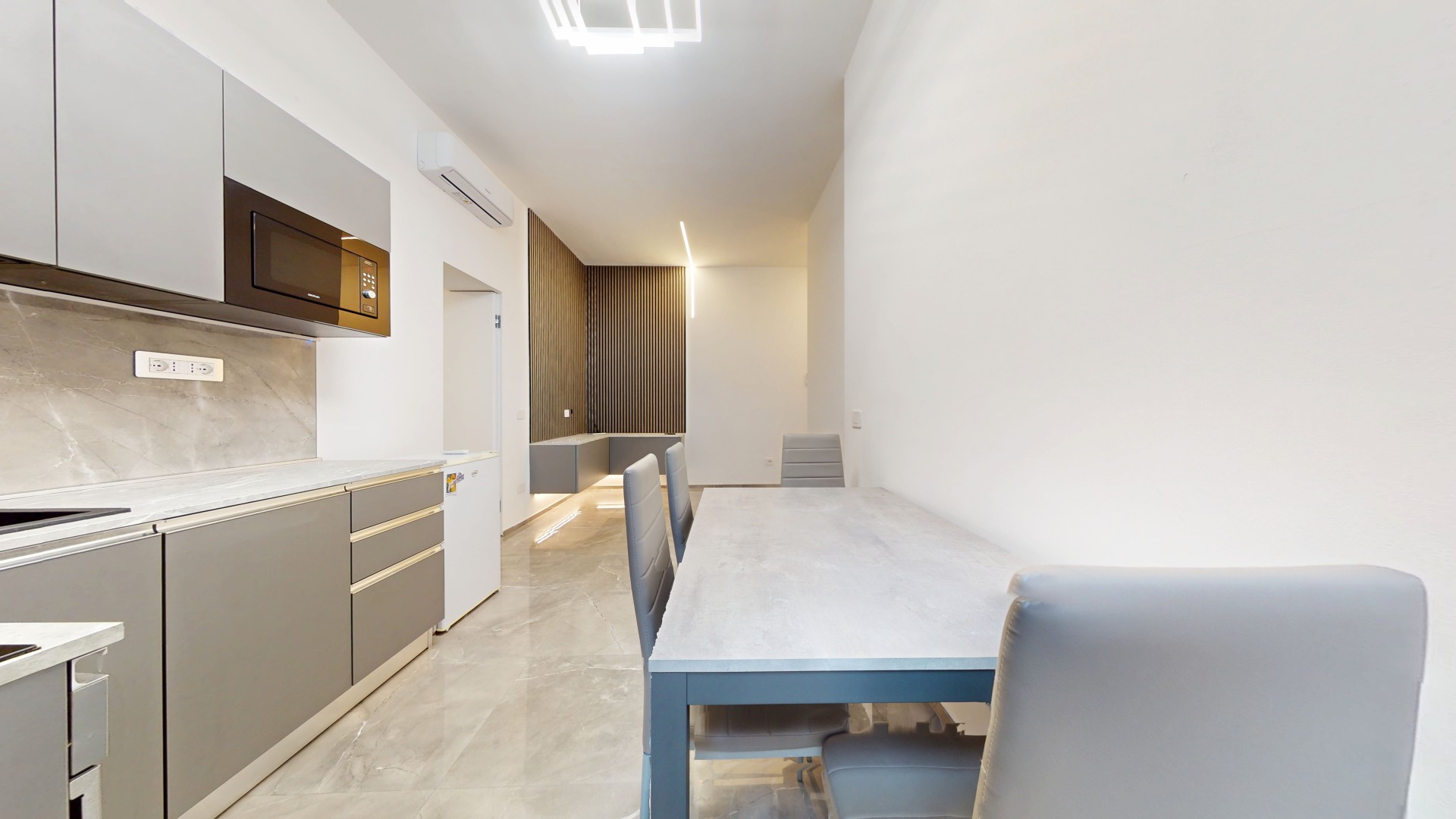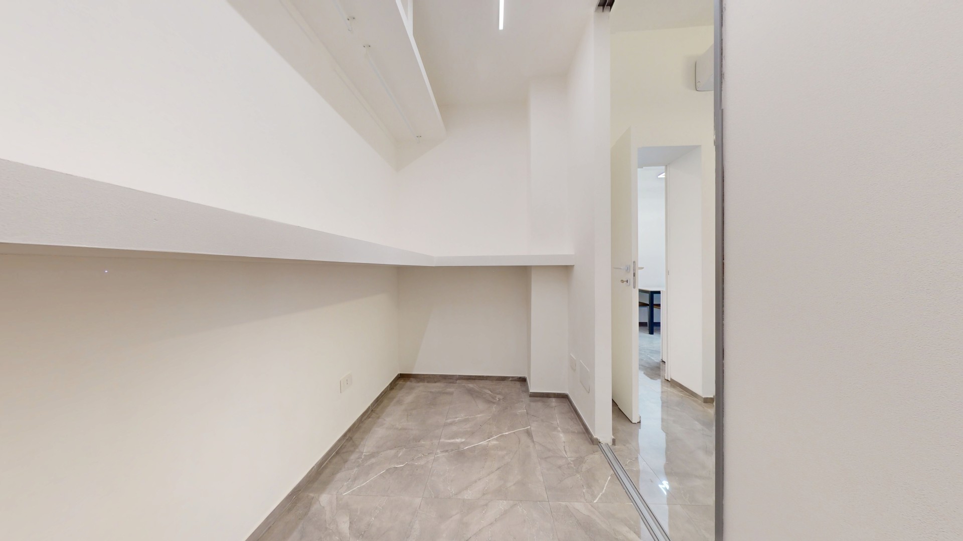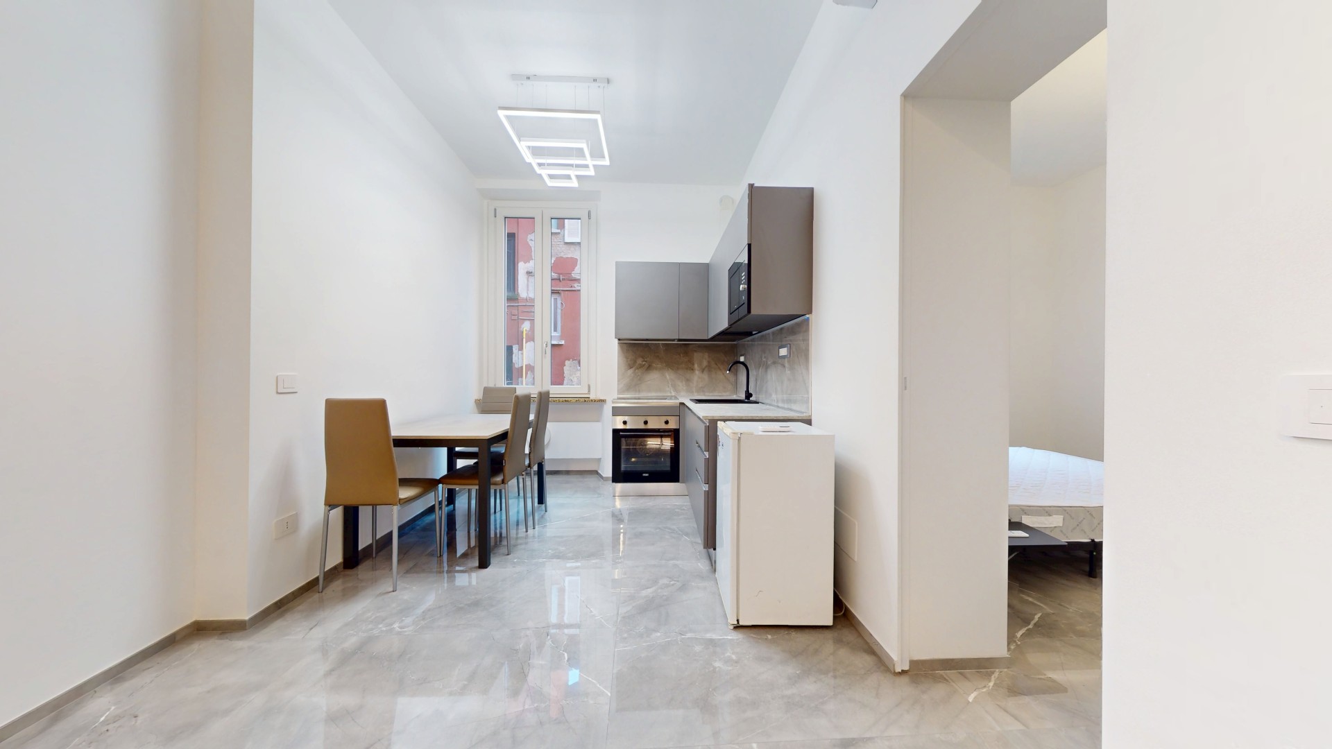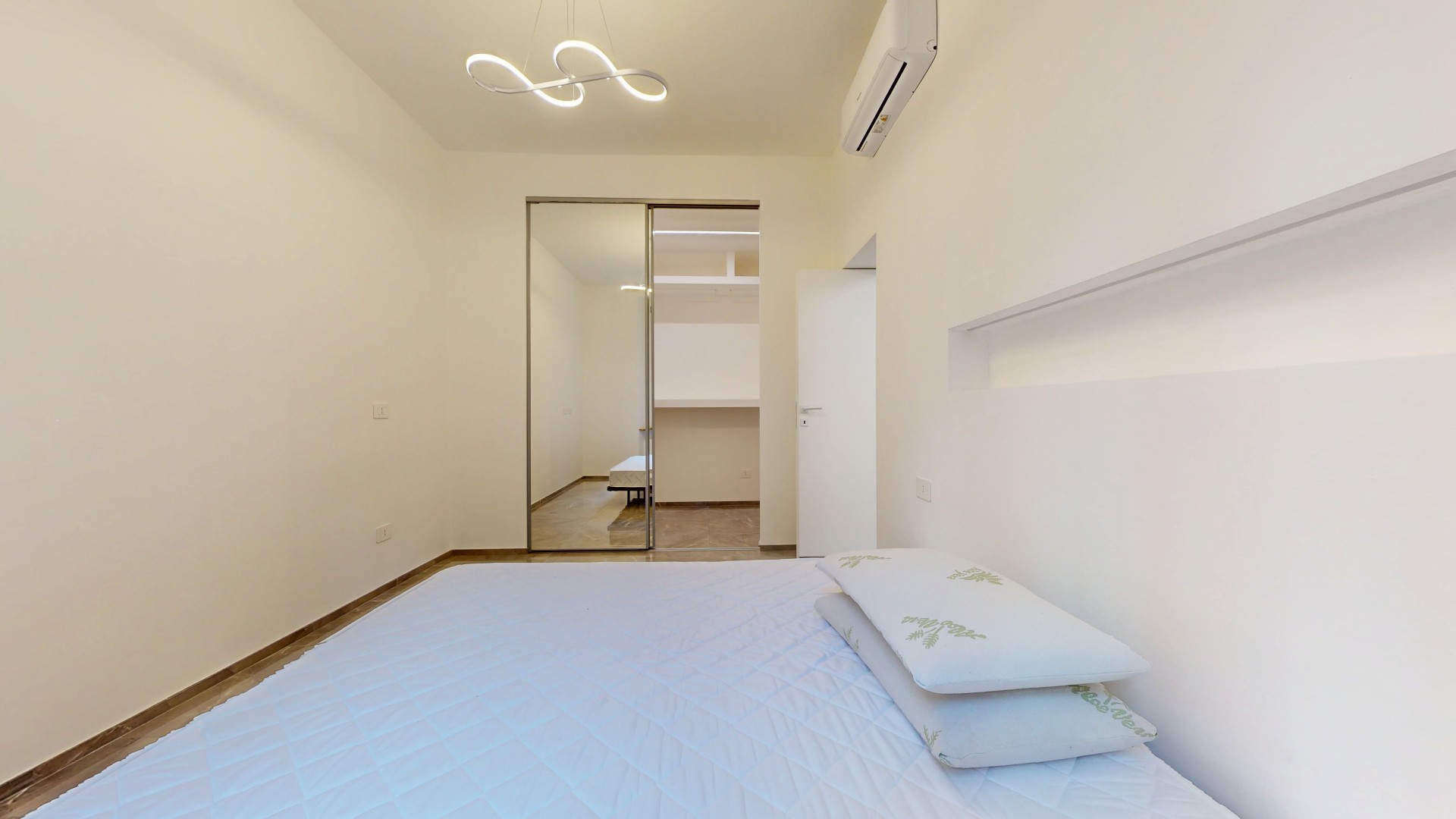 L’ingresso conduce a un disimpegno che collega il bagno alla zona giorno. Prima di accedere al bagno troviamo una lavanderia con attacchi per lavatrice e asciugatrice e un pratico ripostiglio in quota. Il bagno finestrato è stato completamente ristrutturato, comprensivo di nuovi impianti e scarichi. La zona living è composta da un’area dedicata al living e al relax, con cucina a vista, ed è caratterizzata da una porzione rivestita con pannelli fonoassorbenti che garantiscono un elevato comfort acustico. L’ambiente risulta funzionale e ben organizzato, ideale sia per la vita quotidiana che per momenti di convivialità. Living e cucina sono arredati su misura dal brand ARREDO3, con elettrodomestici integrati, piano a induzione, cappa integrata e tutto l’arredo presente incluso. La zona notte ospita una camera da letto già arredata, con accesso diretto a una spaziosa cabina armadio, realizzata con porte scorrevoli a specchio che ottimizzano lo spazio e donano maggiore profondità e luminosità all’ambiente.