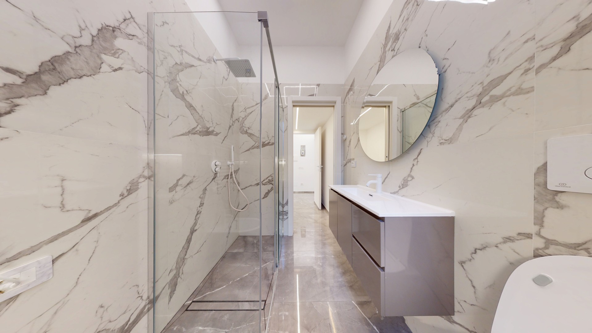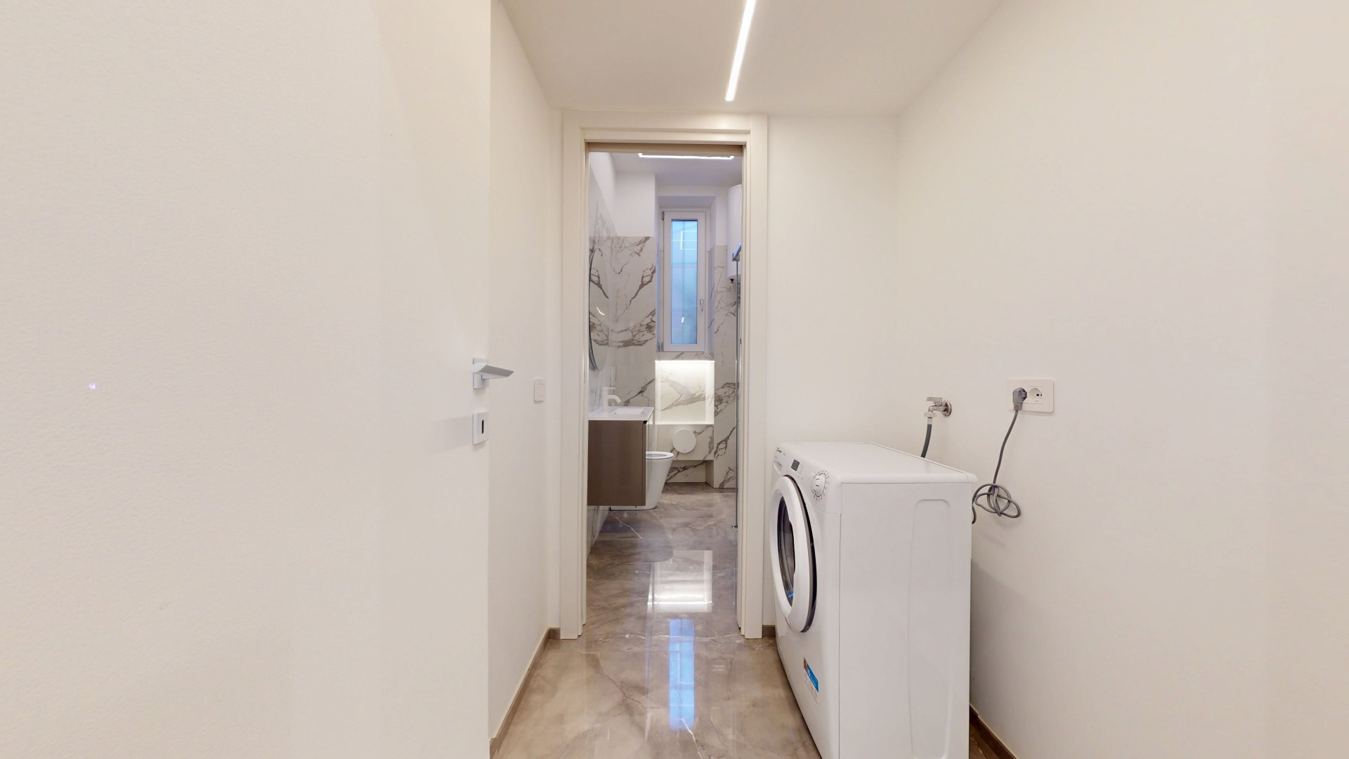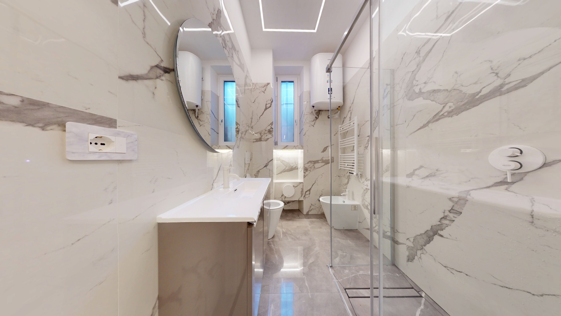 • Luci LED dimmerabili in classe energetica A del brand Silvia Illuminazione, con canalizzazioni a parete e soffitto; in bagno LED cromoterapici