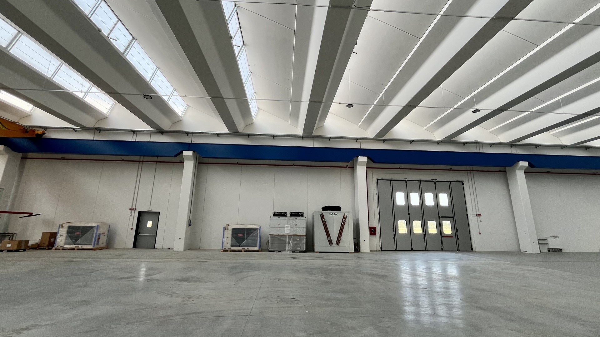 Il riscaldamento è a pavimento, una scelta che unisce comfort e risparmio energetico, permettendo una distribuzione uniforme del calore e un ambiente di lavoro più confortevole durante tutto l’anno. Il tetto, realizzato in alluminio, assicura leggerezza, resistenza agli agenti atmosferici e un’elevata efficienza energetica, contribuendo al mantenimento di un clima interno stabile e a bassi costi di gestione.
