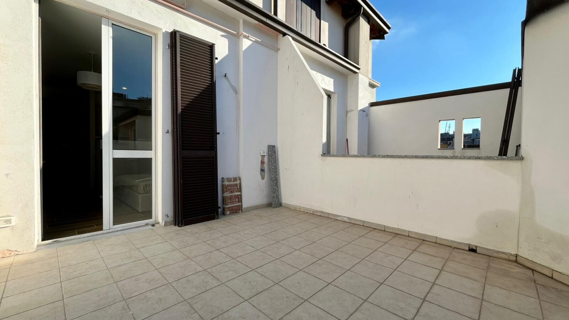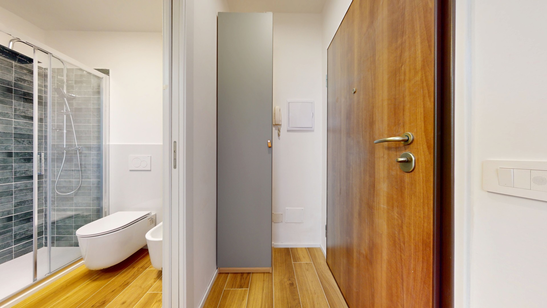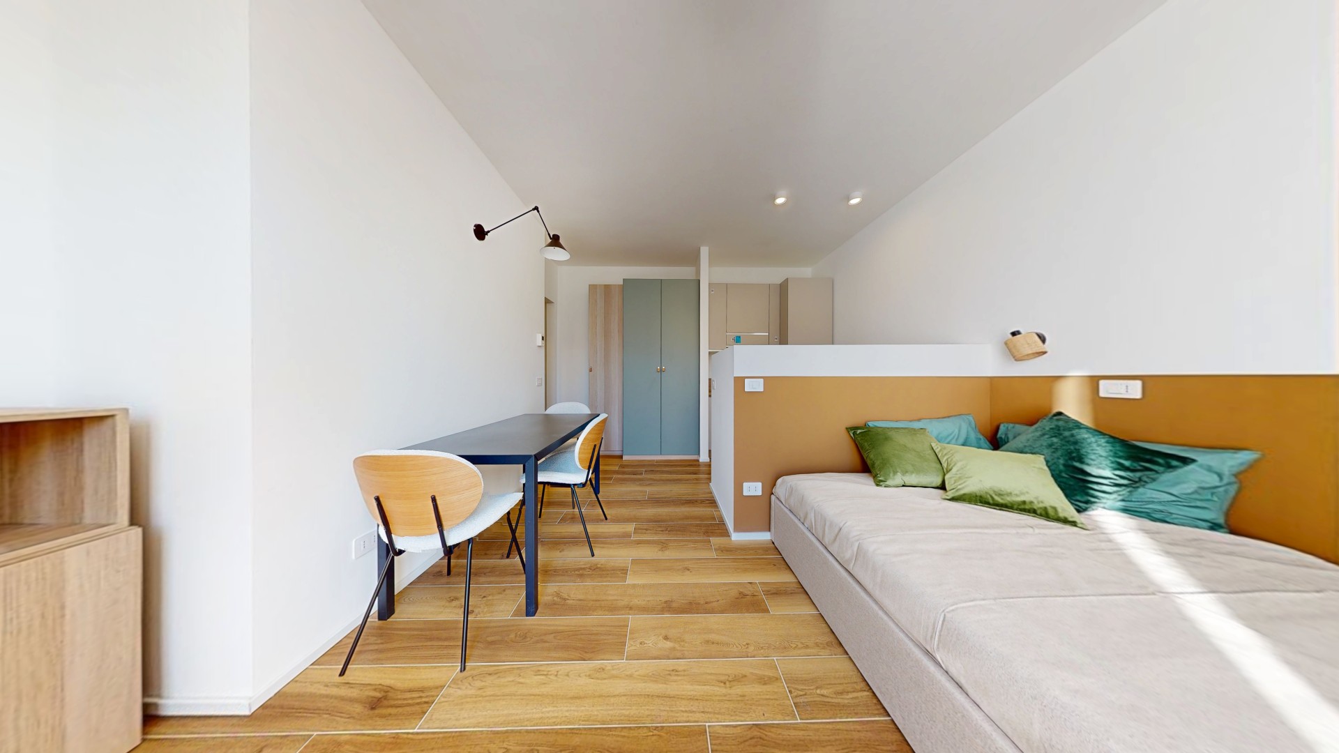 L’ingresso si apre su un comodo disimpegno che conduce all’ampia e luminosa zona giorno, organizzata con cucina a vista, pratica zona pranzo e spazio dedicato al letto, il tutto studiato per garantire funzionalità e comfort. Una grande porta finestra dona luminosità all’ambiente e permette l’accesso alla spaziosa terrazza, ideale per momenti di relax all’aperto e dotata di attacchi per la lavatrice. Completa la proprietà un ampio bagno dalle moderne rifiniture, dotato di sanitari e un comodo box doccia.