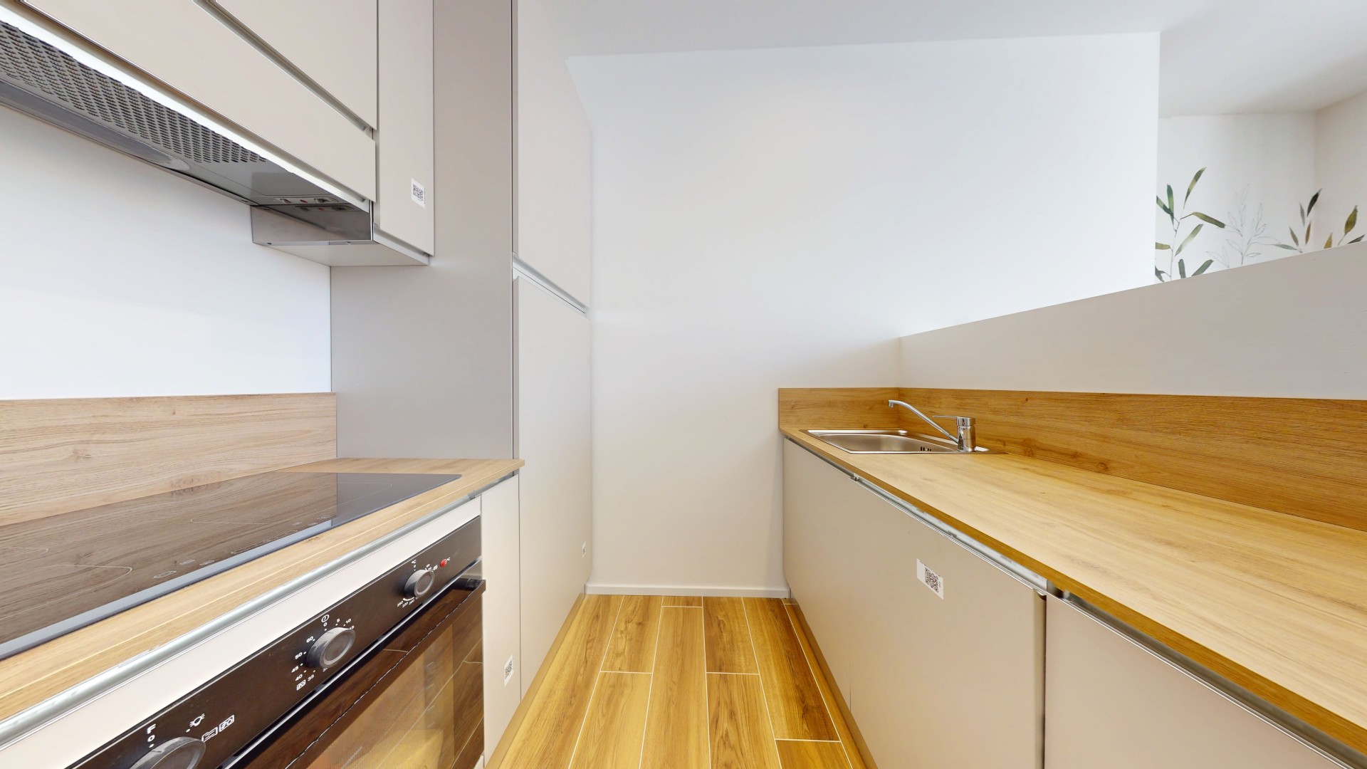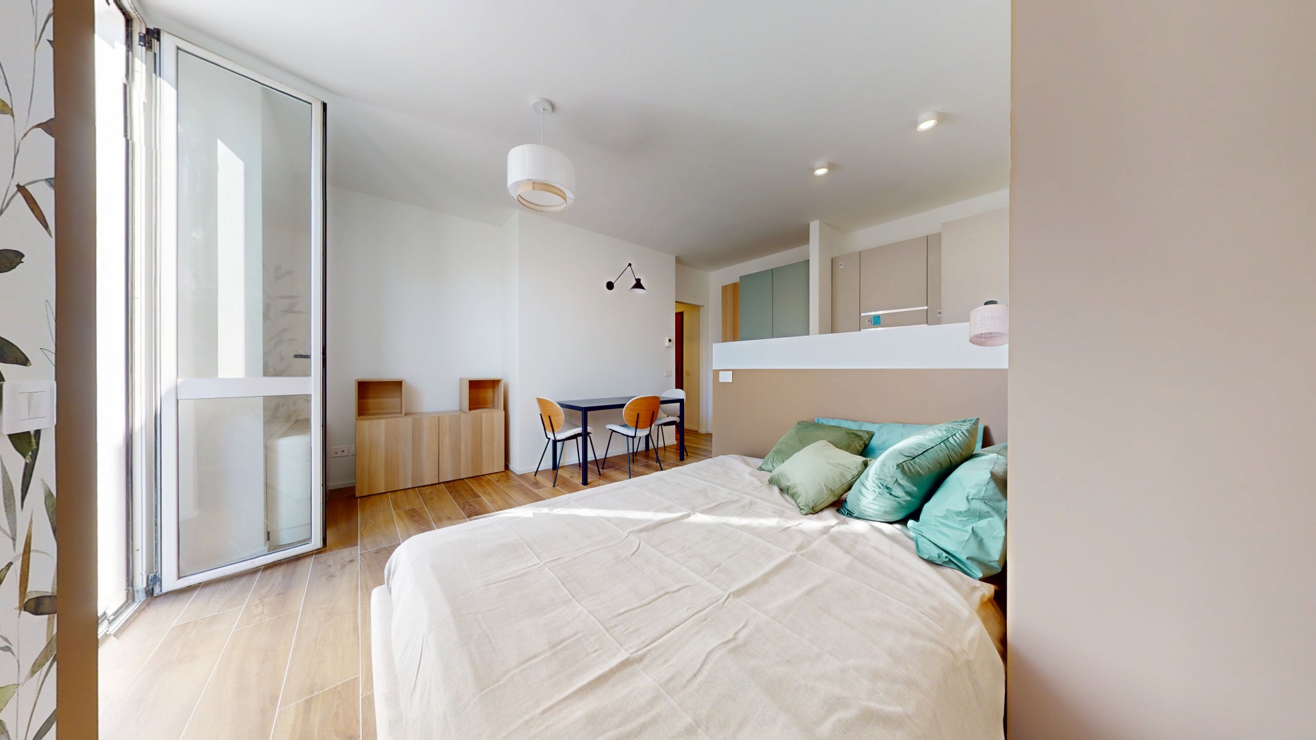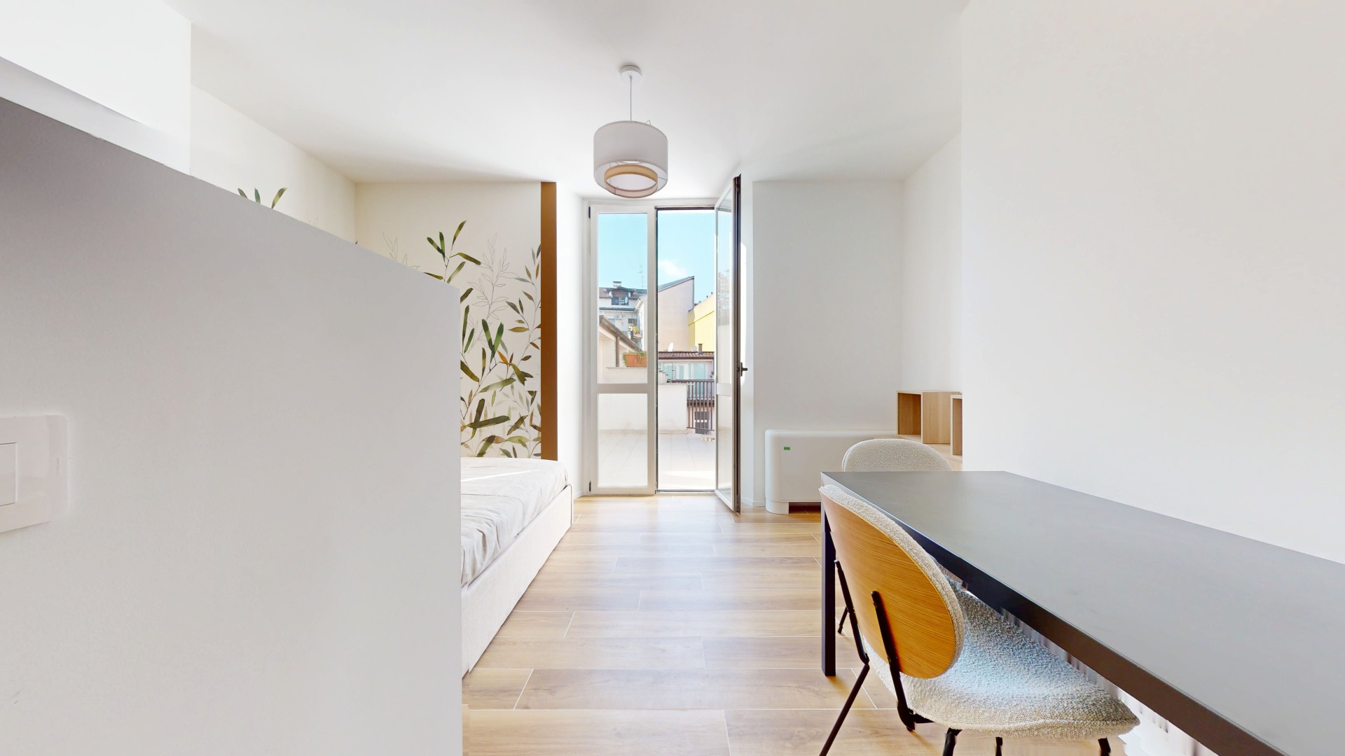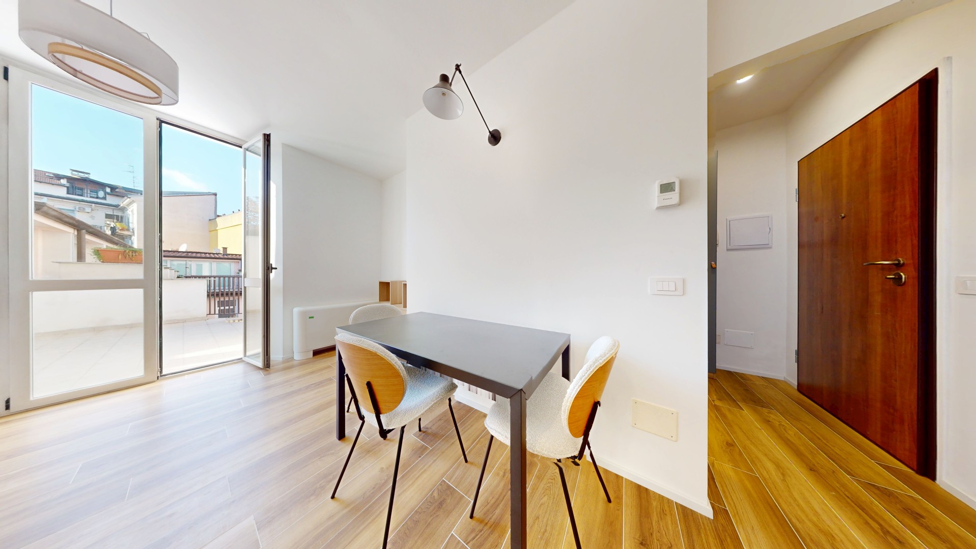 L’ingresso si apre su un comodo disimpegno che conduce all’ampia e luminosa zona giorno, organizzata con cucina a vista, pratica zona pranzo e spazio dedicato al letto, il tutto studiato per garantire funzionalità e comfort. Una grande porta finestra dona luminosità all’ambiente e permette l’accesso alla spaziosa terrazza, ideale per momenti di relax all’aperto e dotata di attacchi per la lavatrice. Completa la proprietà un ampio bagno dalle moderne rifiniture, dotato di sanitari e un comodo box doccia.