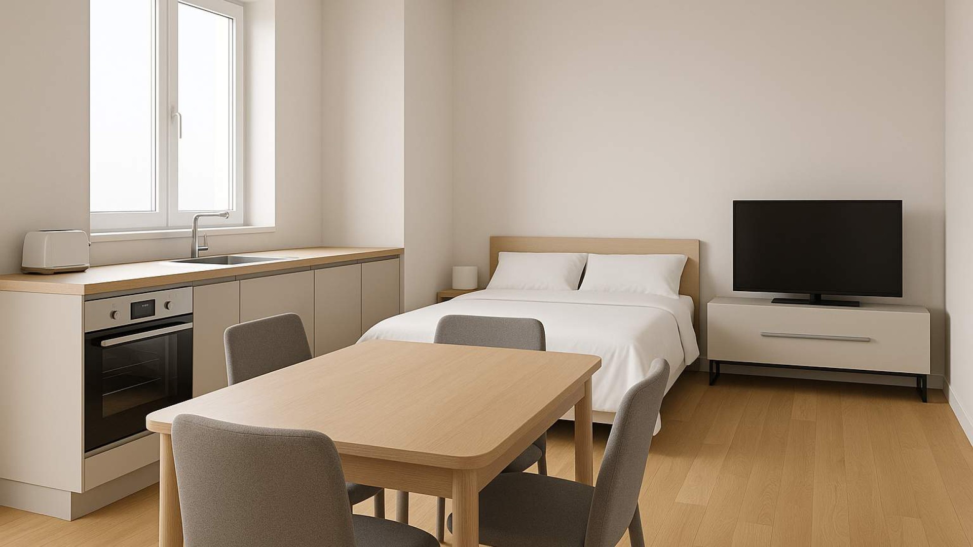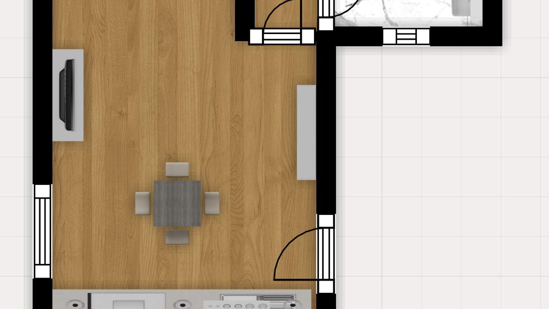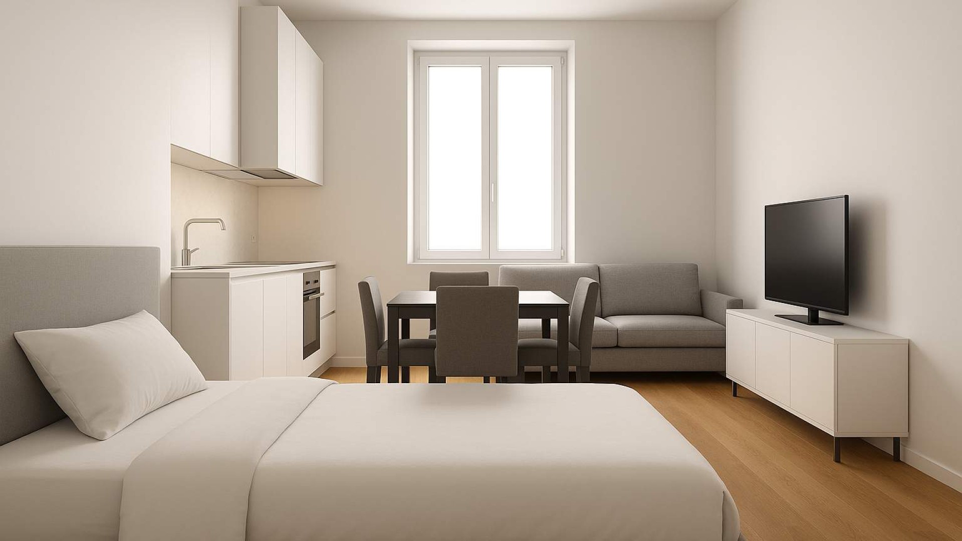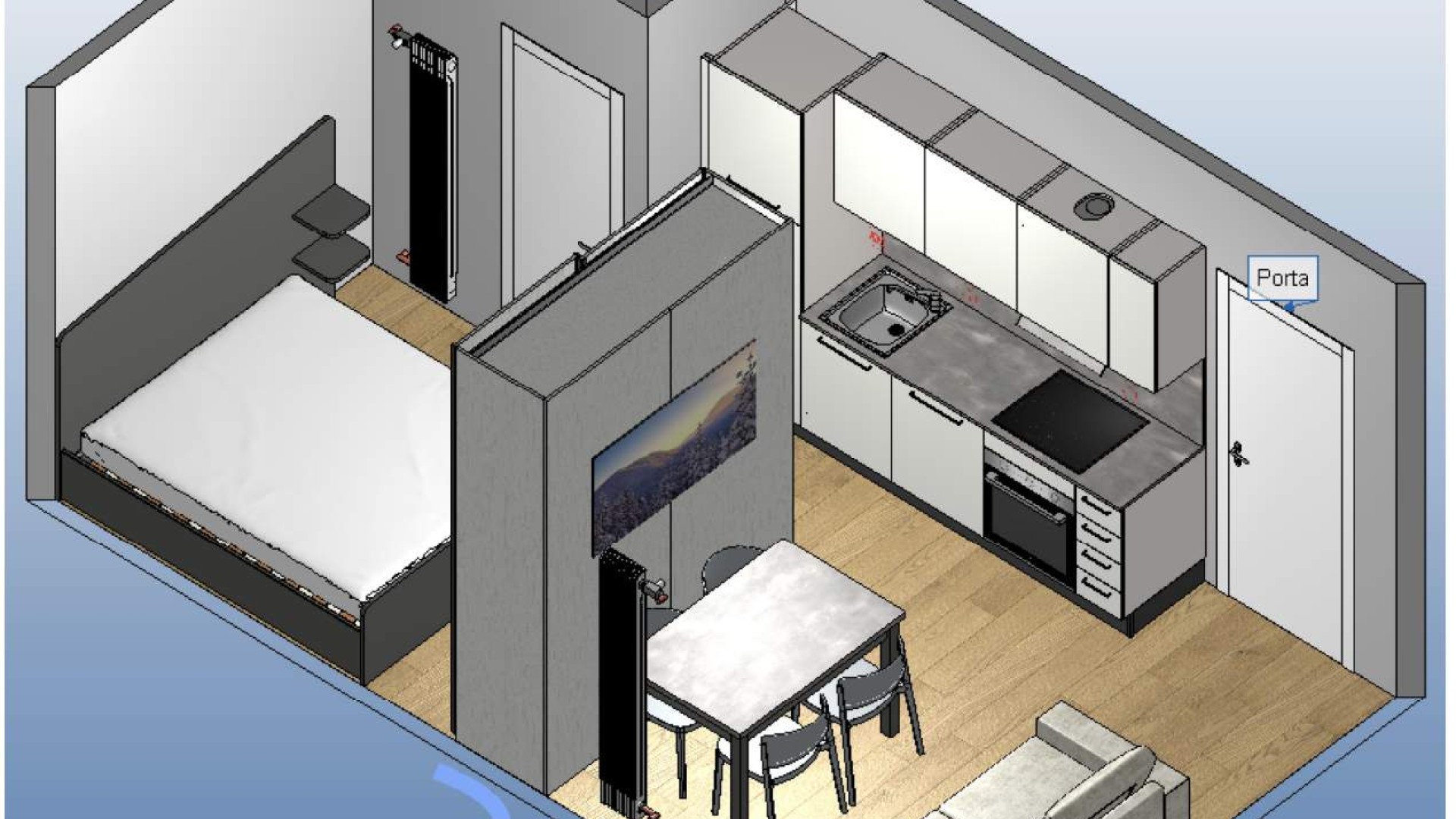 L’immobile, posto al primo piano, ha una superficie di circa 30 mq e si presenta come un ampio open space che integra armoniosamente zona giorno, cucina a vista e zona notte con comodo divano letto. Completano la proprietà un bagno finestrato interno e un secondo bagno di pertinenza, accessibile dal ballatoio comune.