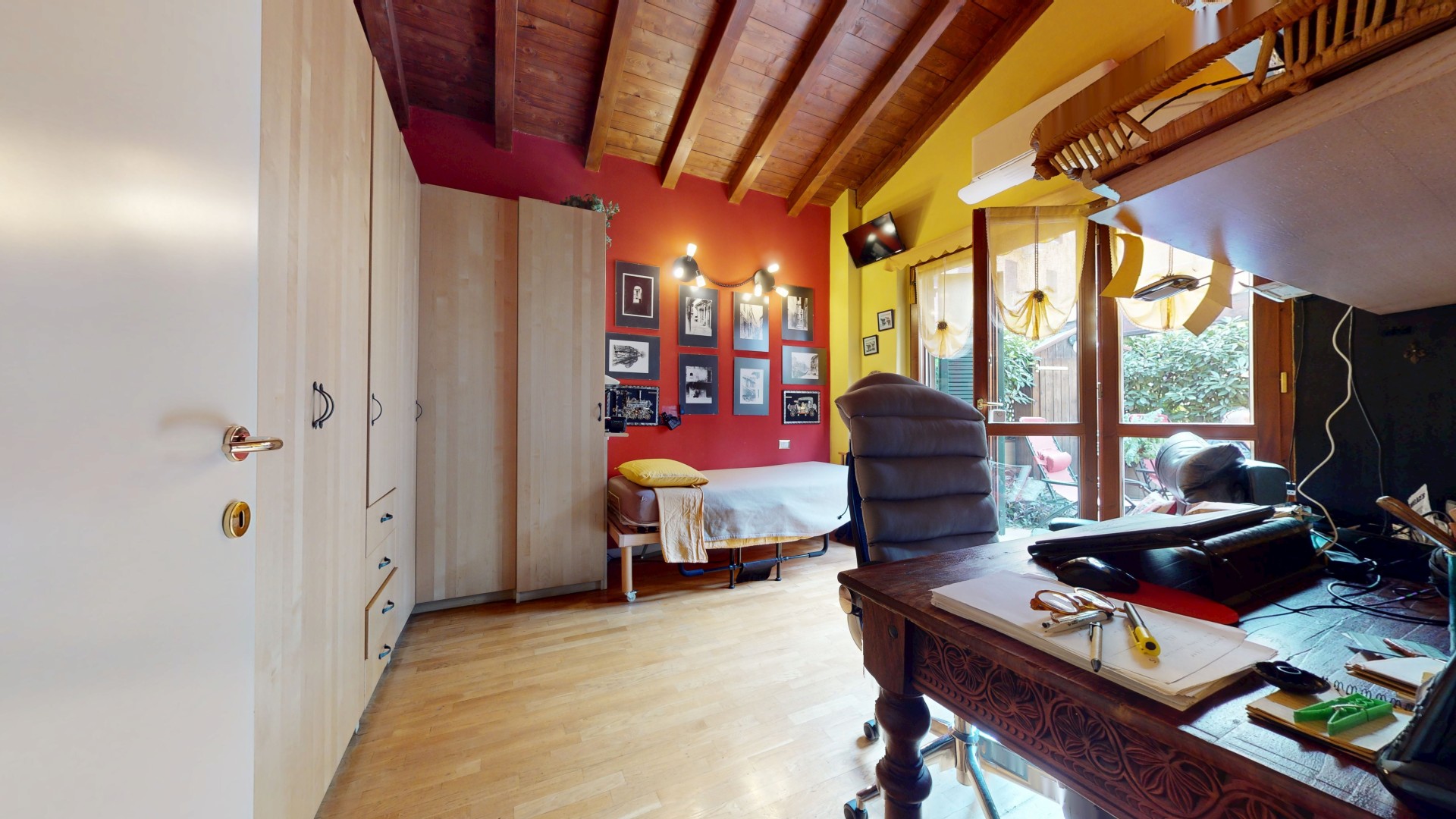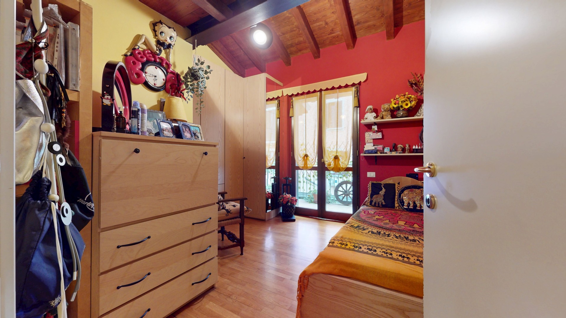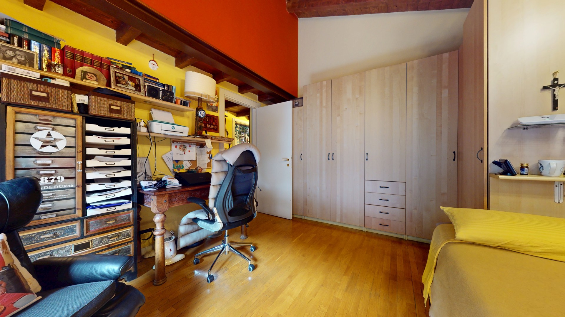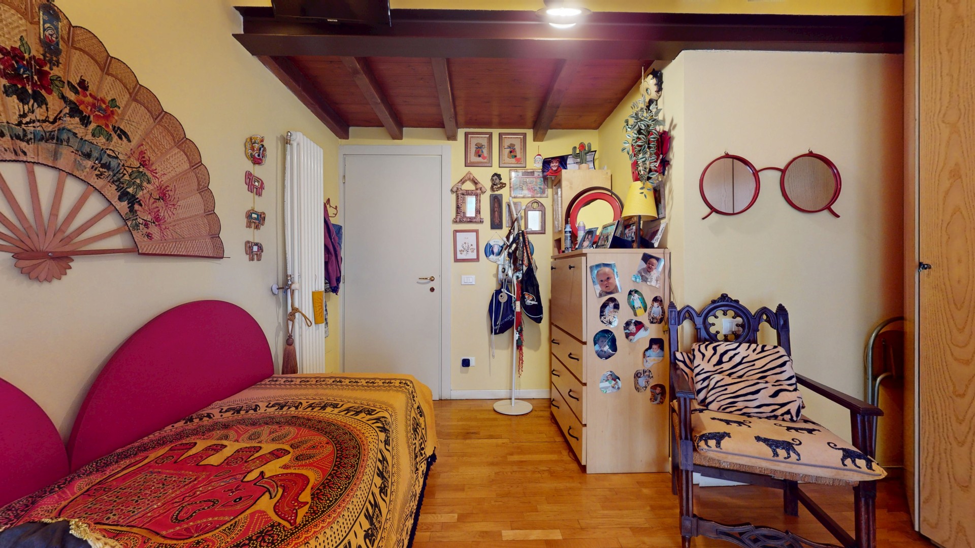La zona notte è ben distribuita e comprende due camere da letto, entrambe luminose e silenziose: la prima dispone di un balcone privato, mentre la seconda si affaccia direttamente sul terrazzo. Completa il piano un bagno finestrato, anch’esso con affaccio al terrazzo, che garantisce luce naturale.
