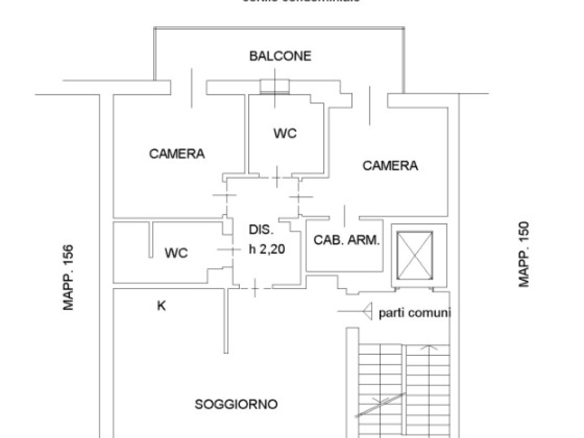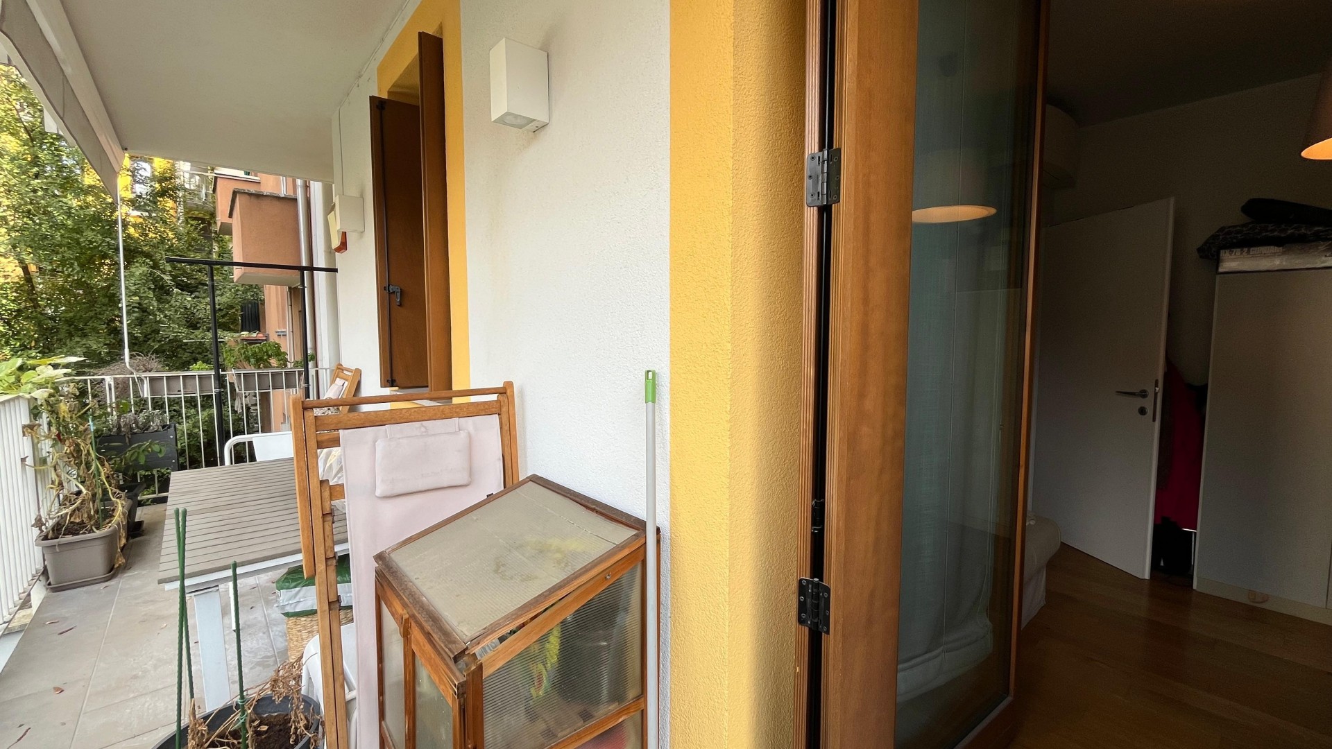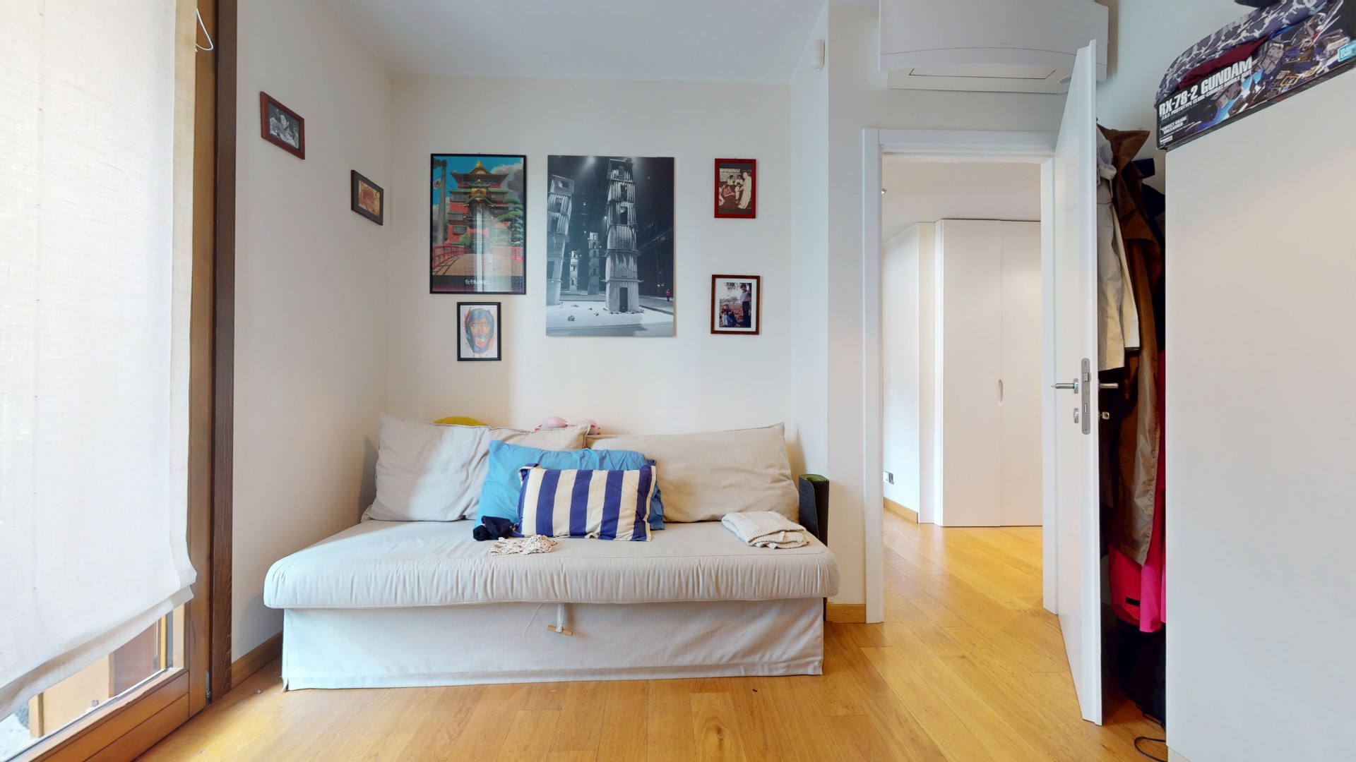 La zona giorno è particolarmente luminosa grazie alla presenza di tre porte-finestre con esposizione a est, che garantiscono un’ottima illuminazione naturale. Attraverso il disimpegno si accede al primo bagno cieco e a un ambiente lavanderia nascosto all’interno di un armadiatura su misura. Proseguendo, si raggiunge la zona notte, completamente esposta a ovest e affacciata su un balcone che serve tutti gli ambienti di questa ala. Qui troviamo: una prima camera da letto con accesso diretto al balcone, un secondo bagno, questo finestrato e una seconda camera matrimoniale, anch’essa con accesso al balcone e dotata di una comoda cabina armadio.