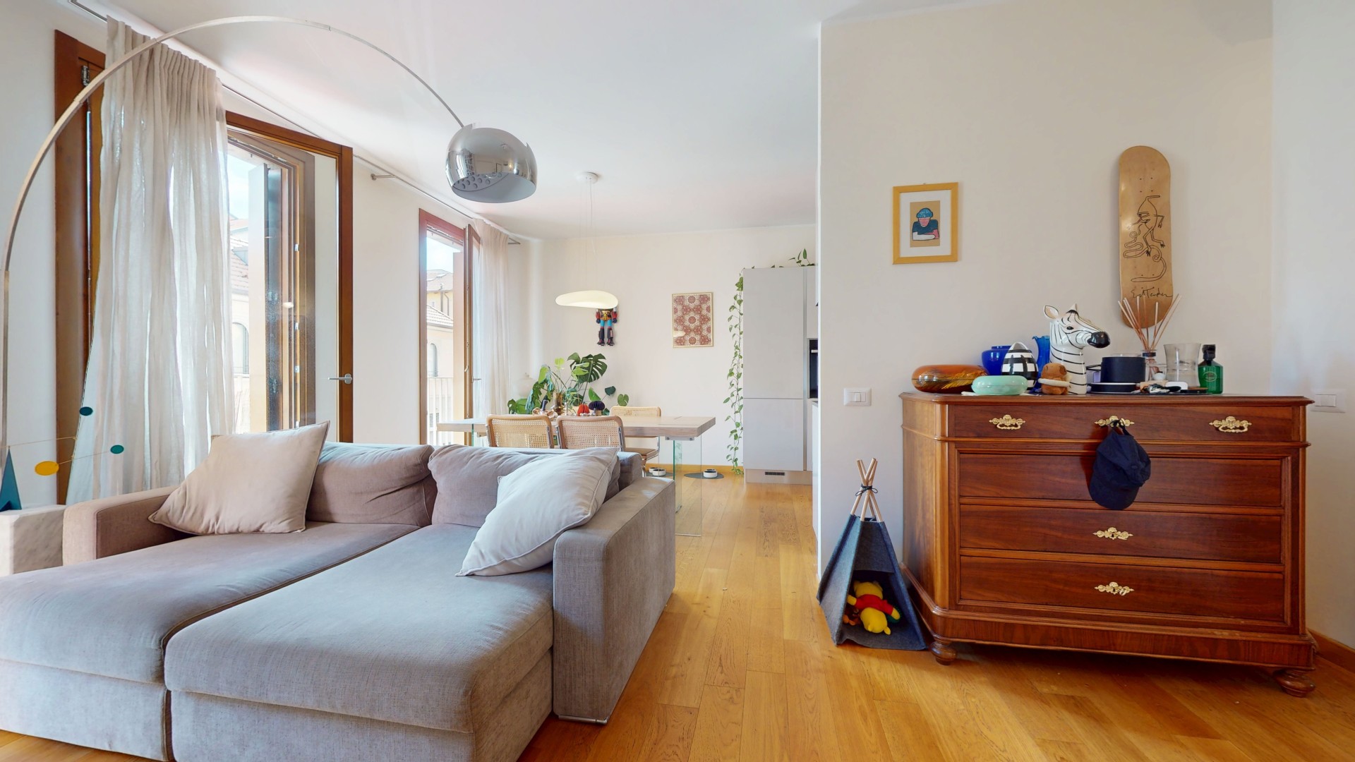 L'ingresso si apre su un luminoso soggiorno, dove è presente una cucina su misura ad angolo, elegantemente nascosta alla vista grazie a una parete posta frontalmente all’ingresso.