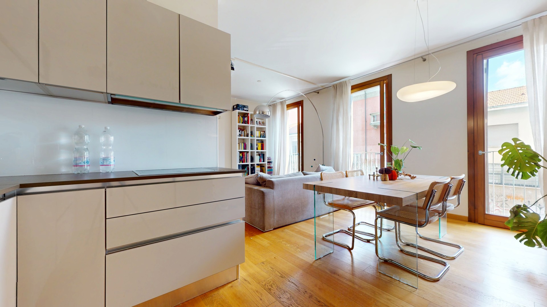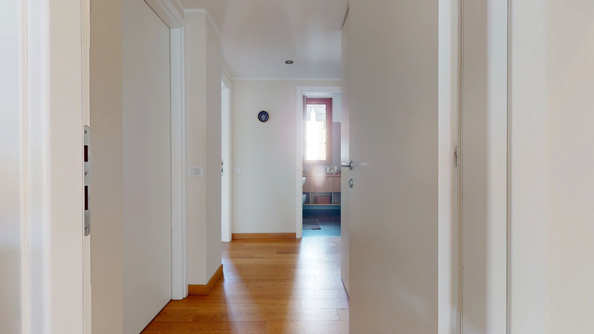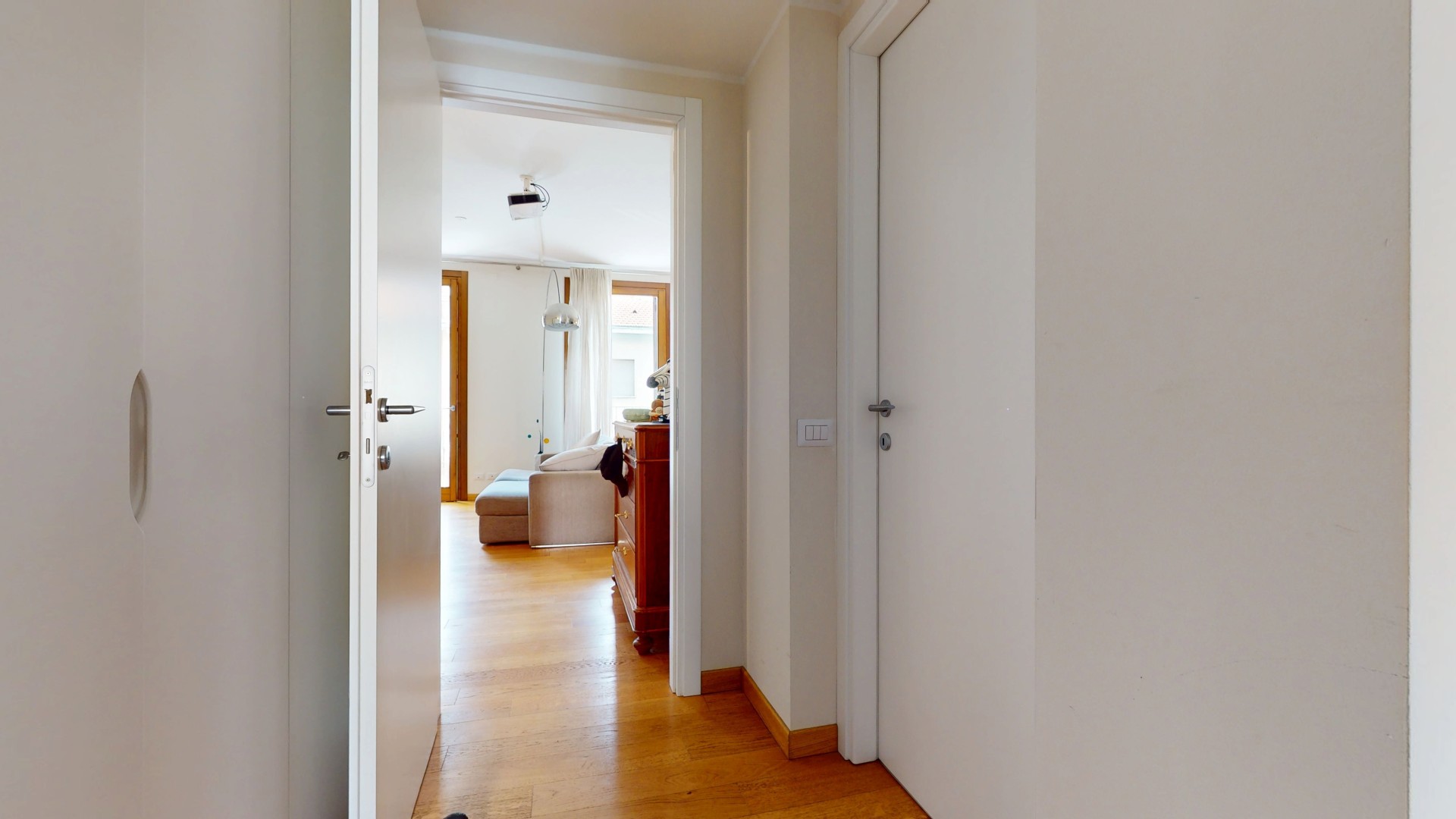 L’ingresso si apre su un comodo disimpegno che conduce alla zona giorno, ampia e particolarmente luminosa grazie alle grandi finestre e all’affaccio sul primo balcone. L’ambiente è valorizzato da una cucina a vista, perfettamente integrata nello spazio living. A completare questa zona troviamo un primo bagno e un pratico spazio lavanderia. Un piccolo corridoio accompagna alla zona notte, composta da due camere da letto spaziose e luminose; una delle due dispone di bagno en suite e di accesso diretto al secondo balcone.