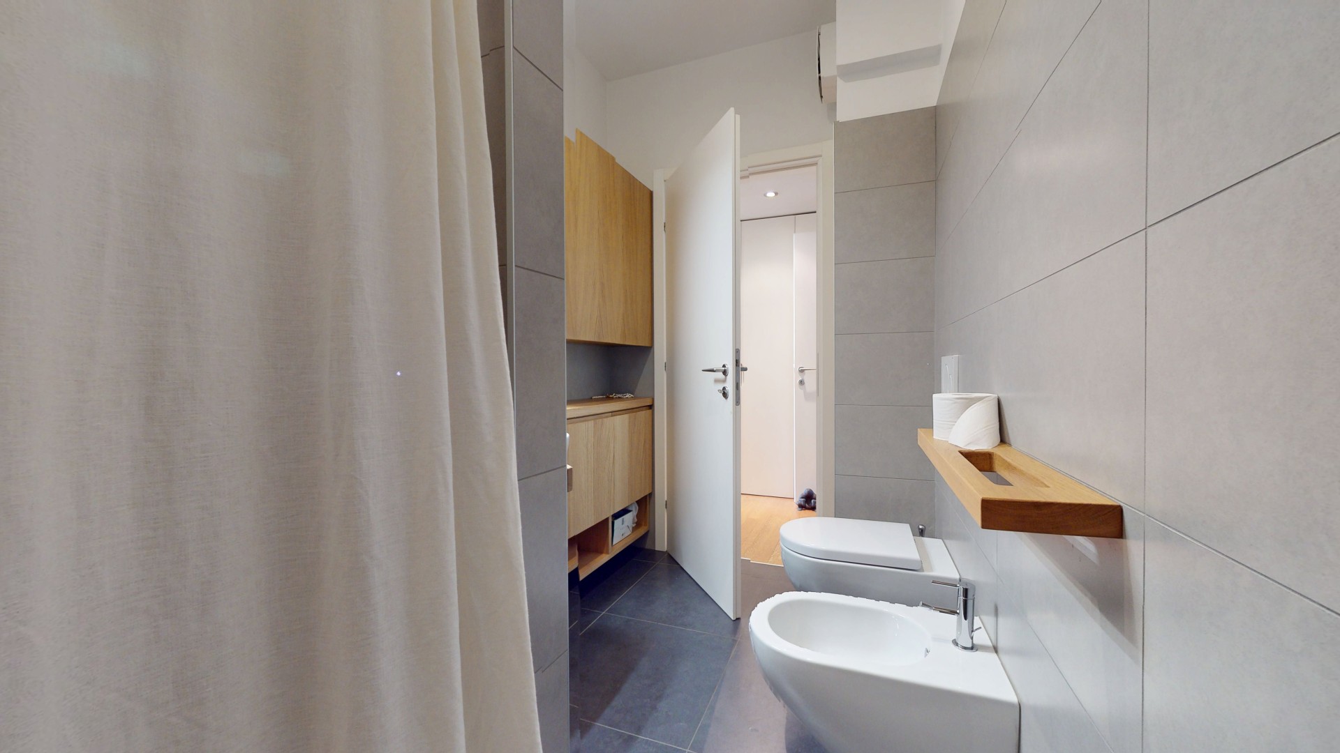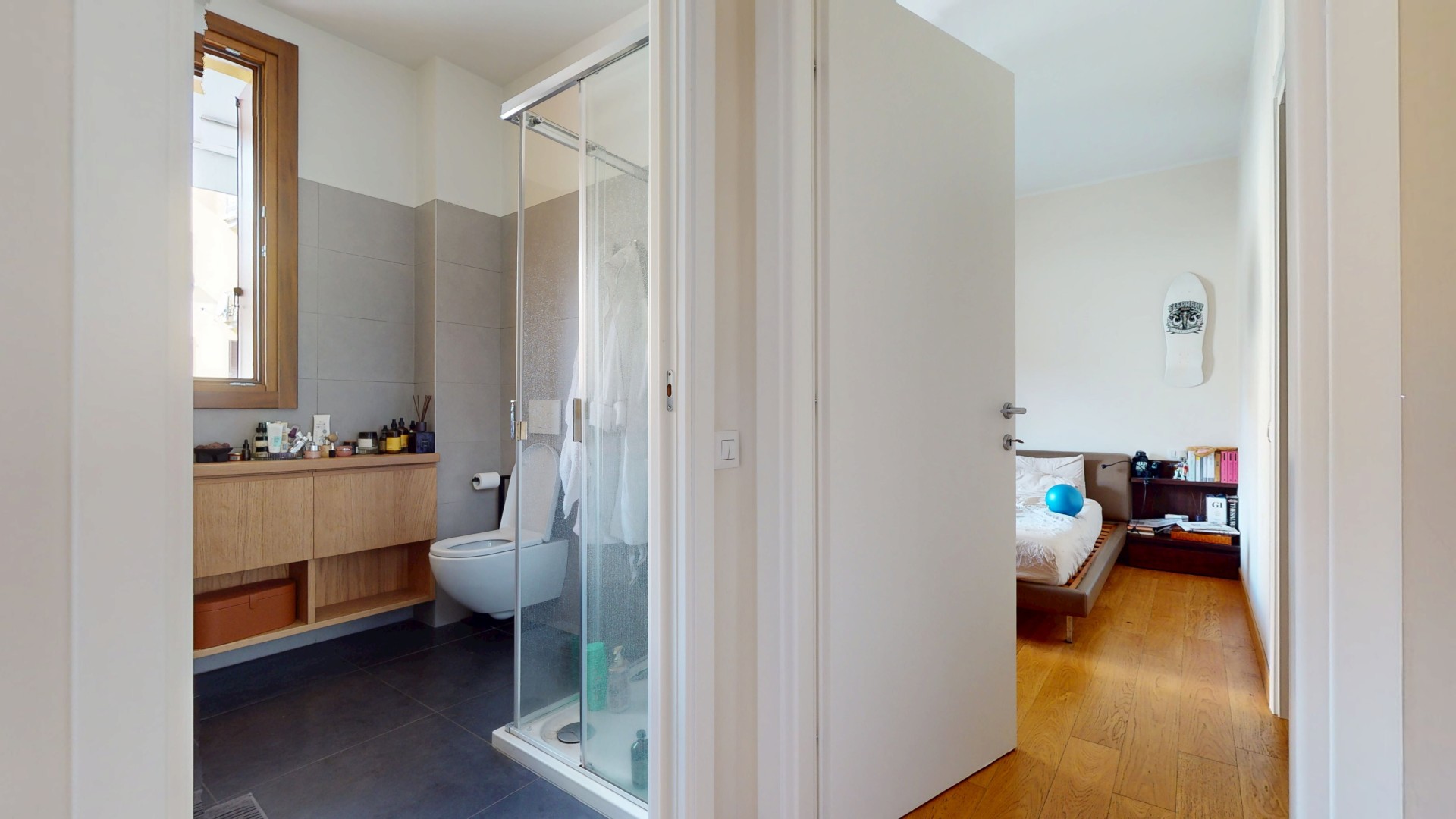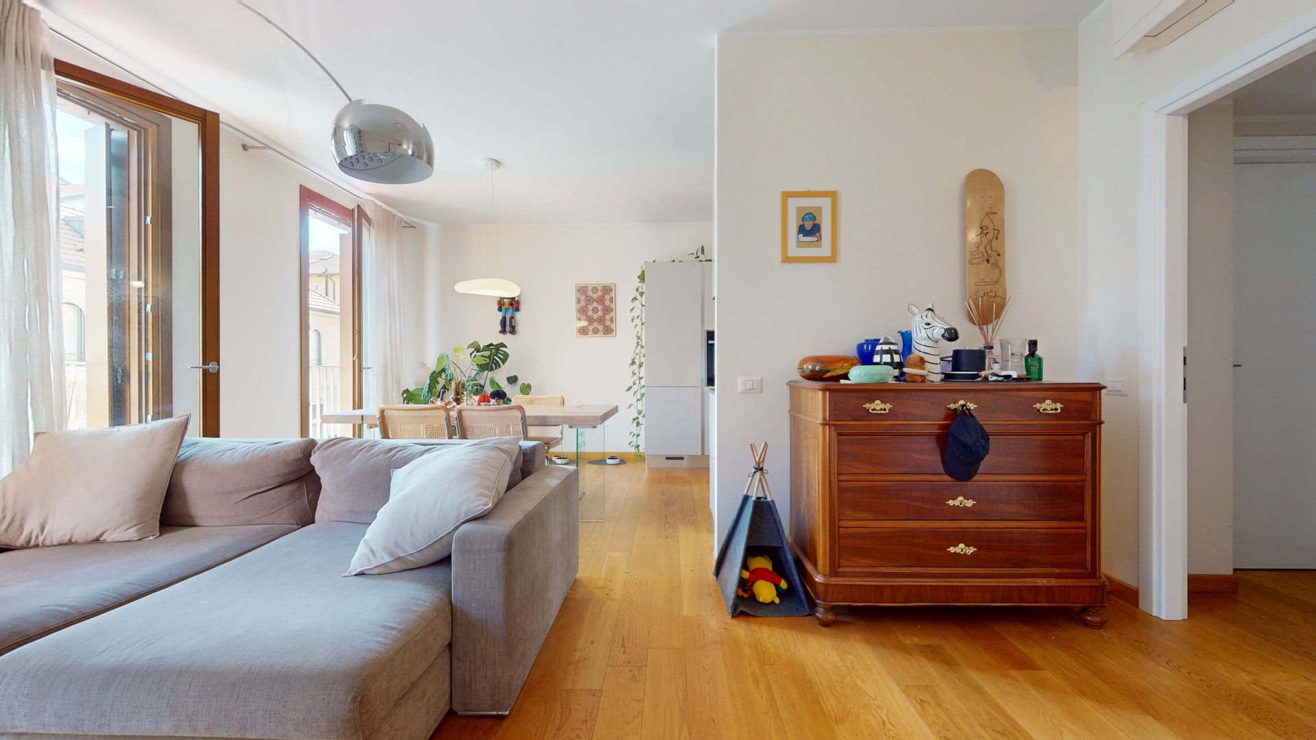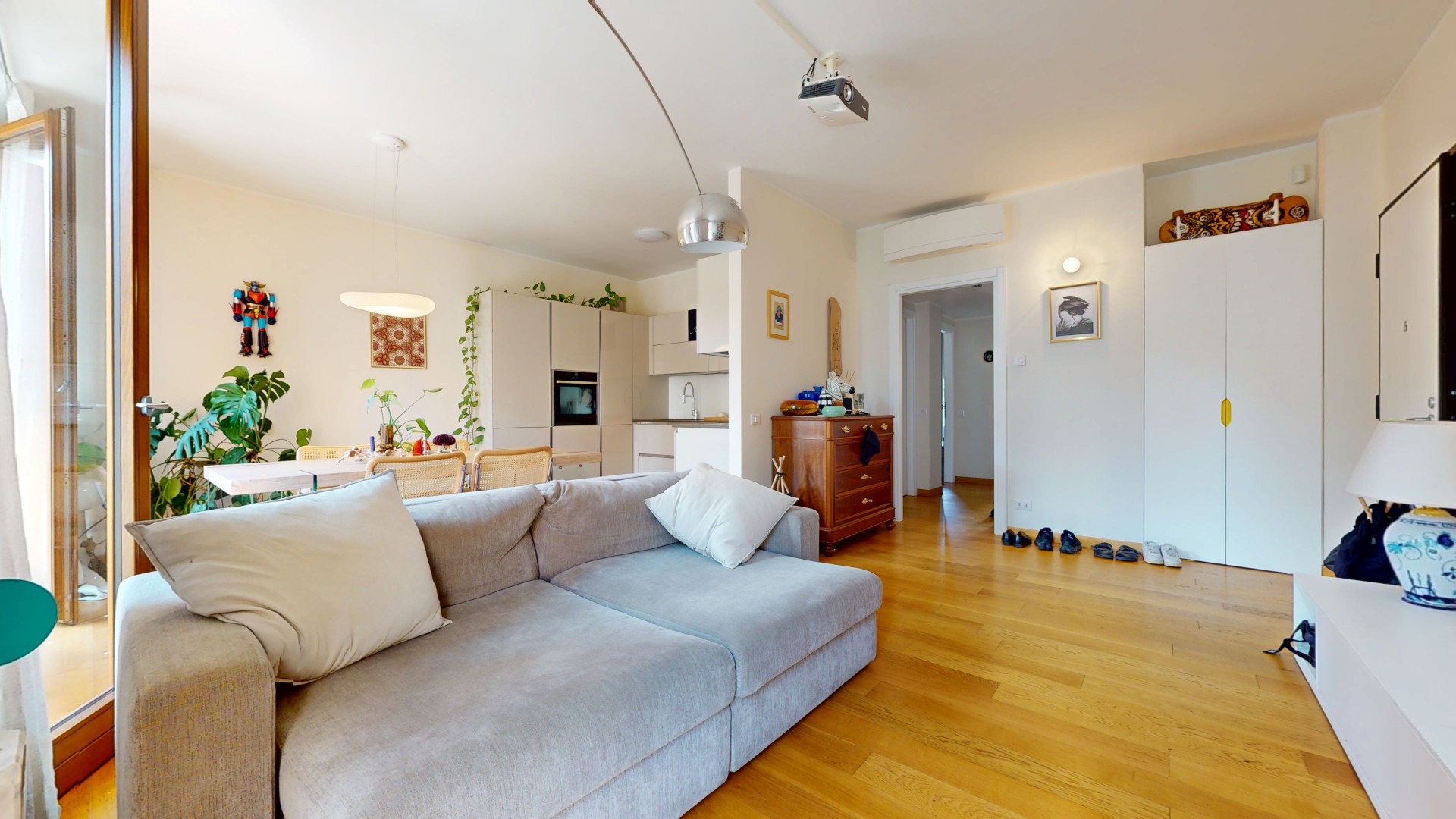 L’ingresso si apre su un comodo disimpegno che conduce alla zona giorno, ampia e particolarmente luminosa grazie alle grandi finestre e all’affaccio sul primo balcone. L’ambiente è valorizzato da una cucina a vista, perfettamente integrata nello spazio living. A completare questa zona troviamo un primo bagno e un pratico spazio lavanderia. Un piccolo corridoio accompagna alla zona notte, composta da due camere da letto spaziose e luminose; una delle due dispone di bagno en suite e di accesso diretto al secondo balcone.