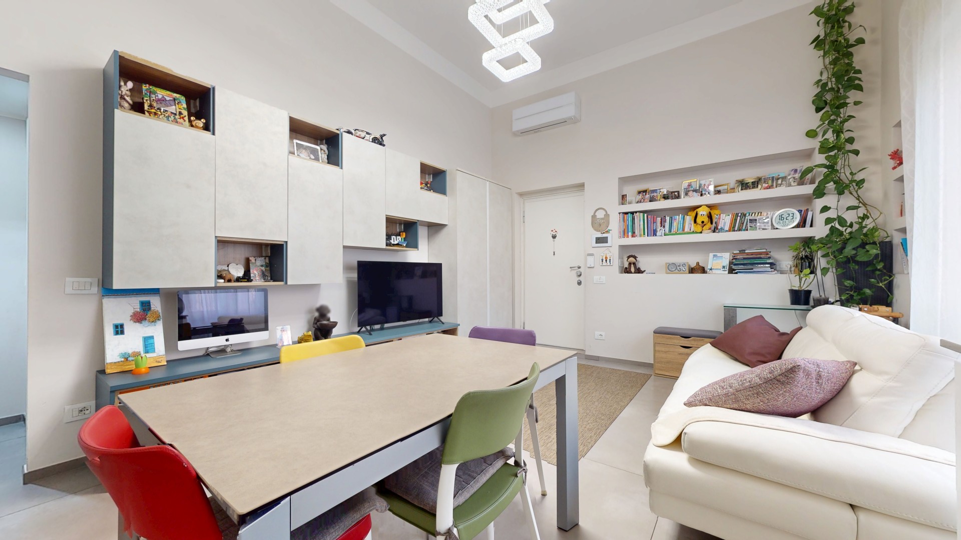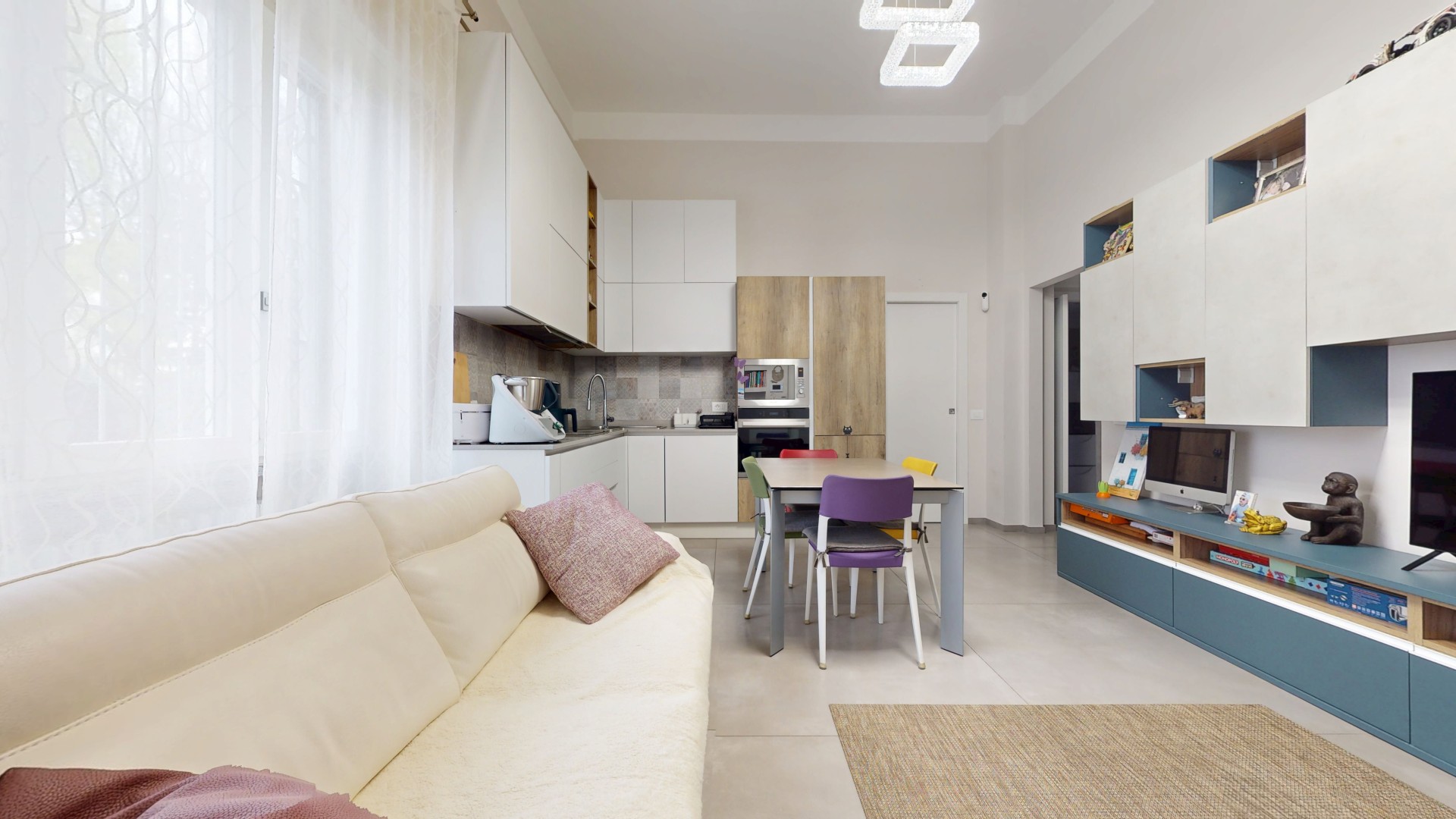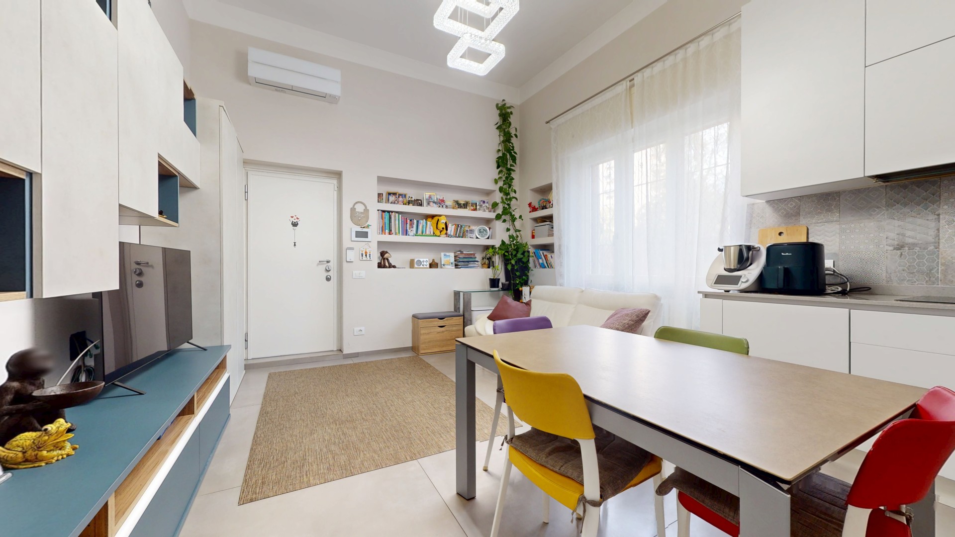 L’ingresso che si apre su soggiorno con cucina a vista, arricchito da un'ampia finestra, rappresenta il cuore della casa, uno spazio accogliente e ben distribuito dove la luce naturale valorizza ogni angolo, rendendolo perfetto sia per momenti di relax che per ricevere ospiti.