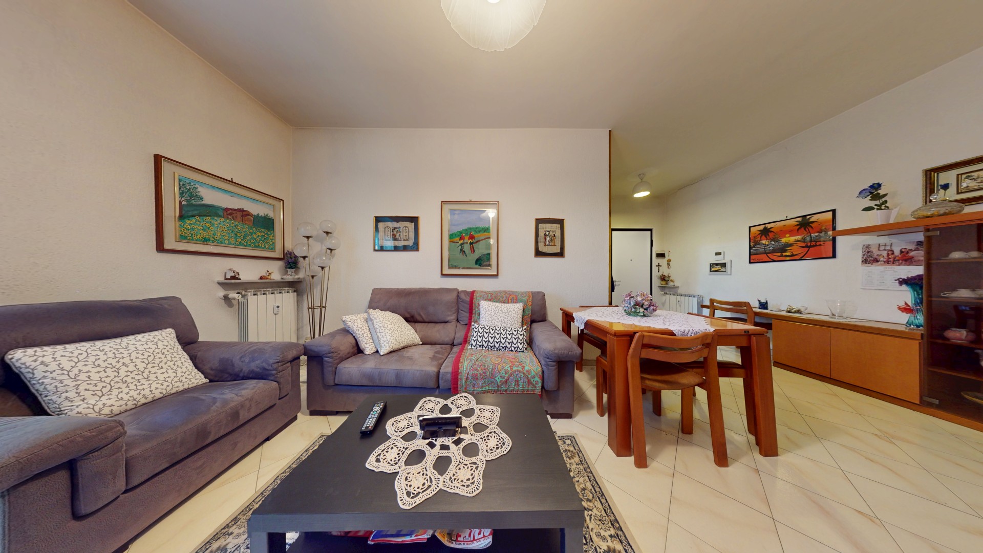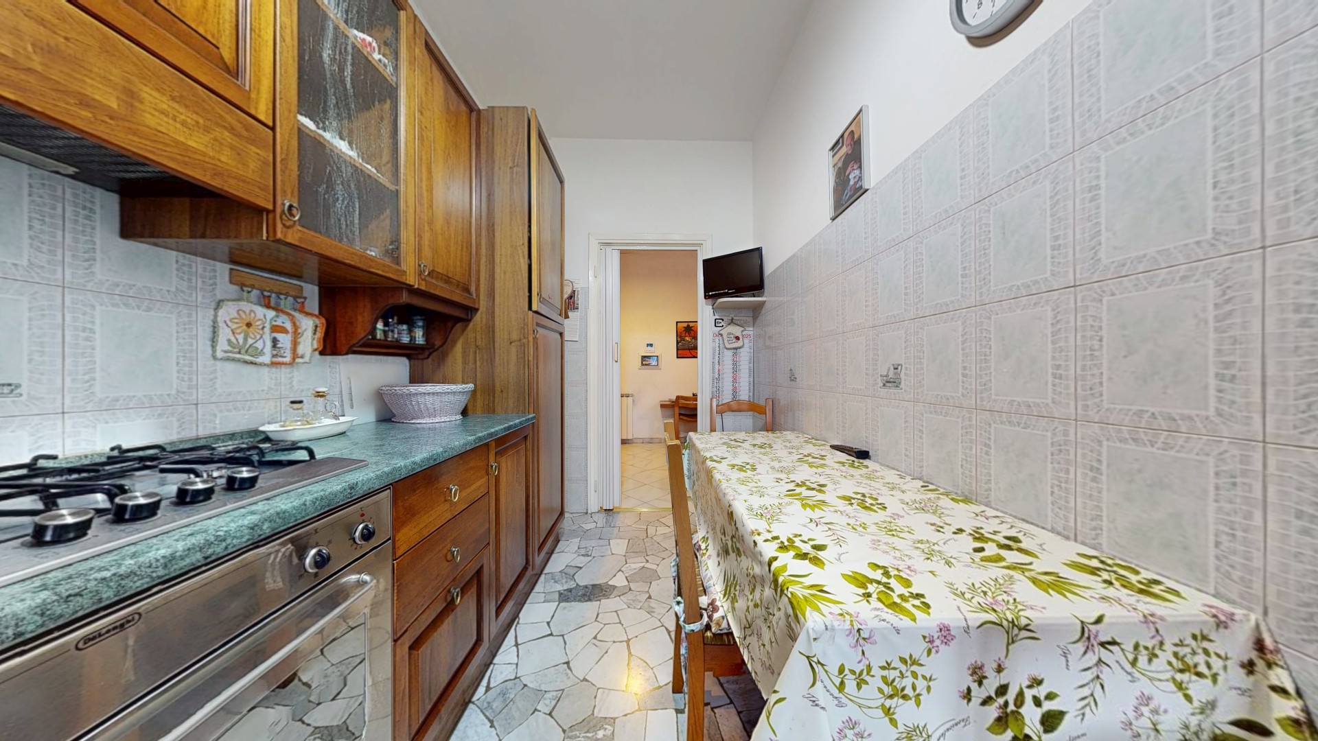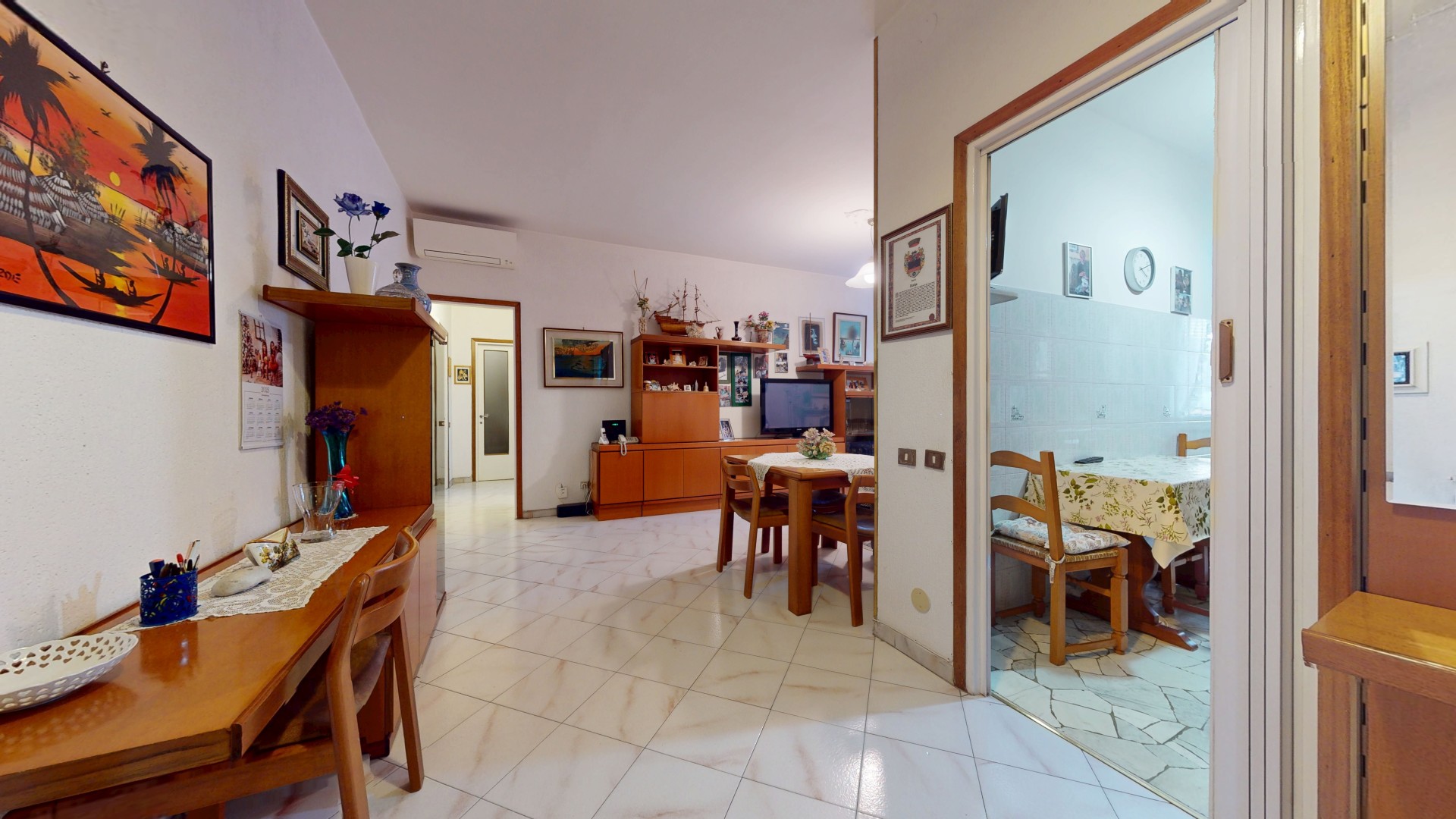 L’ingresso dell’appartamento si apre direttamente sulla zona giorno, ben organizzata e accogliente. Qui si trova una comoda cucina abitabile, dotata di finestra e con spazio sufficiente per un tavolo da pranzo, ideale per la vita quotidiana. A seguire, un soggiorno ampio e luminoso con porta finestra che consente l’accesso al balcone, con affaccio sul curato giardino interno condominiale, garantendo tranquillità e riservatezza.