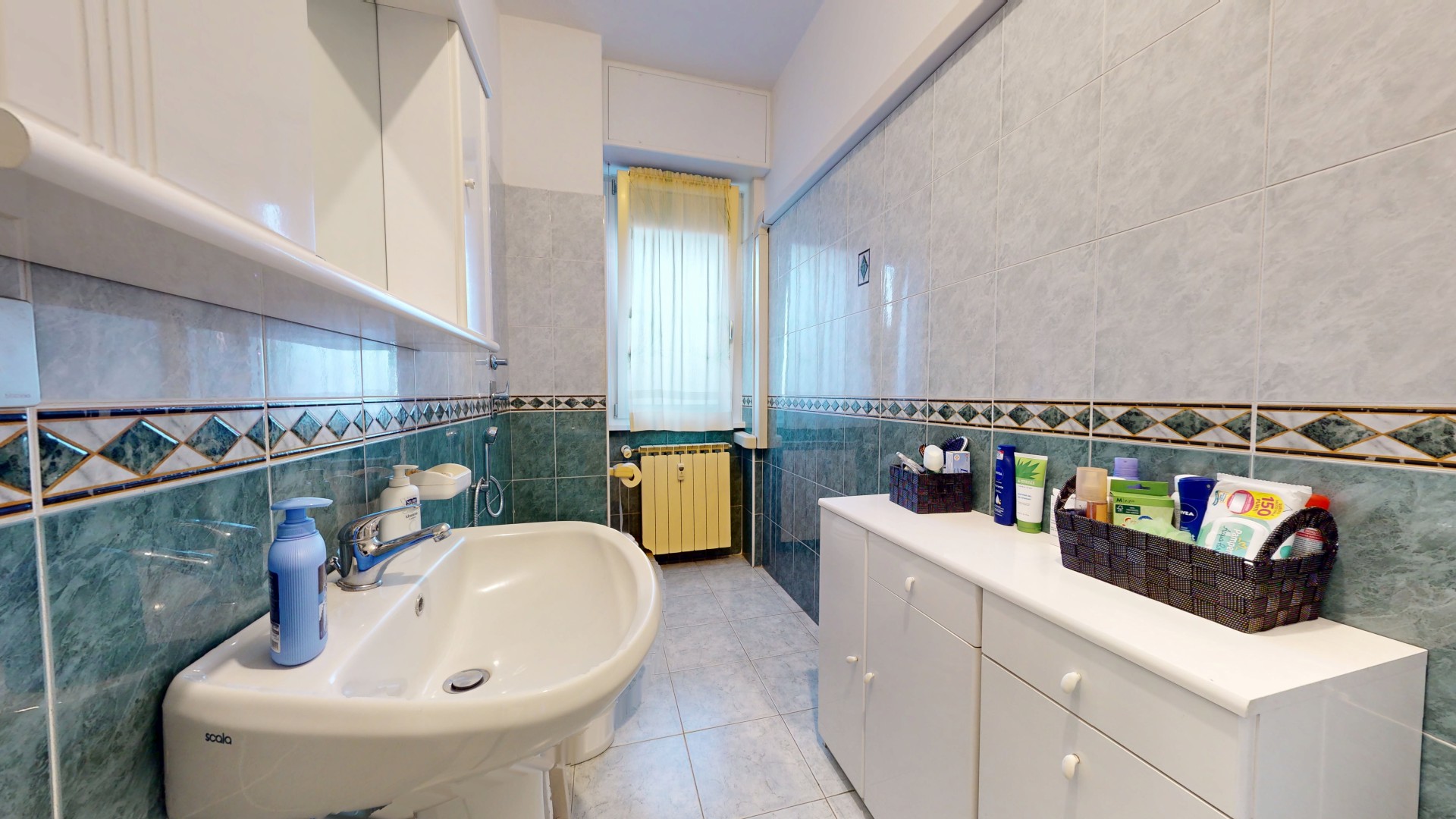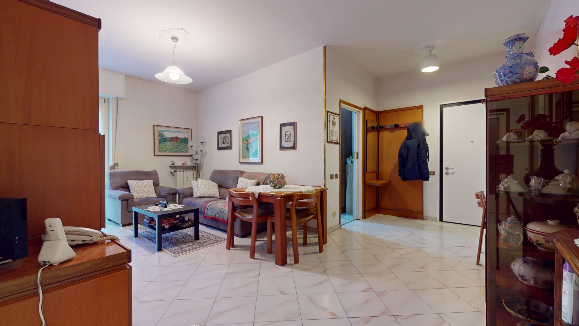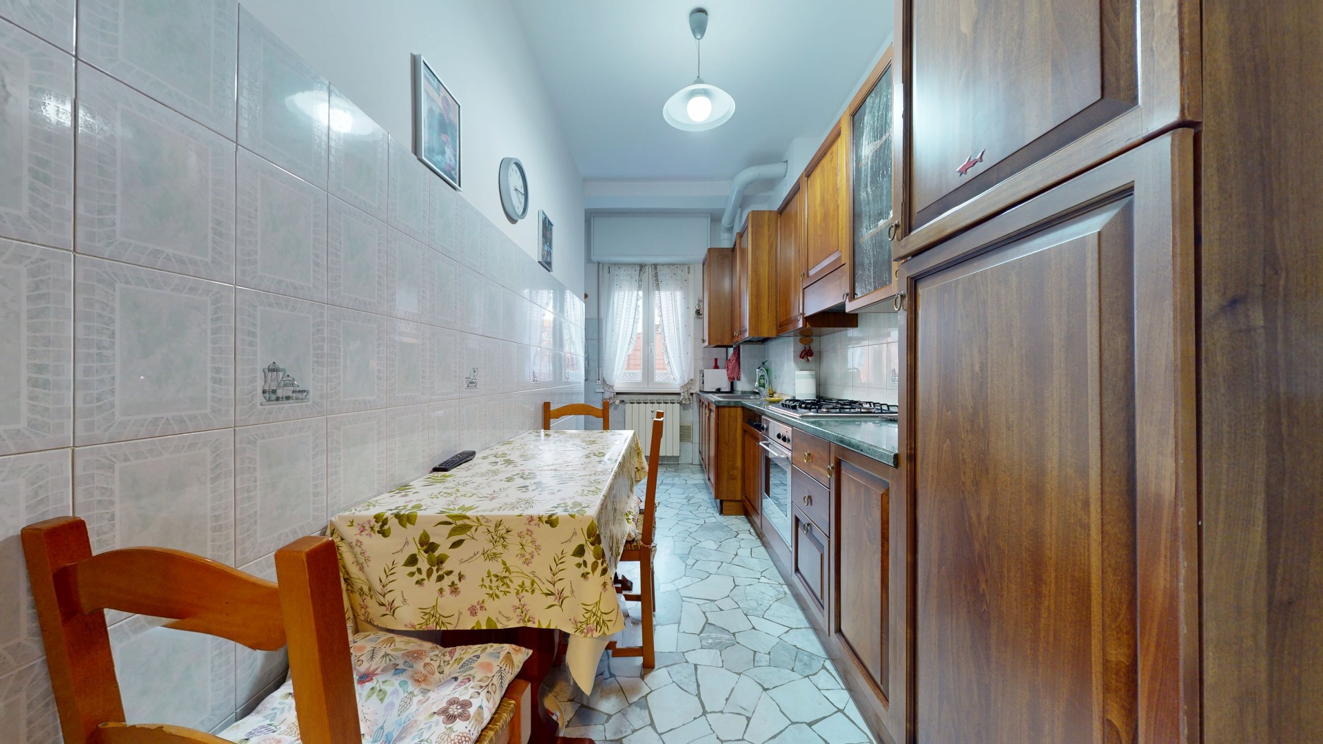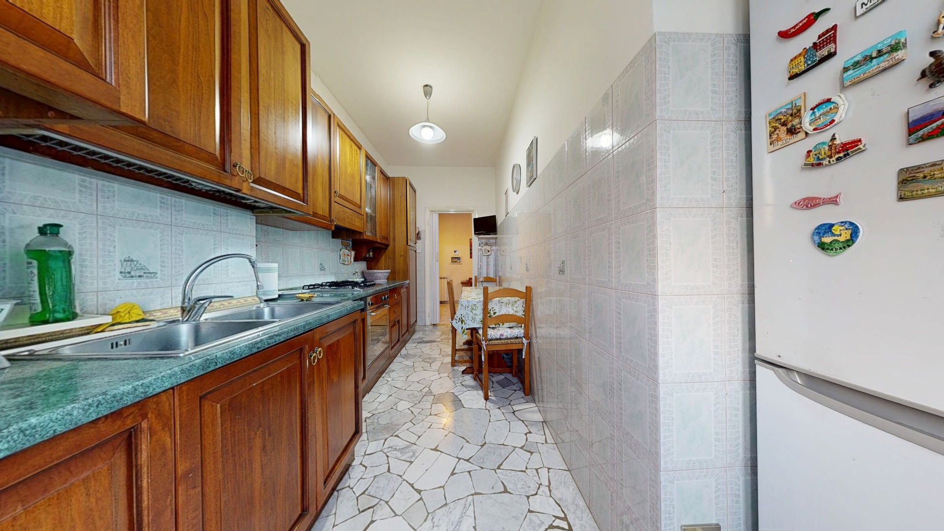 L’ingresso dell’appartamento si apre direttamente sulla zona giorno, ben organizzata e accogliente. Qui si trova una comoda cucina abitabile, dotata di finestra e con spazio sufficiente per un tavolo da pranzo, ideale per la vita quotidiana. A seguire, un soggiorno ampio e luminoso con porta finestra che consente l’accesso al balcone, con affaccio sul curato giardino interno condominiale, garantendo tranquillità e riservatezza.