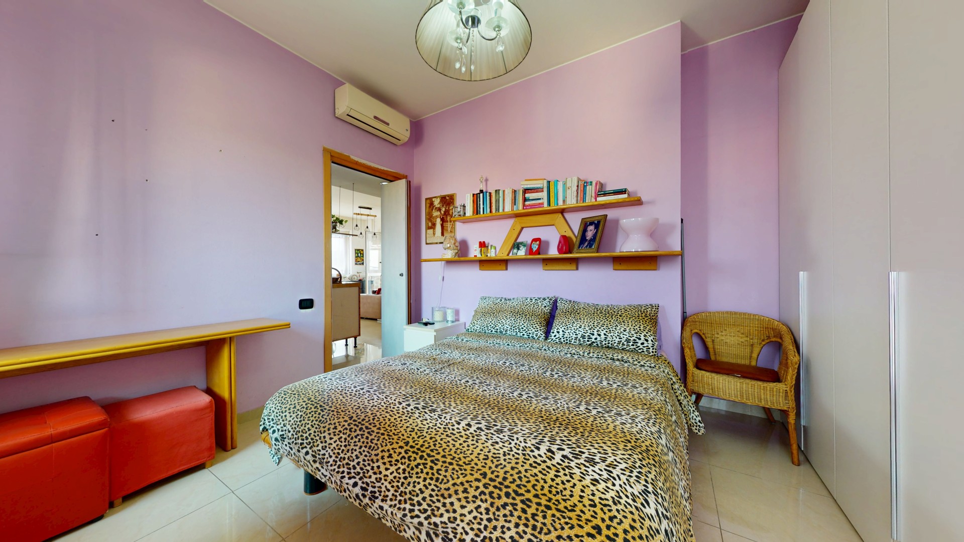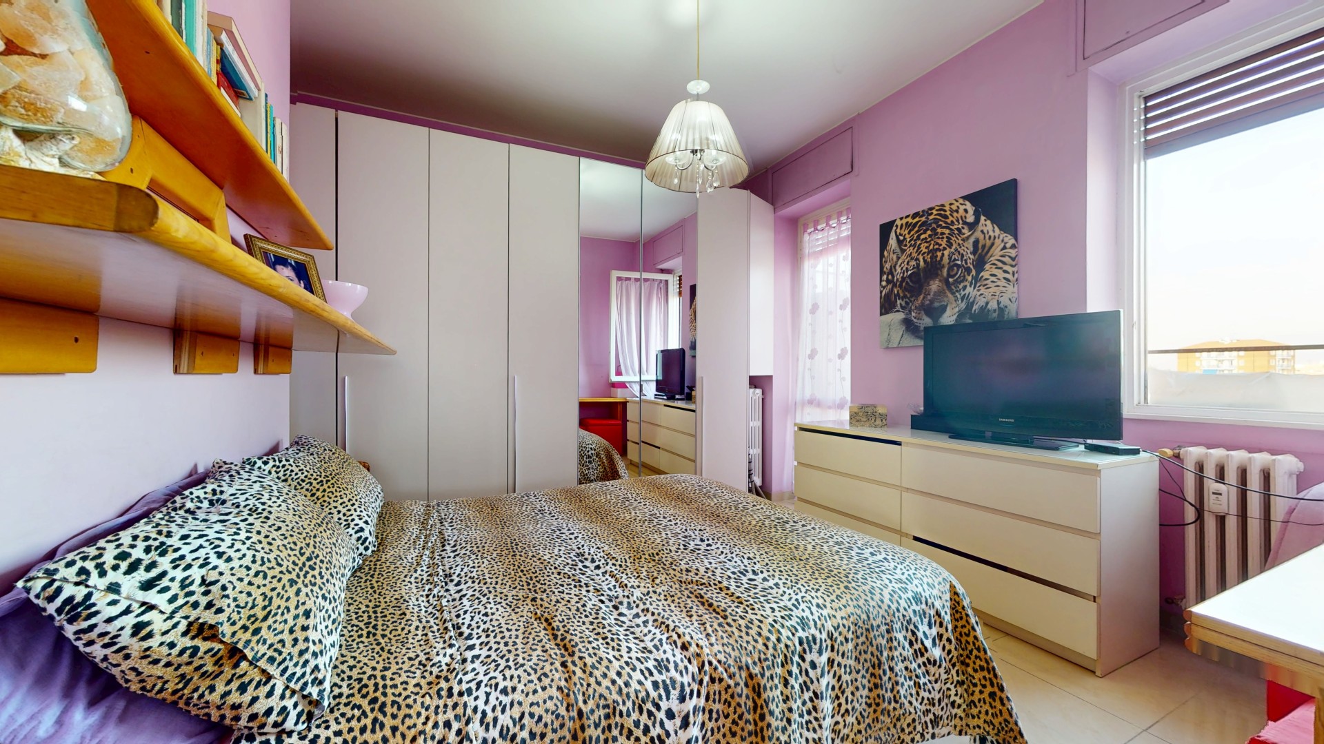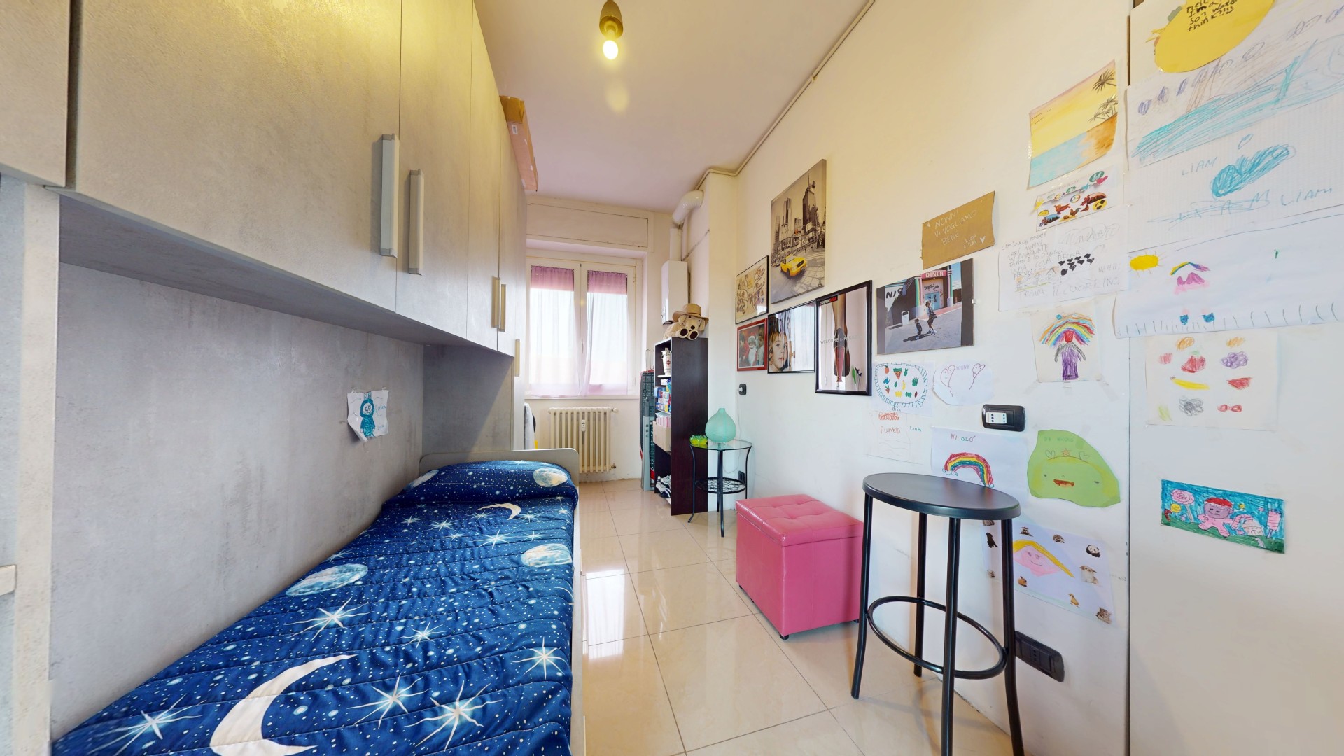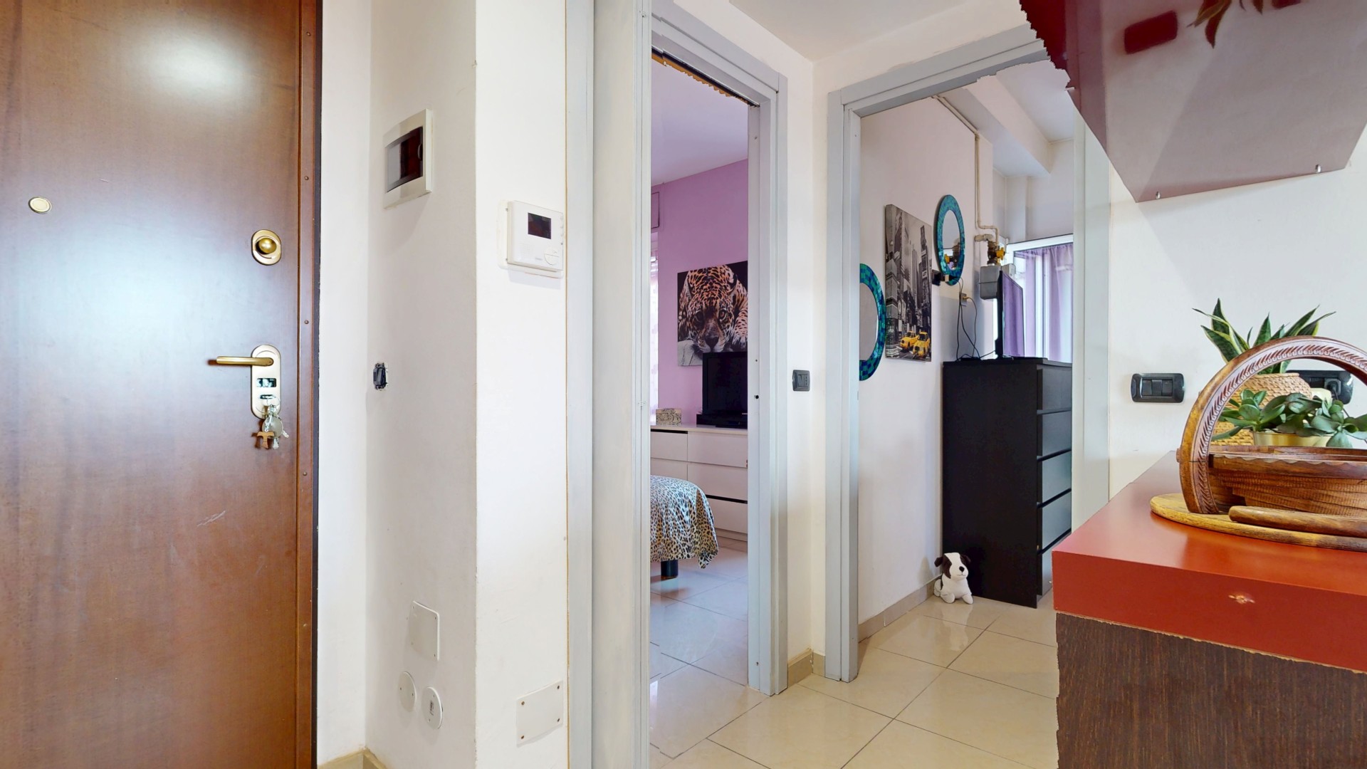 Il disimpegno porta alle due camere, entrambe dotate di una finestra ed una porta finestra che da accesso al balcone donando luminosità naturale agli ambienti.