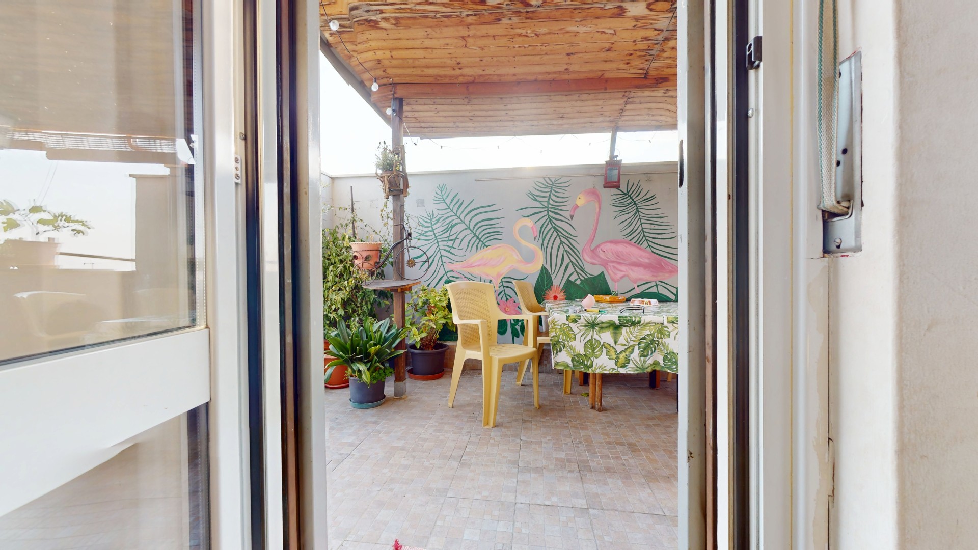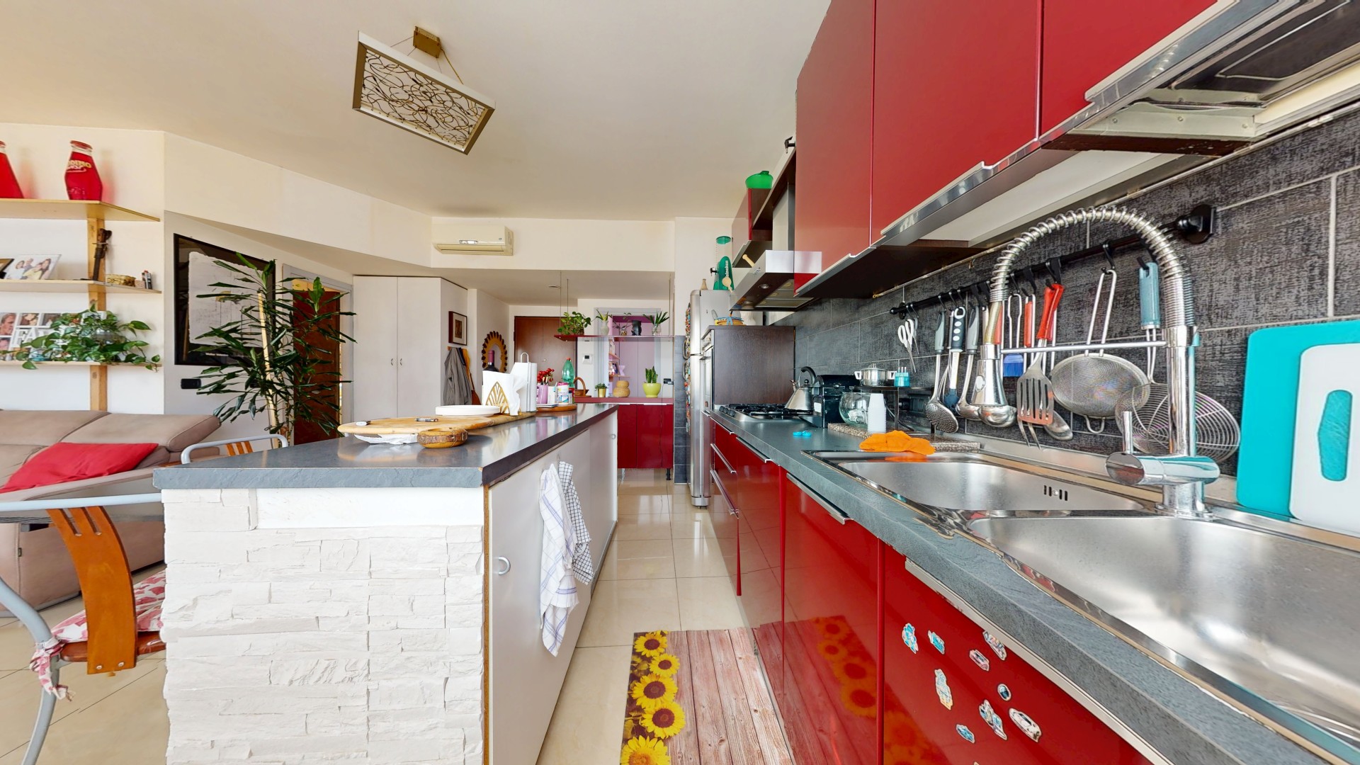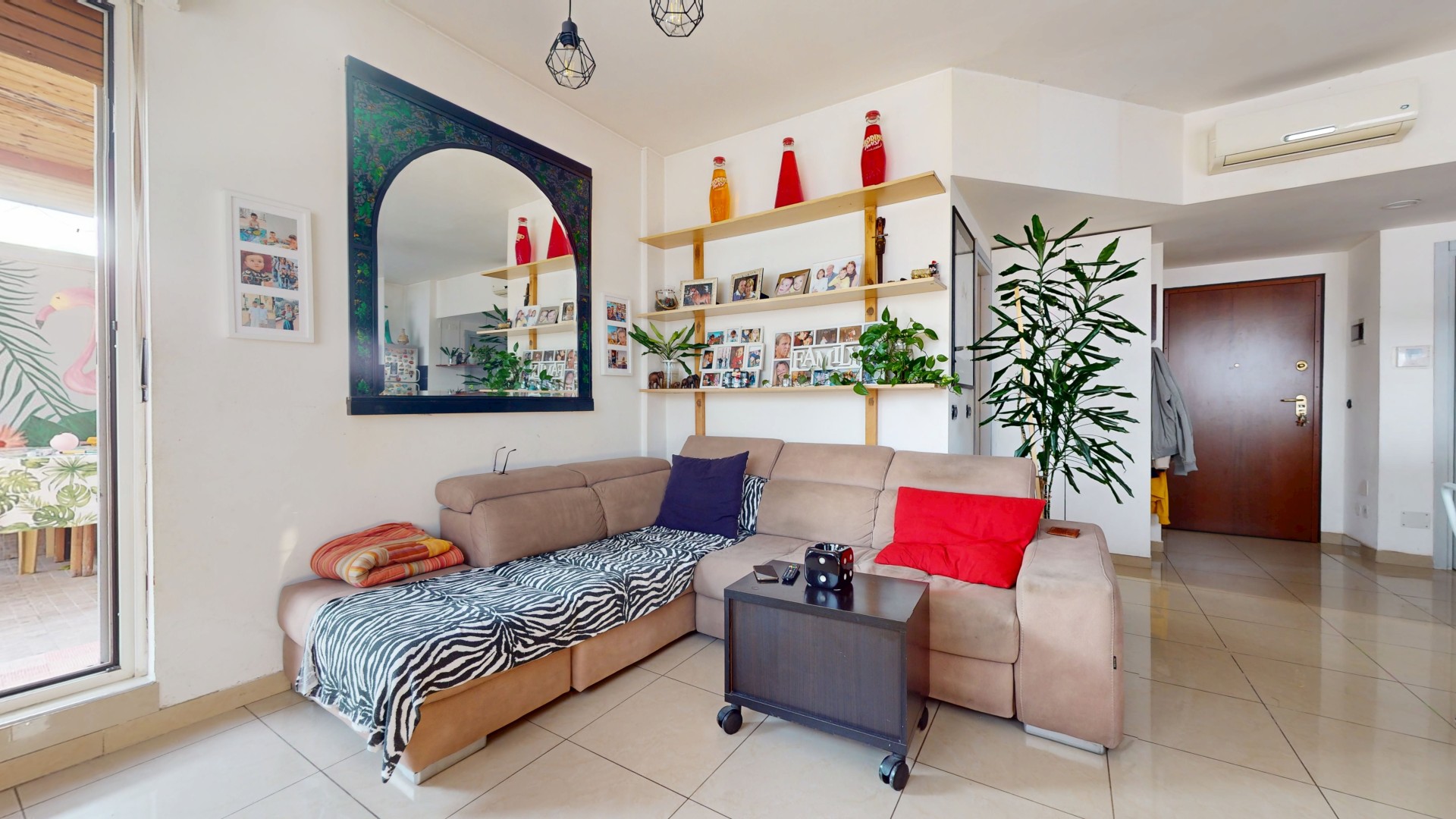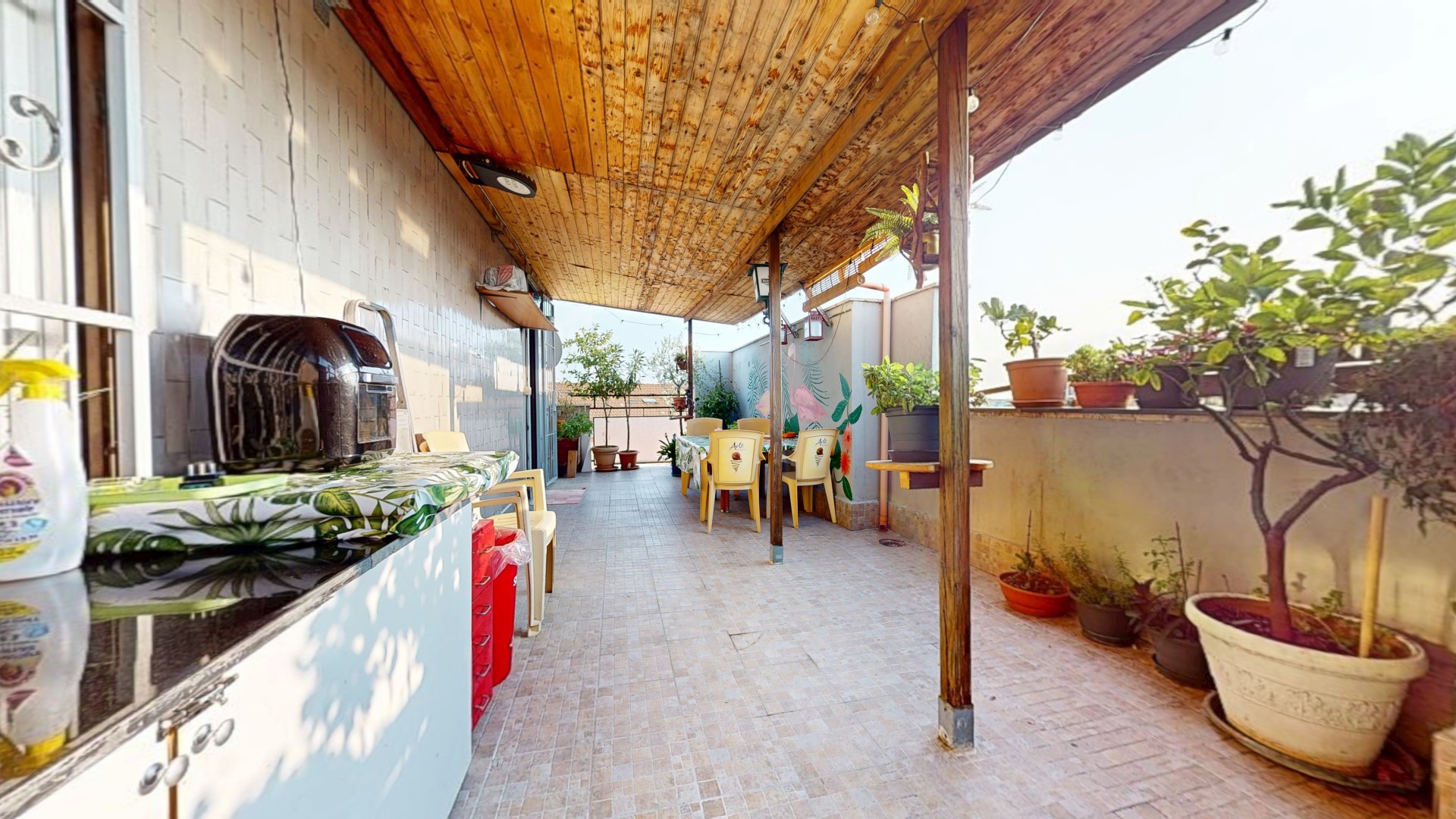 L’appartamento si distingue per una zona giorno ampia e luminosa, con cucina a vista, doppie finestre e porta finestra che conducono a un terrazzo di circa 30mq, coperto con una struttura mobile in legno e impreziosito da una vista panoramica.