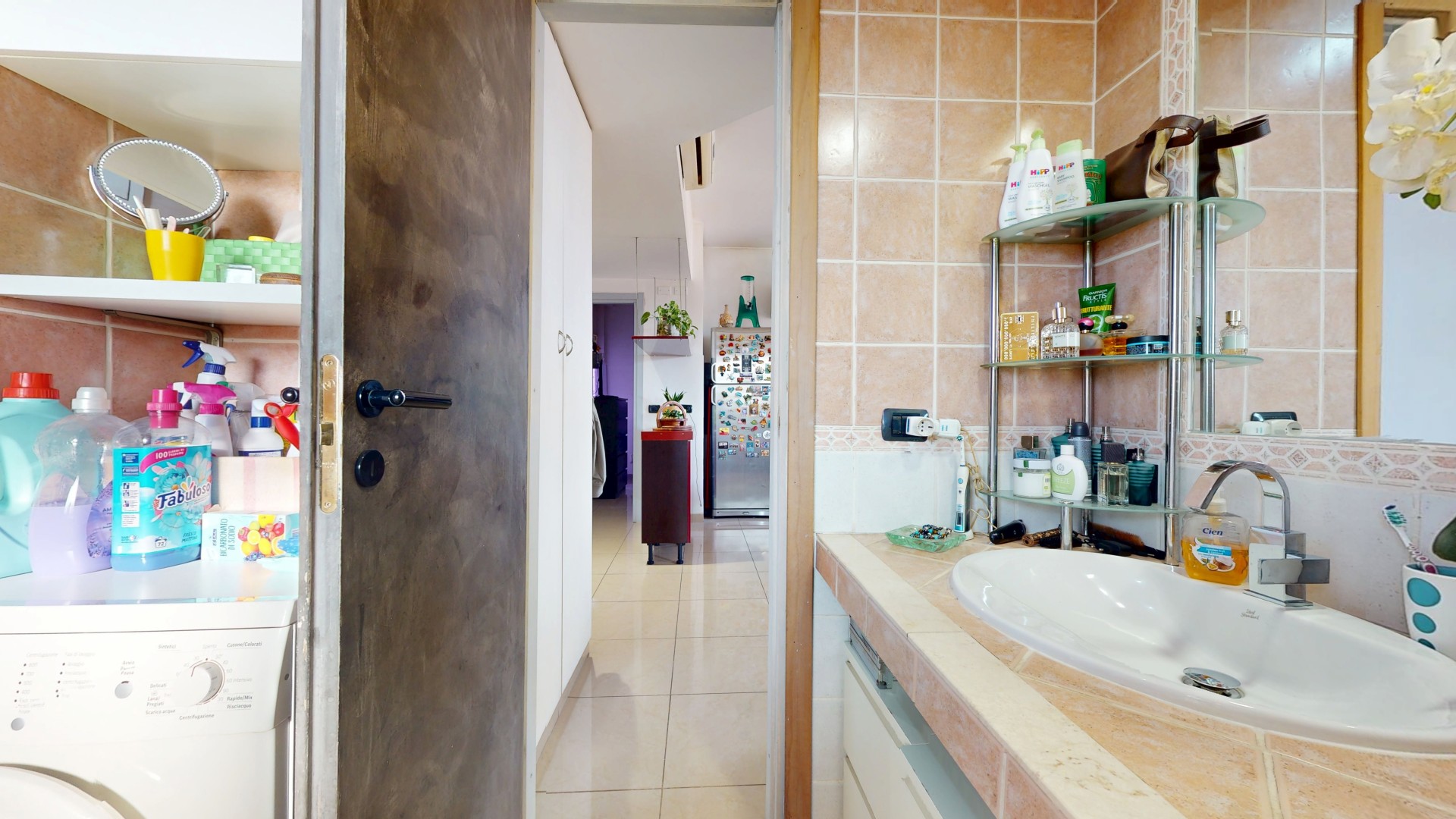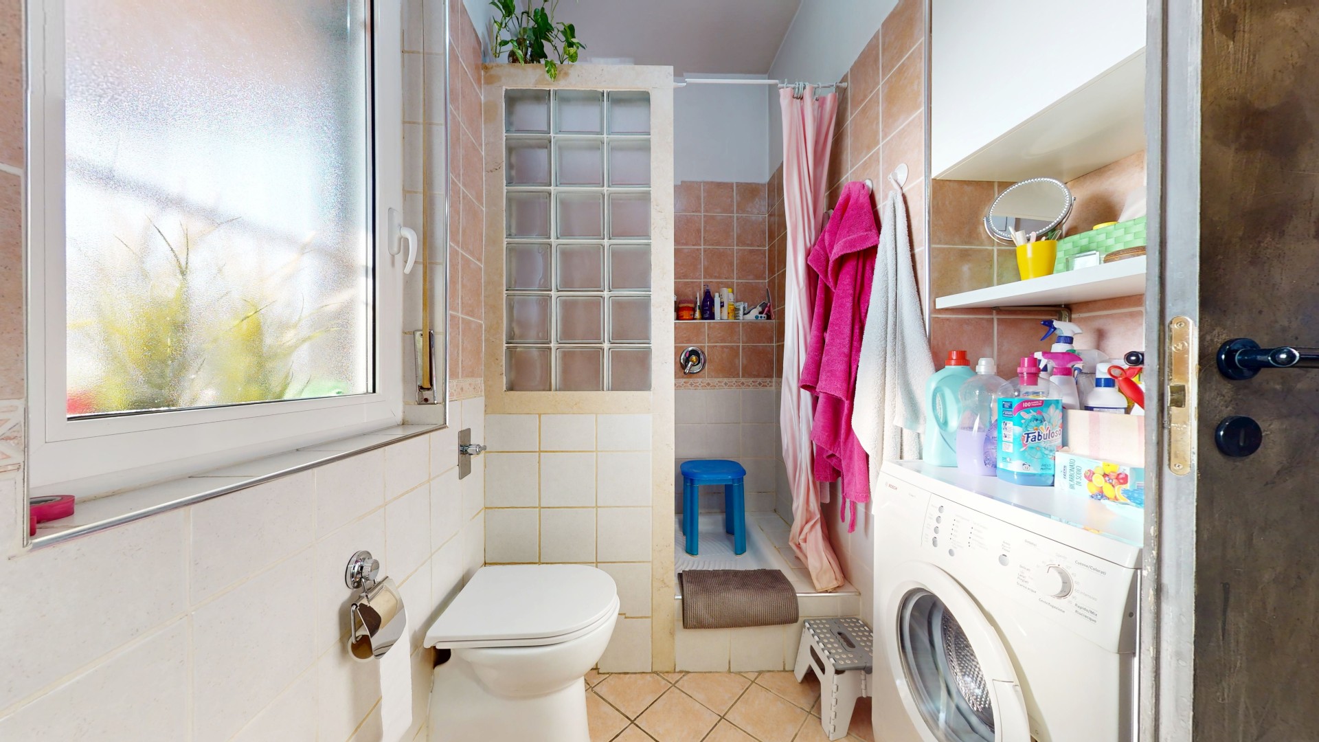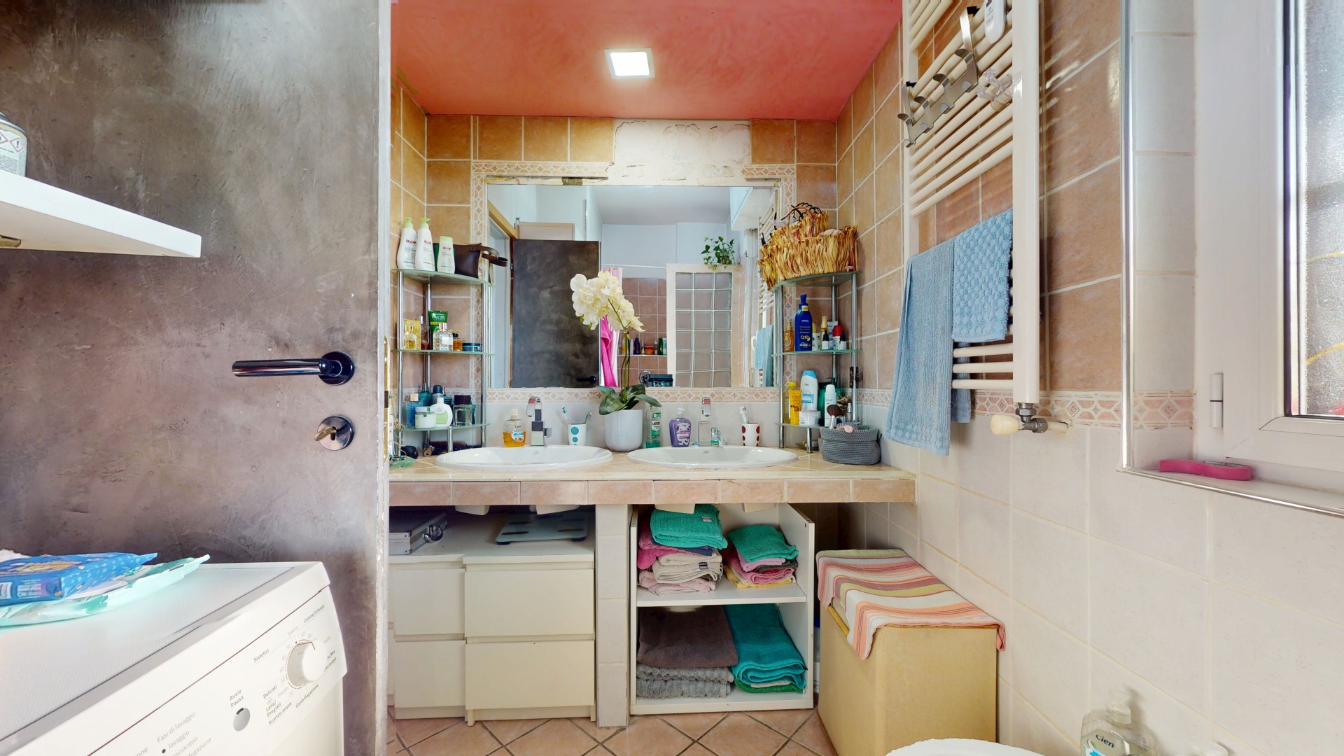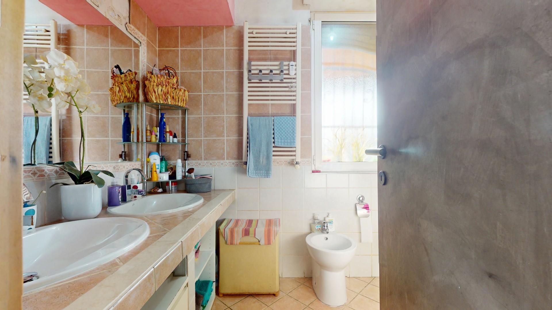 Il bagno, finestrato e con affaccio sul terrazzo è completo di doccia in muratura rivestita in cotto, doppio lavabo Ideal Standard, sanitari a terra, attacchi per lavatrice e inferriate alle finestre.