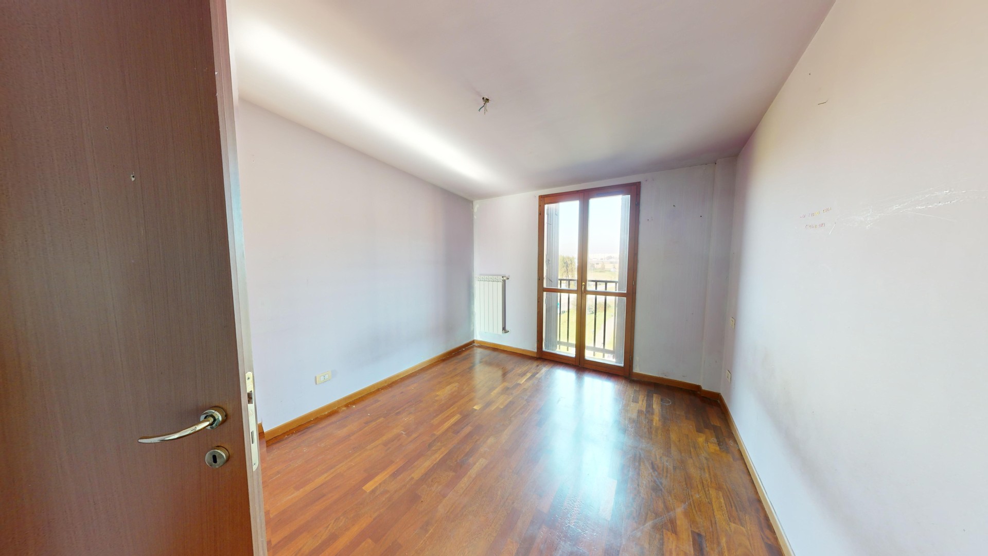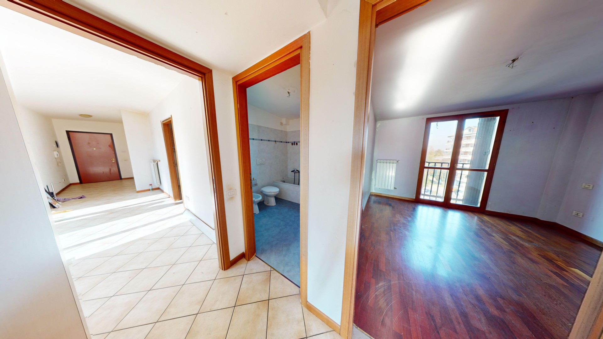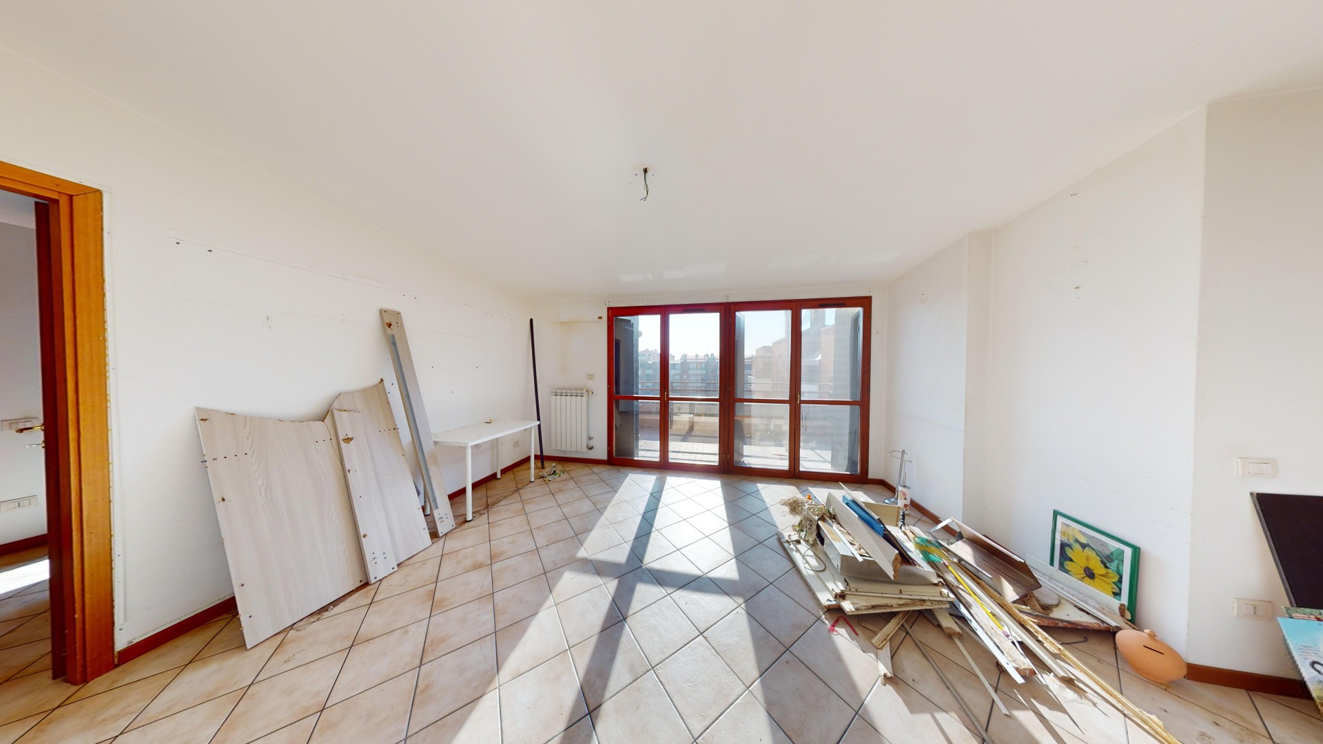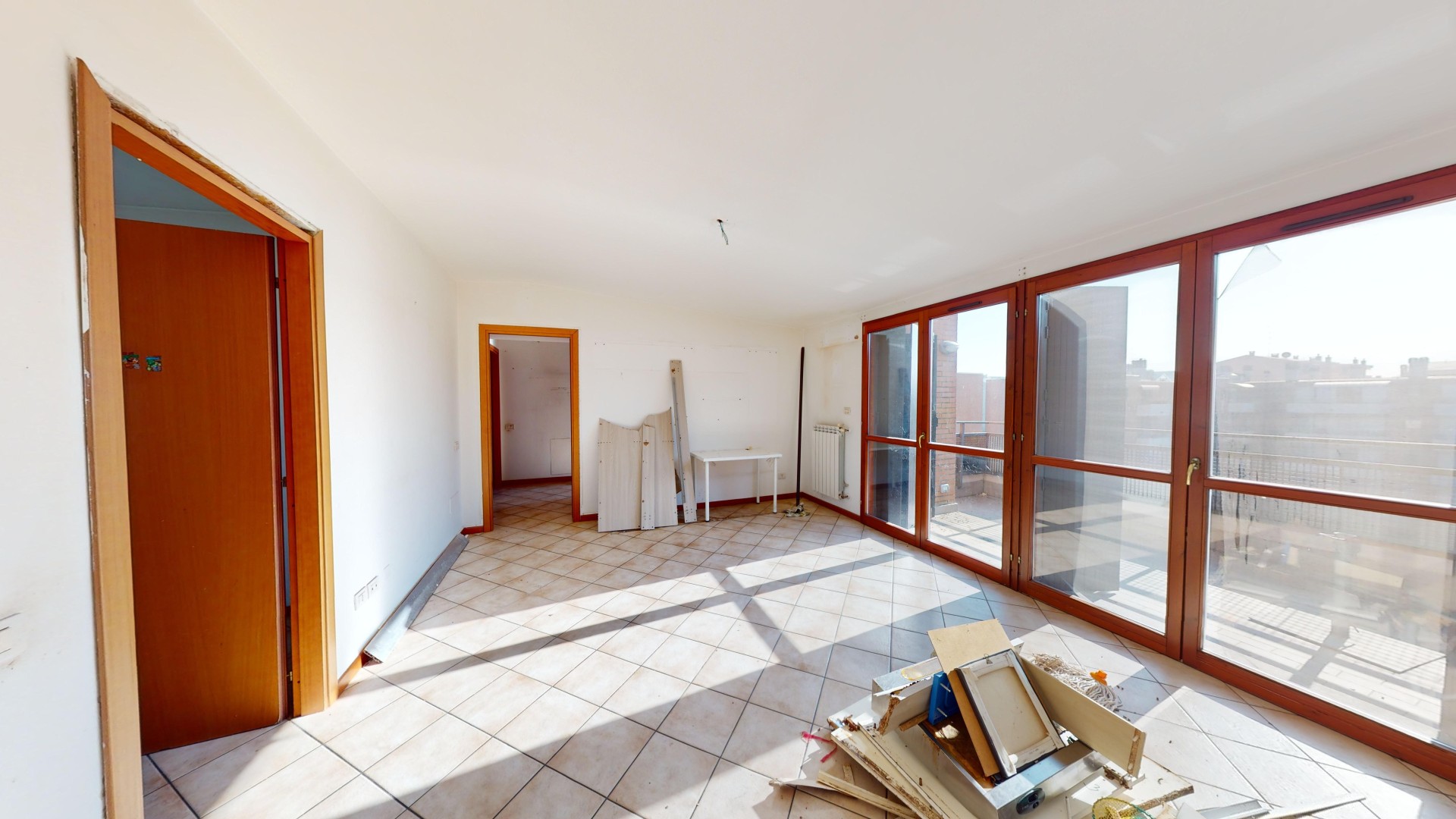 L’ingresso si apre su un corridoio che conduce alla prima camera matrimoniale, spaziosa e luminosa grazie alla porta finestra che garantisce un piacevole affaccio interno. La stanza dispone di un bagno finestrato con doccia, ampio e funzionale. Proseguendo, si accede all’ampio soggiorno, un ambiente accogliente e luminoso grazie alle grandi porte finestre che si aprono su un terrazzo vivibile, perfetto per momenti di relax o convivialità.