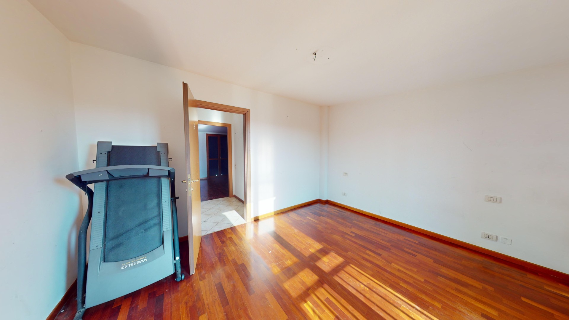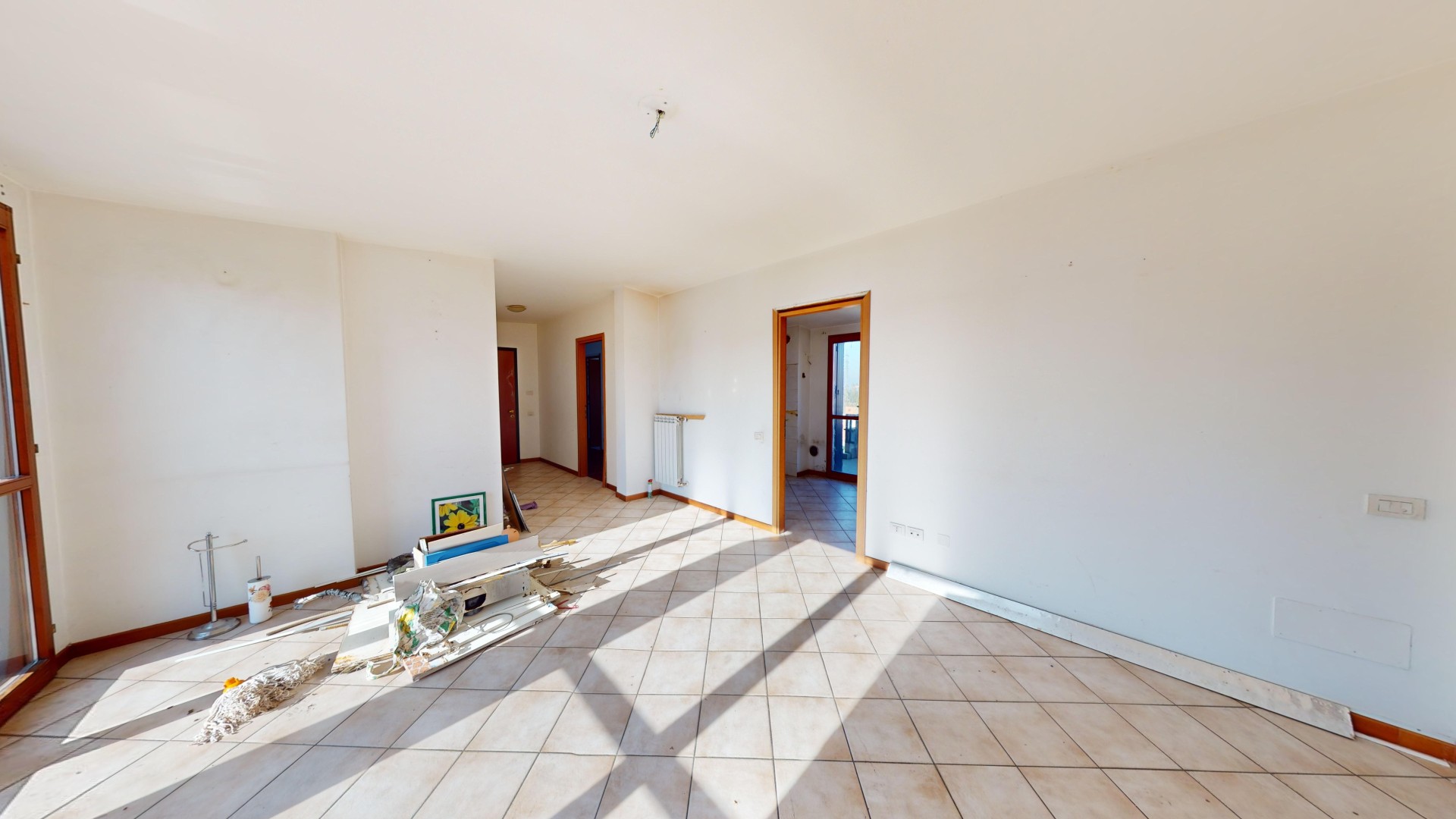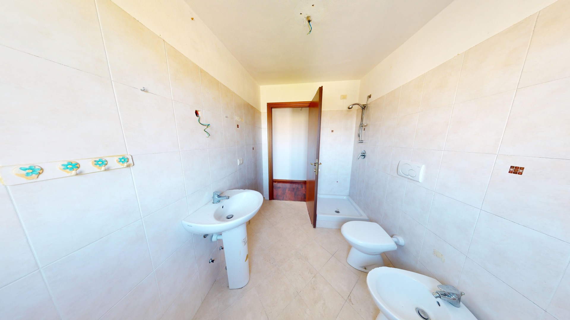 L’ingresso si apre su un corridoio che conduce alla prima camera matrimoniale, spaziosa e luminosa grazie alla porta finestra che garantisce un piacevole affaccio interno. La stanza dispone di un bagno finestrato con doccia, ampio e funzionale. Proseguendo, si accede all’ampio soggiorno, un ambiente accogliente e luminoso grazie alle grandi porte finestre che si aprono su un terrazzo vivibile, perfetto per momenti di relax o convivialità.