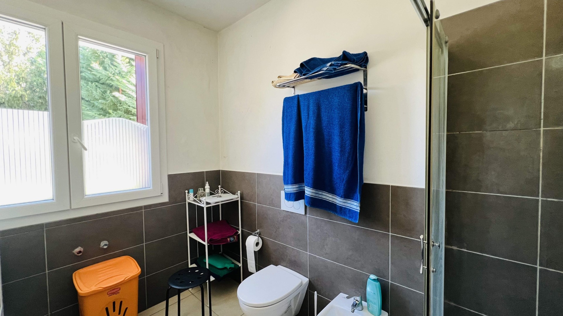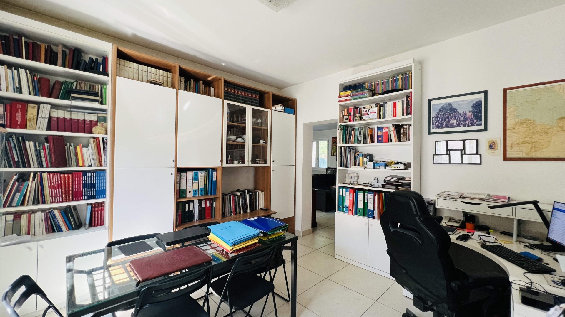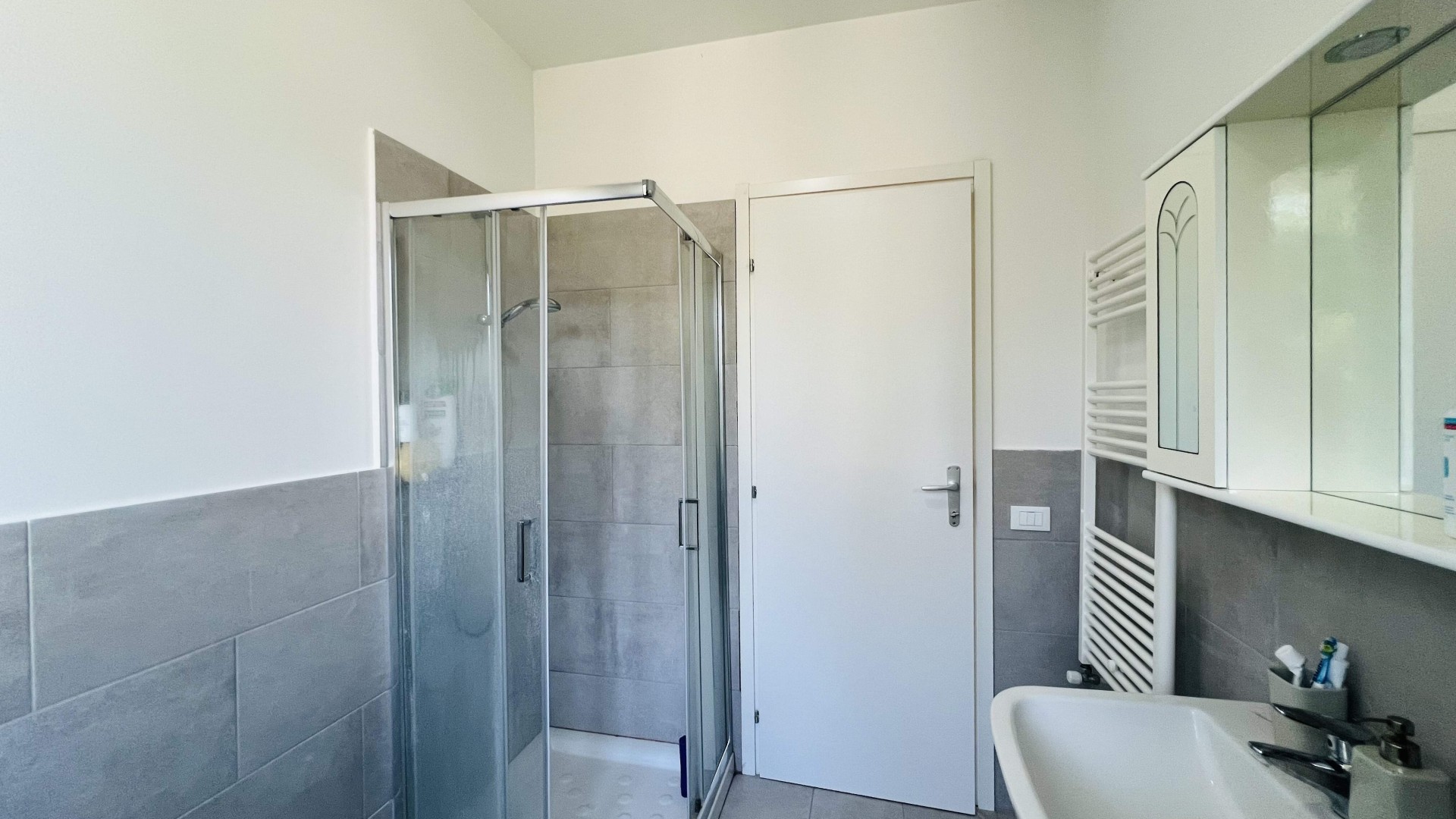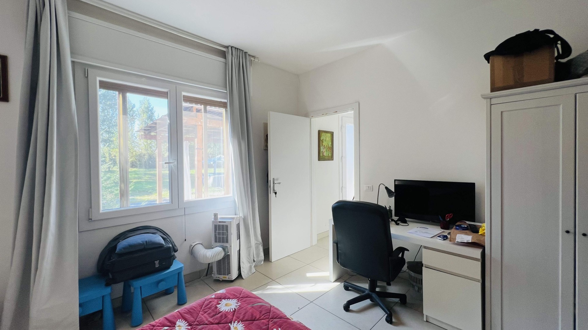 Continuando al piano terra vi sono tre camere da letto, di cui due matrimoniali (una delle quali son bagno finestrato in camera con box doccia e ripostiglio/cabina armadio) ed una singola, un secondo bagno con box doccia ed uno studio.