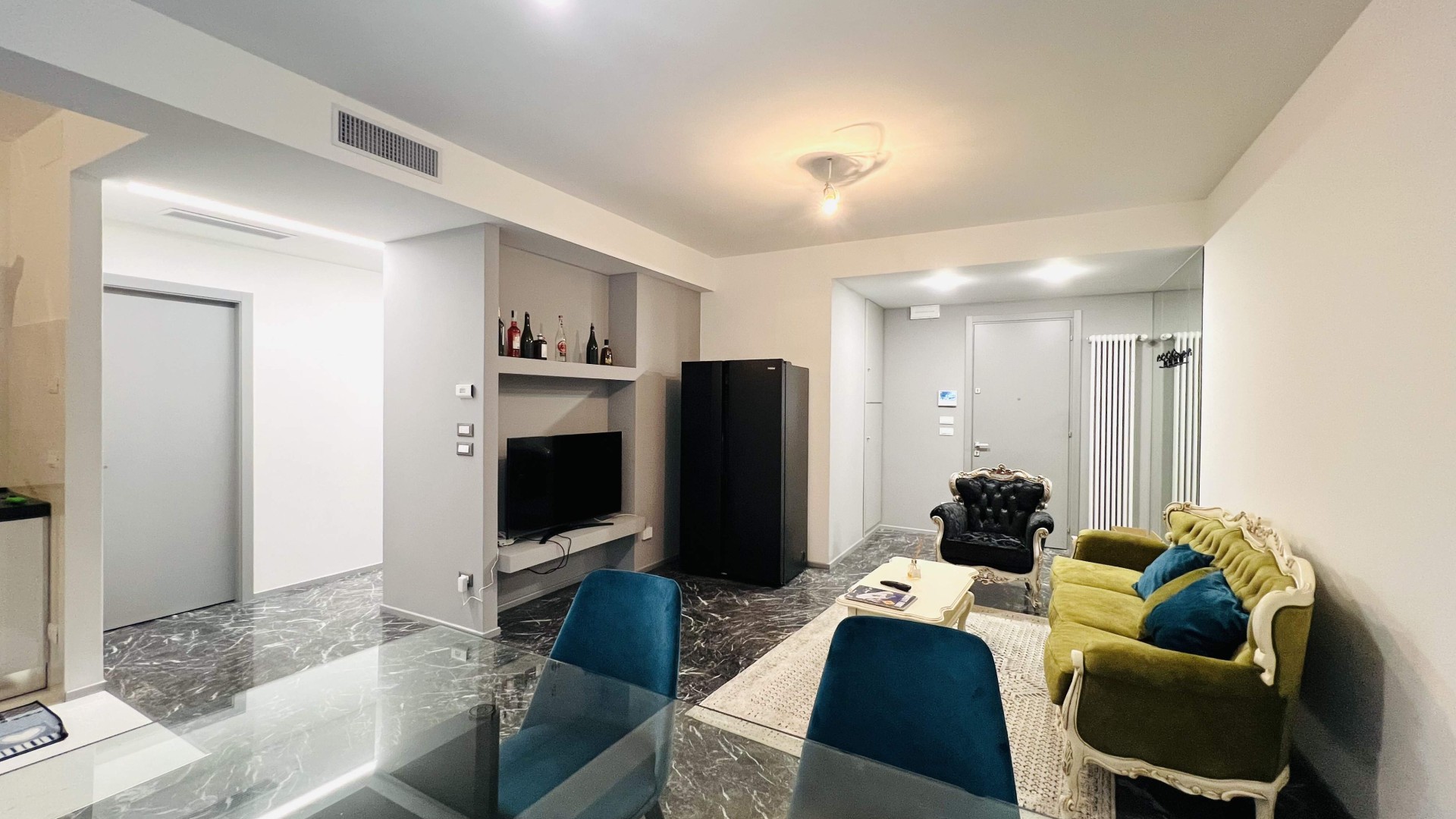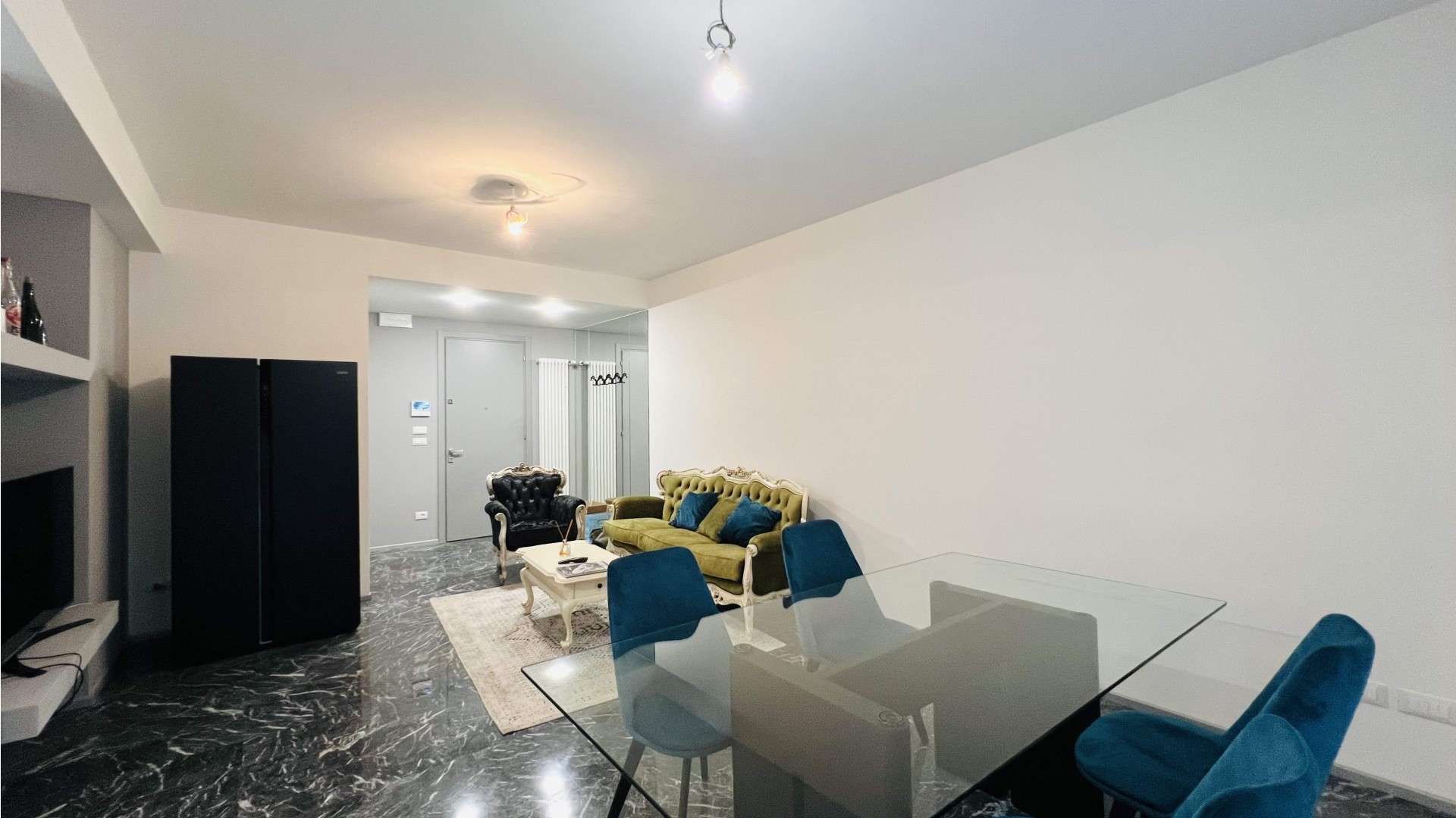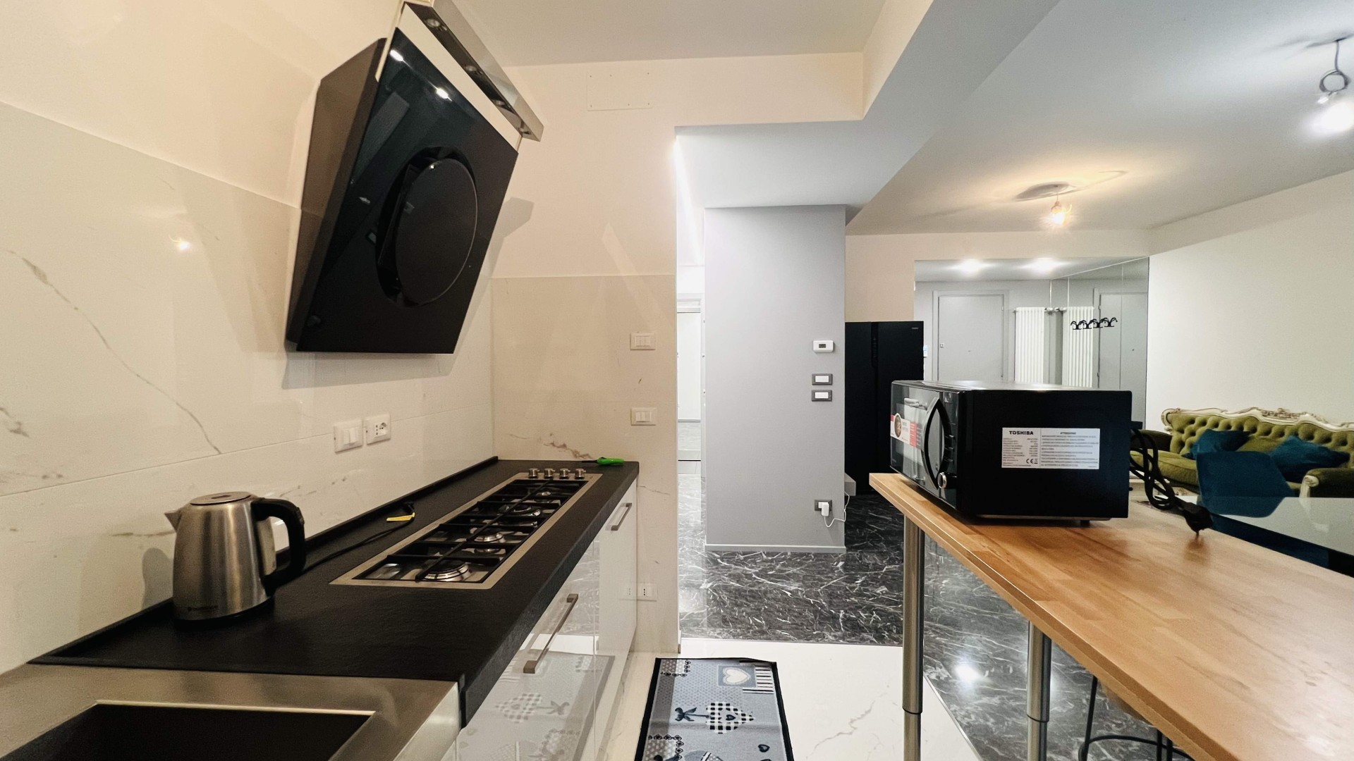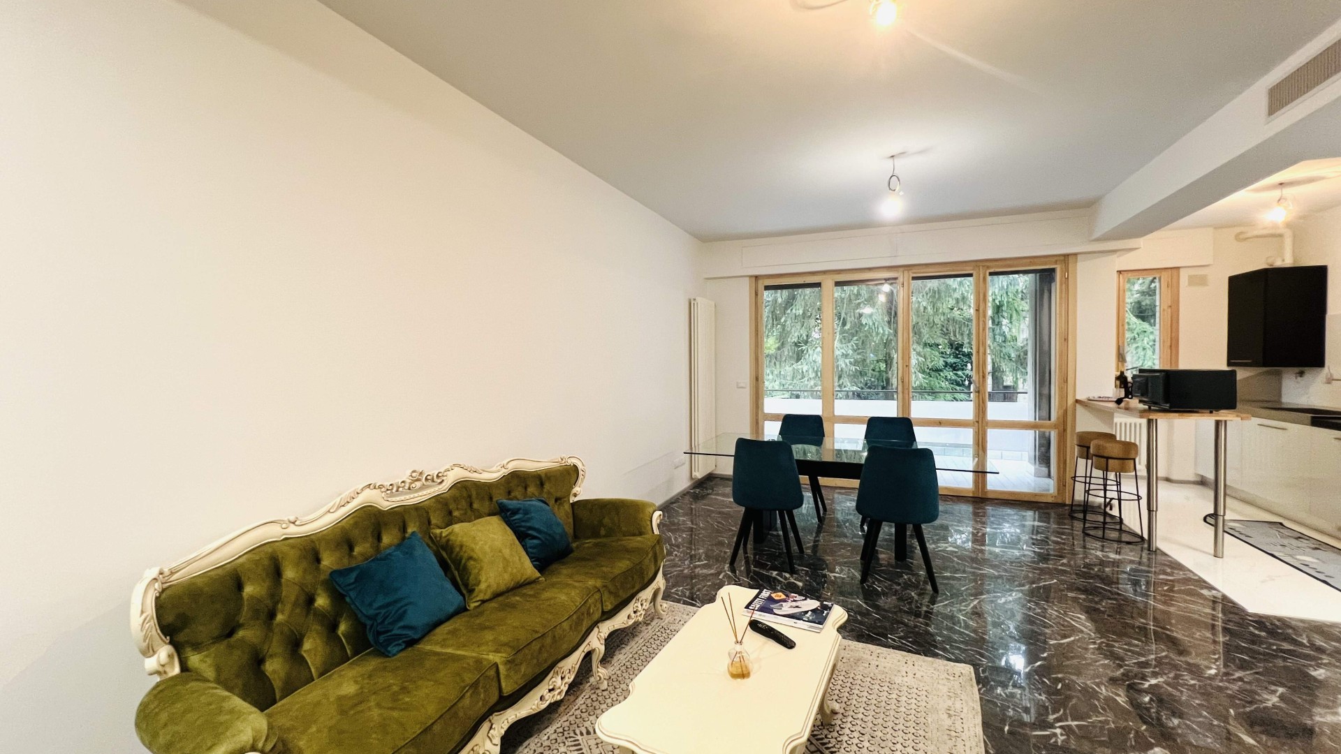 L'immobile si apre su una zona giorno open-space elegante ed accogliente, dove il soggiorno e la cucina a vista si fondono armoniosamente in un unico ambiente ideale per momenti di relax e convivialità. Le ampie aperture che consentono l'accesso al terrazzo abitabile garantiscono un'ottima illuminazione naturale.