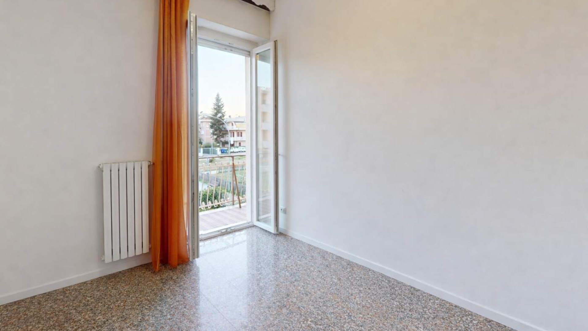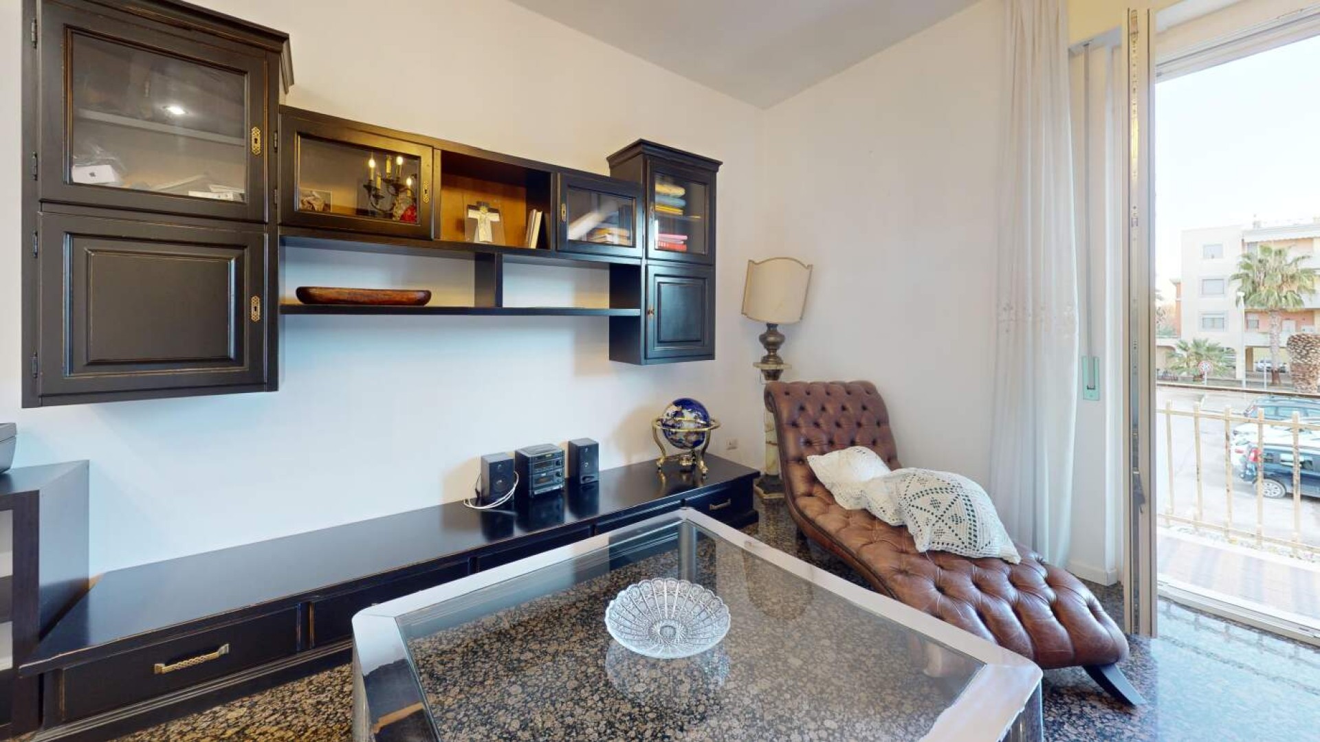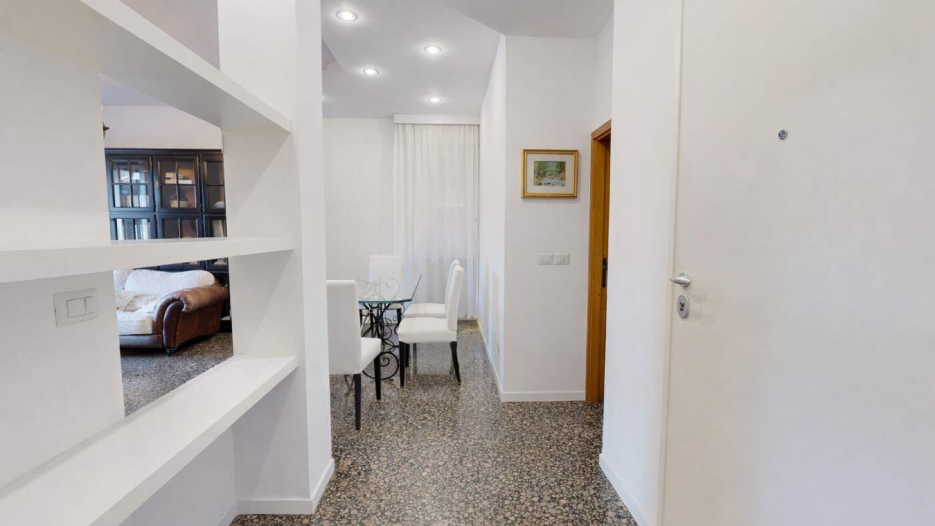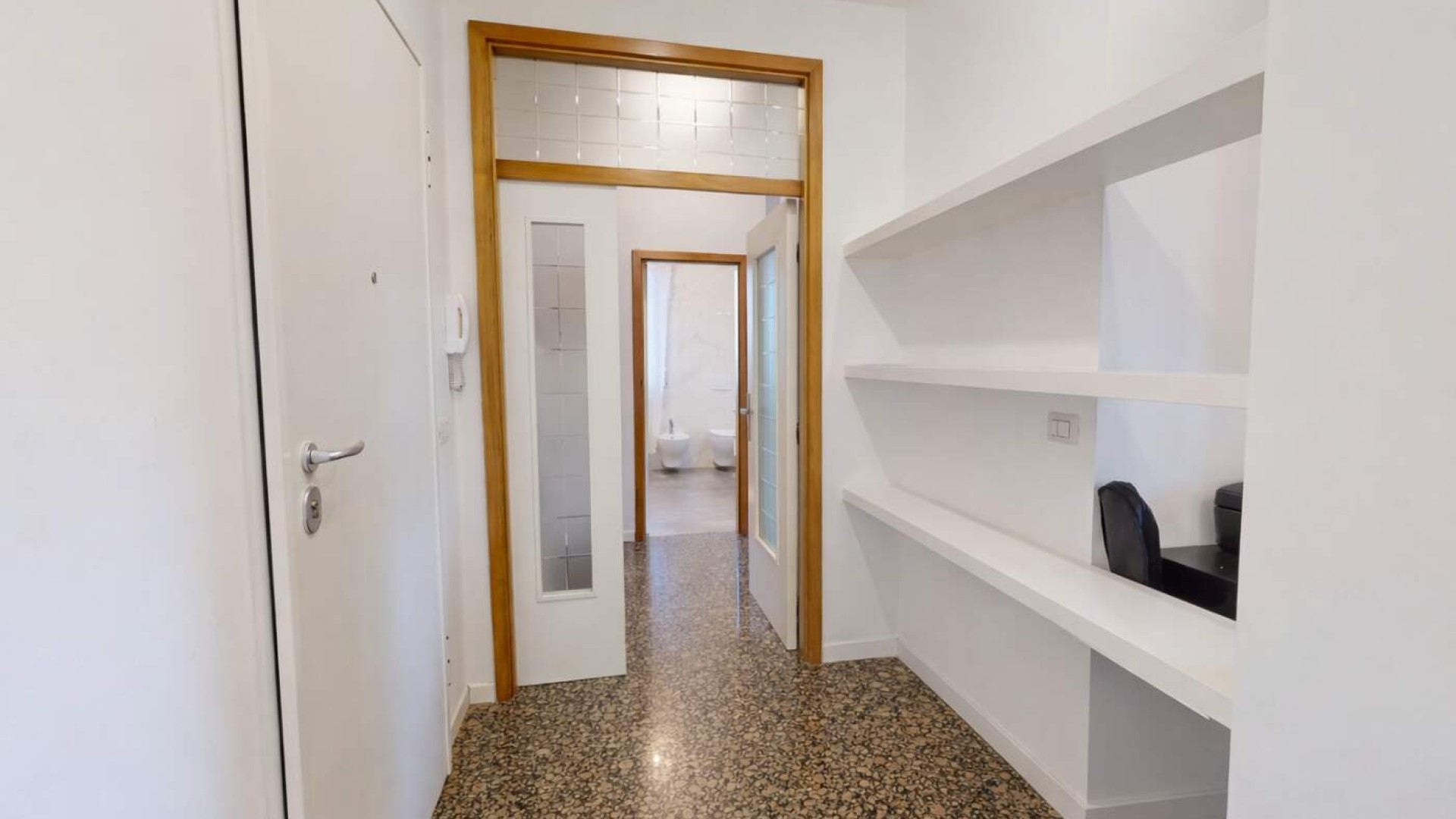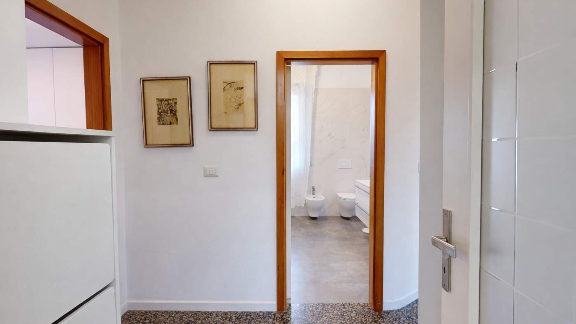 L’ingresso apre su un comodo disimpegno che conduce a un ampio e luminoso soggiorno, impreziosito dall’accesso al balcone, ideale per momenti di relax.