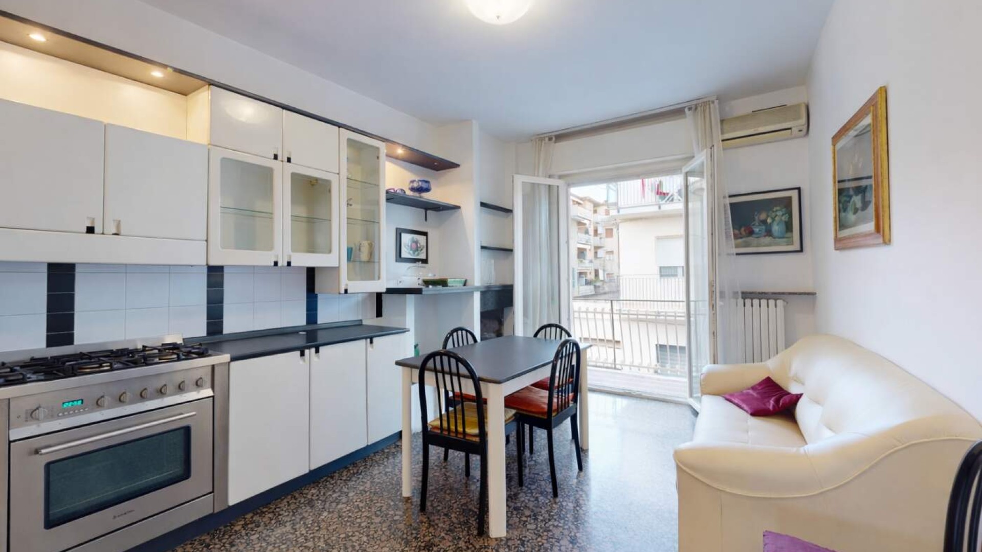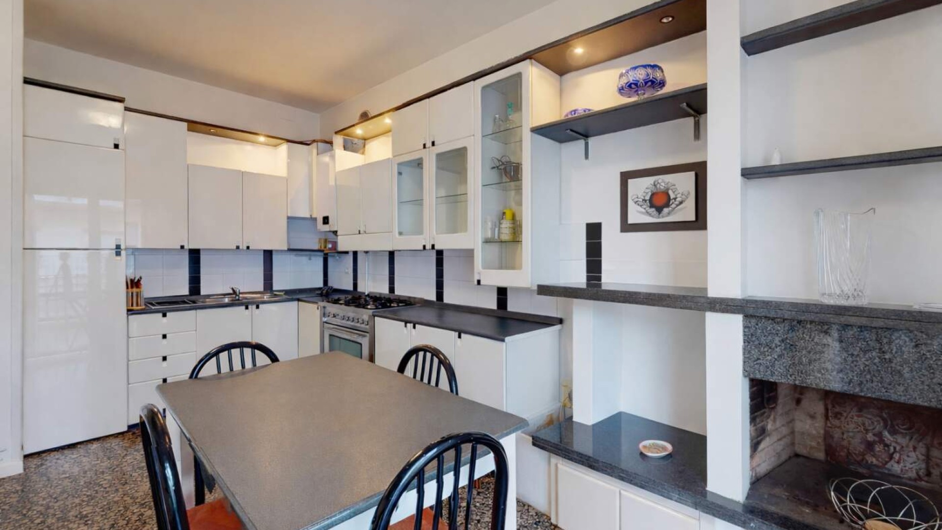 La cucina è separata e abitabile con camino, anch’essa con uscita su balcone, perfetta per chi ama vivere la casa in modo funzionale senza rinunciare alla convivialità.