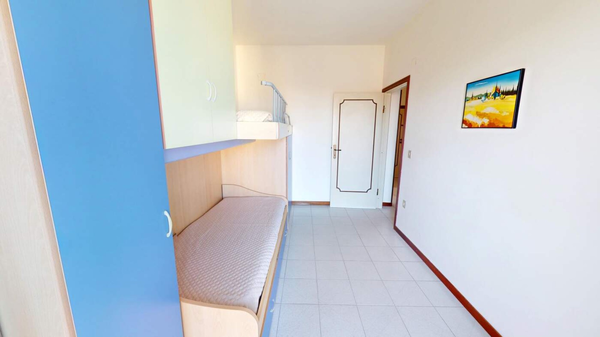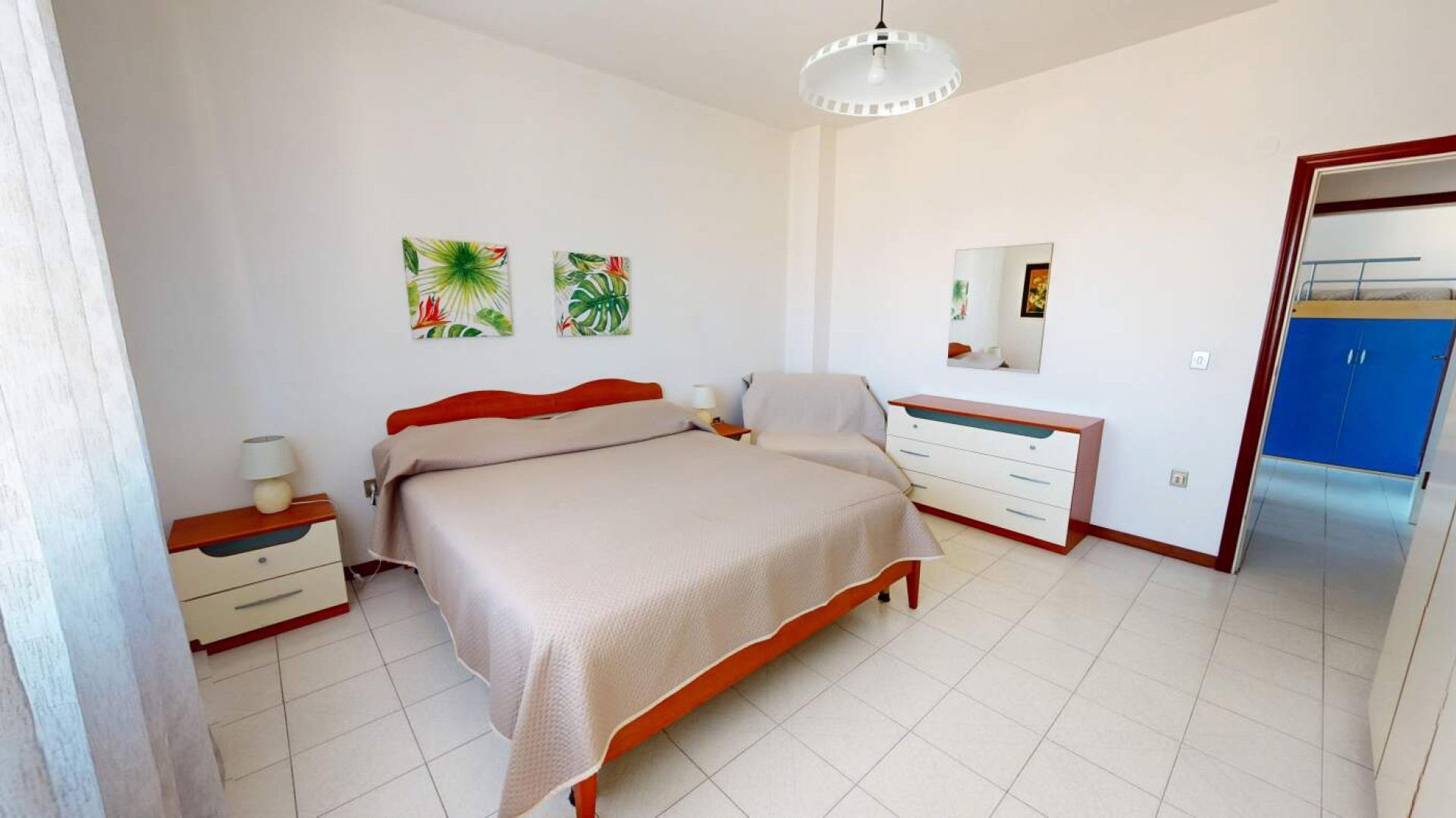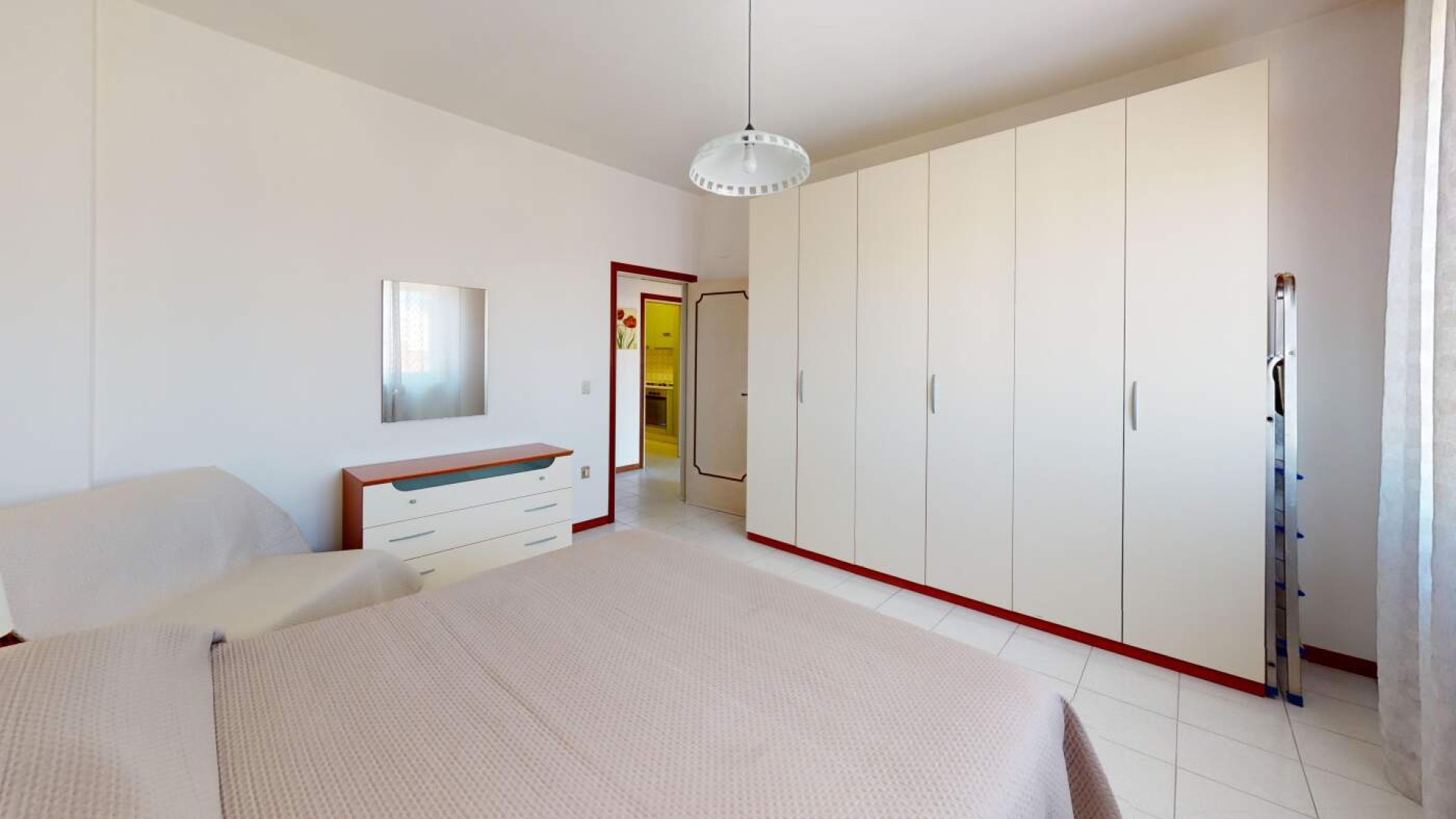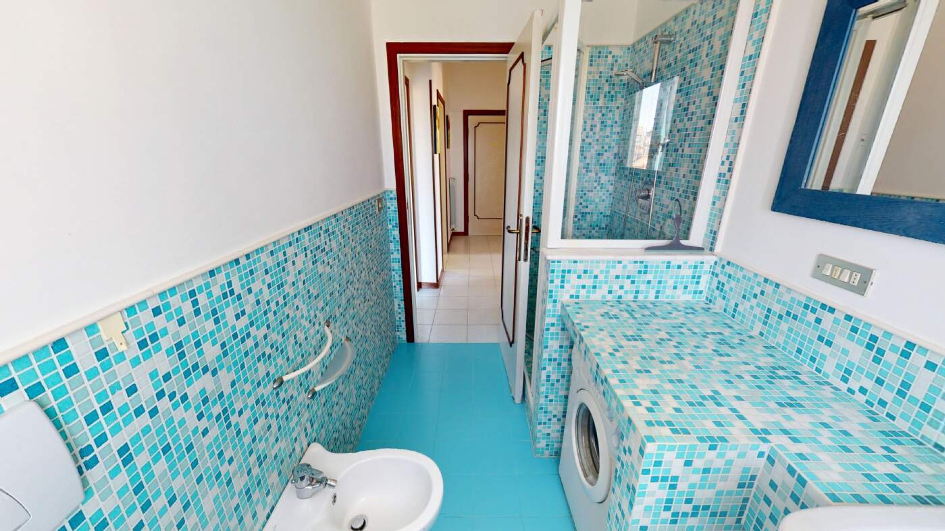 La zona notte è ottimamente distribuita e comprende una spaziosa camera matrimoniale con affaccio al balcone, una seconda camera doppia collegata a un terrazzino di 3,5 mq esposto a Est con piacevole vista mare, oltre a un bagno finestrato rifinito con eleganti dettagli in mosaico e dotato di box doccia.