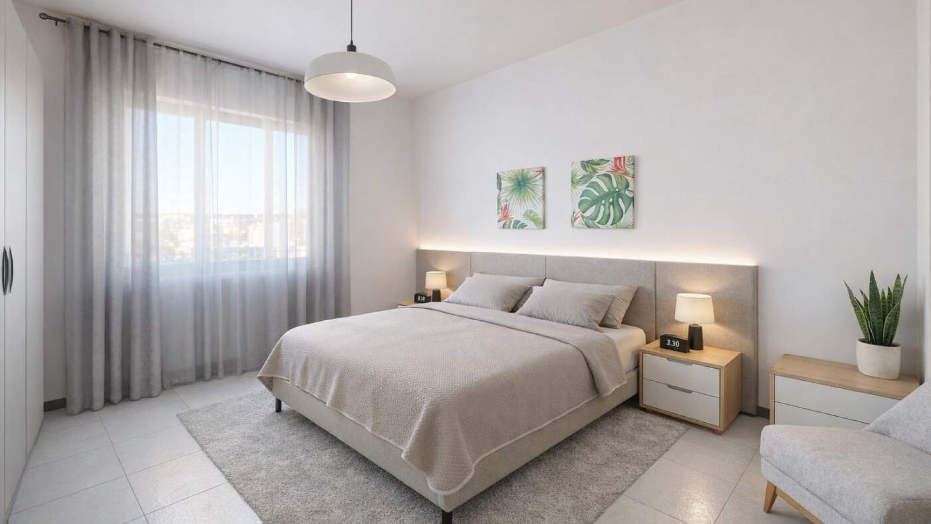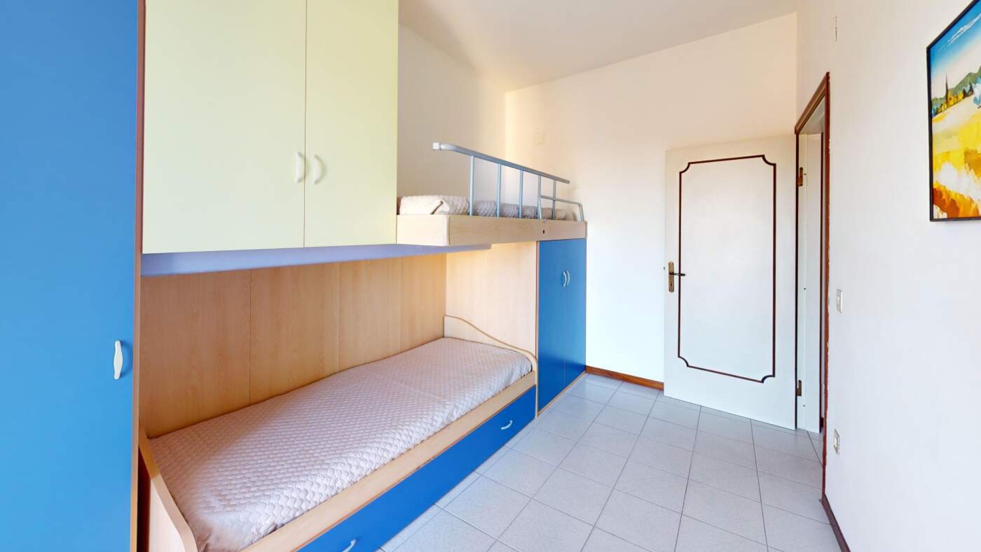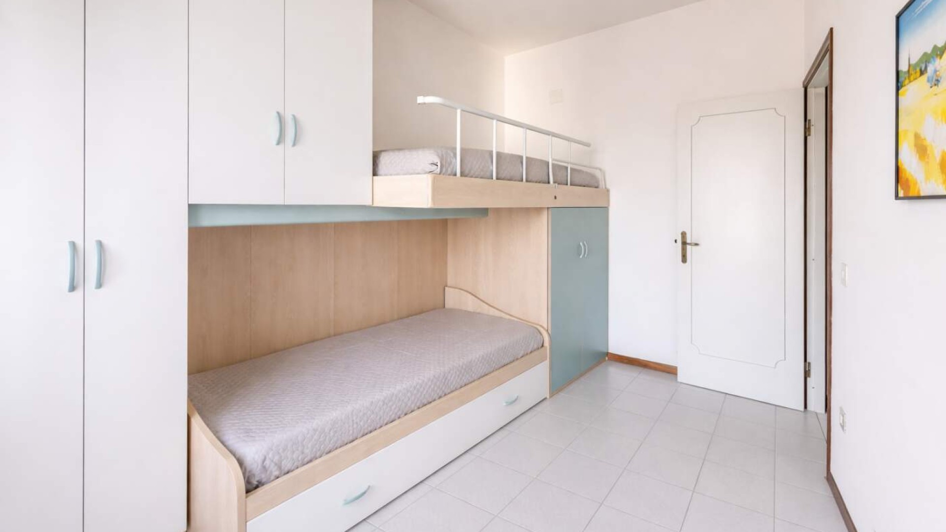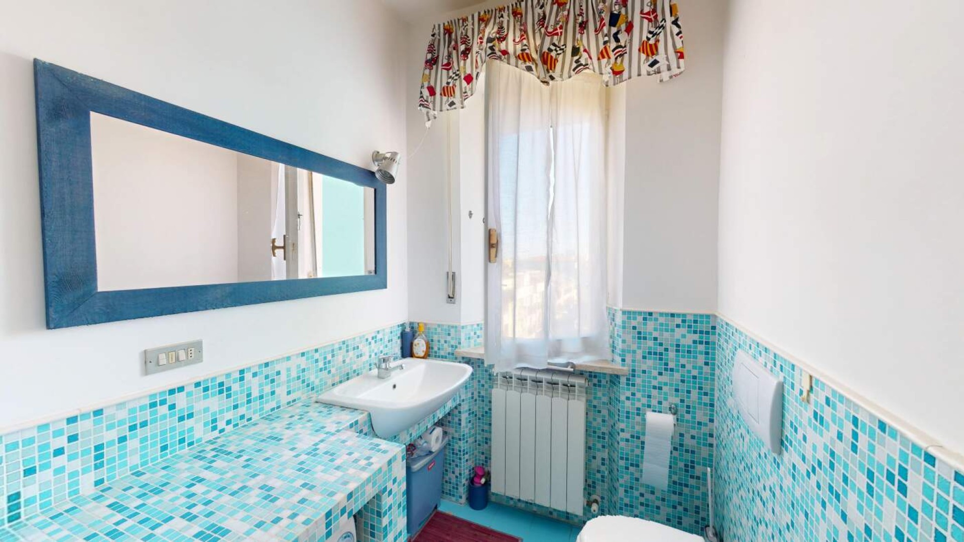 La zona notte è ottimamente distribuita e comprende una spaziosa camera matrimoniale con affaccio al balcone, una seconda camera doppia collegata a un terrazzino di 3,5 mq esposto a Est con piacevole vista mare, oltre a un bagno finestrato rifinito con eleganti dettagli in mosaico e dotato di box doccia.