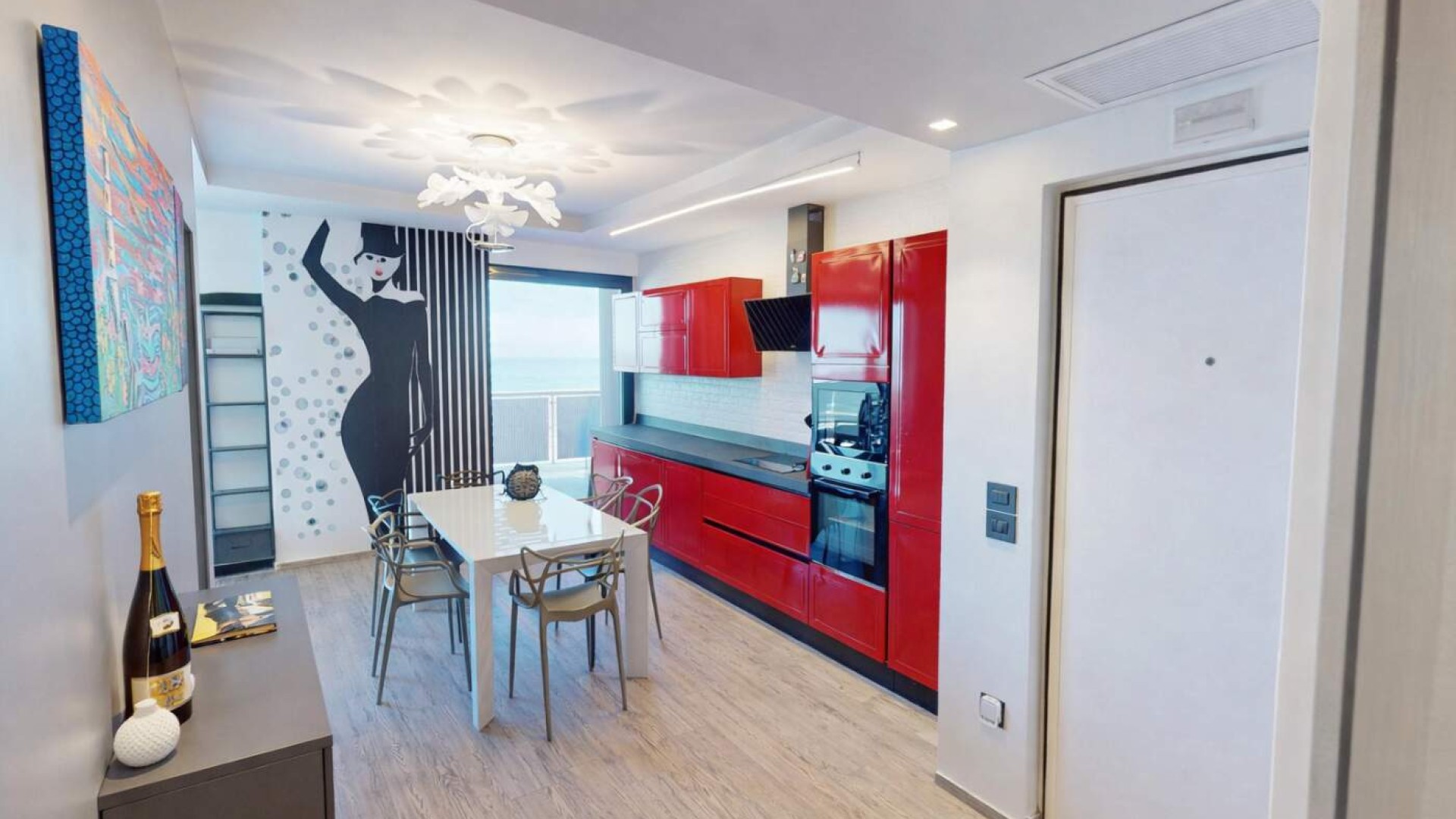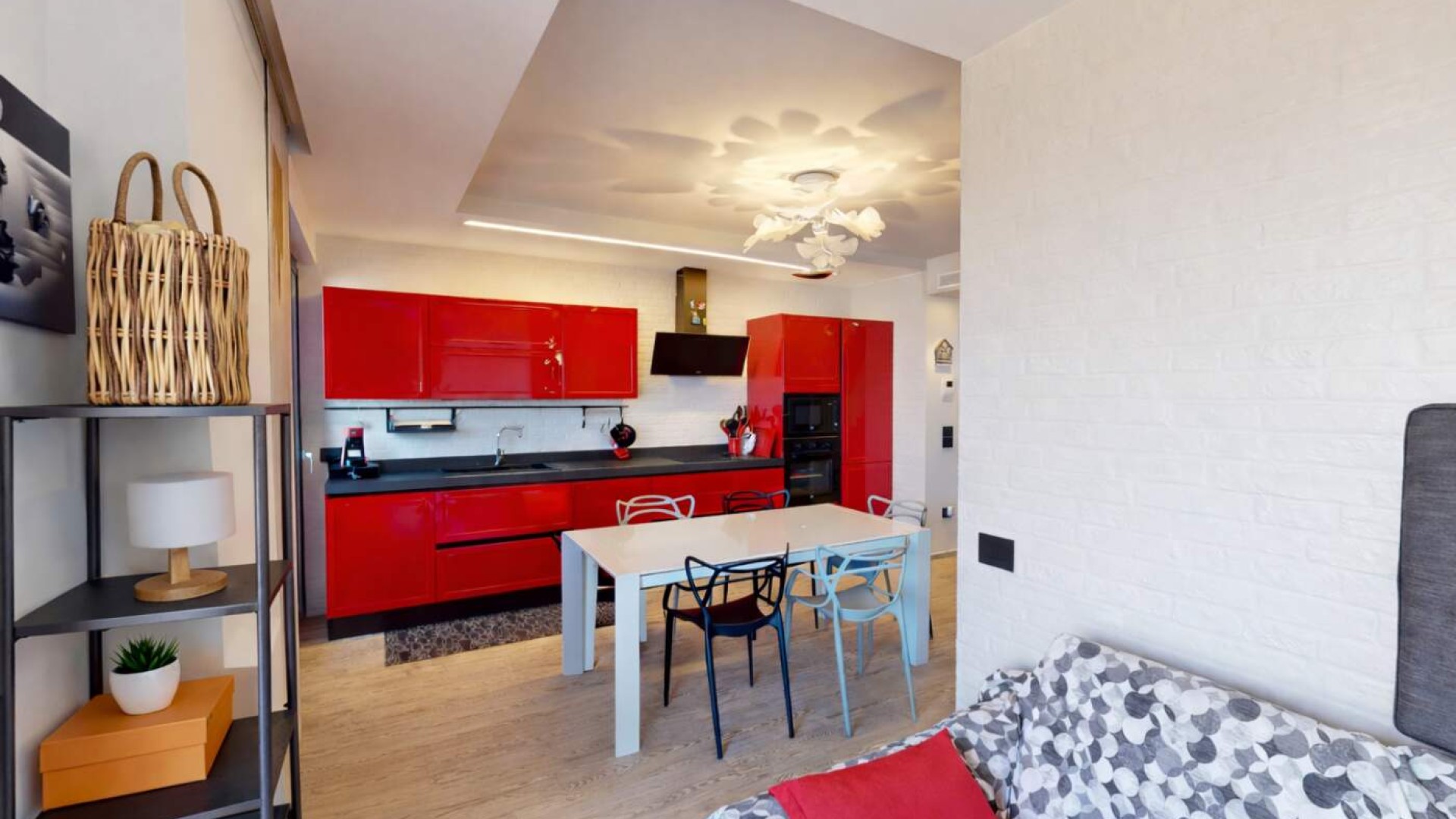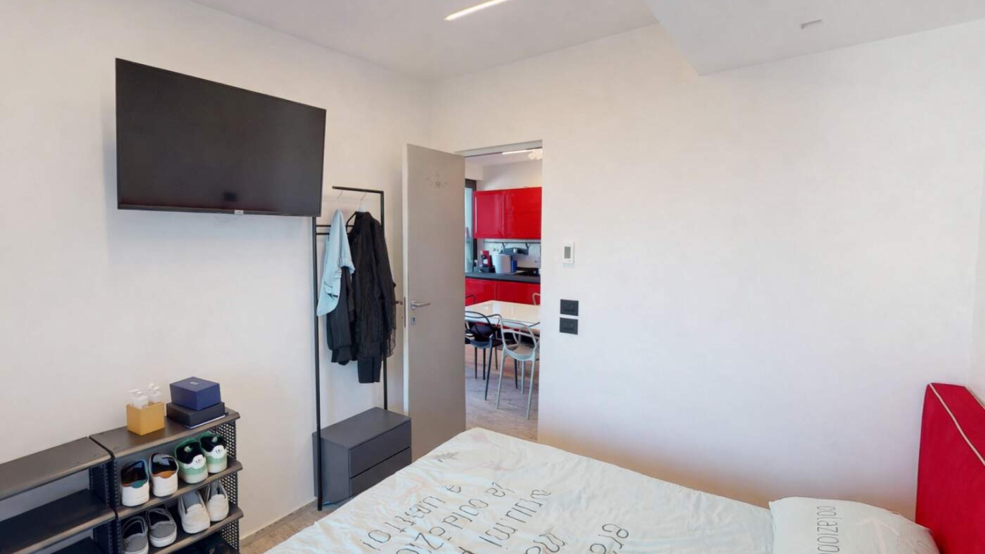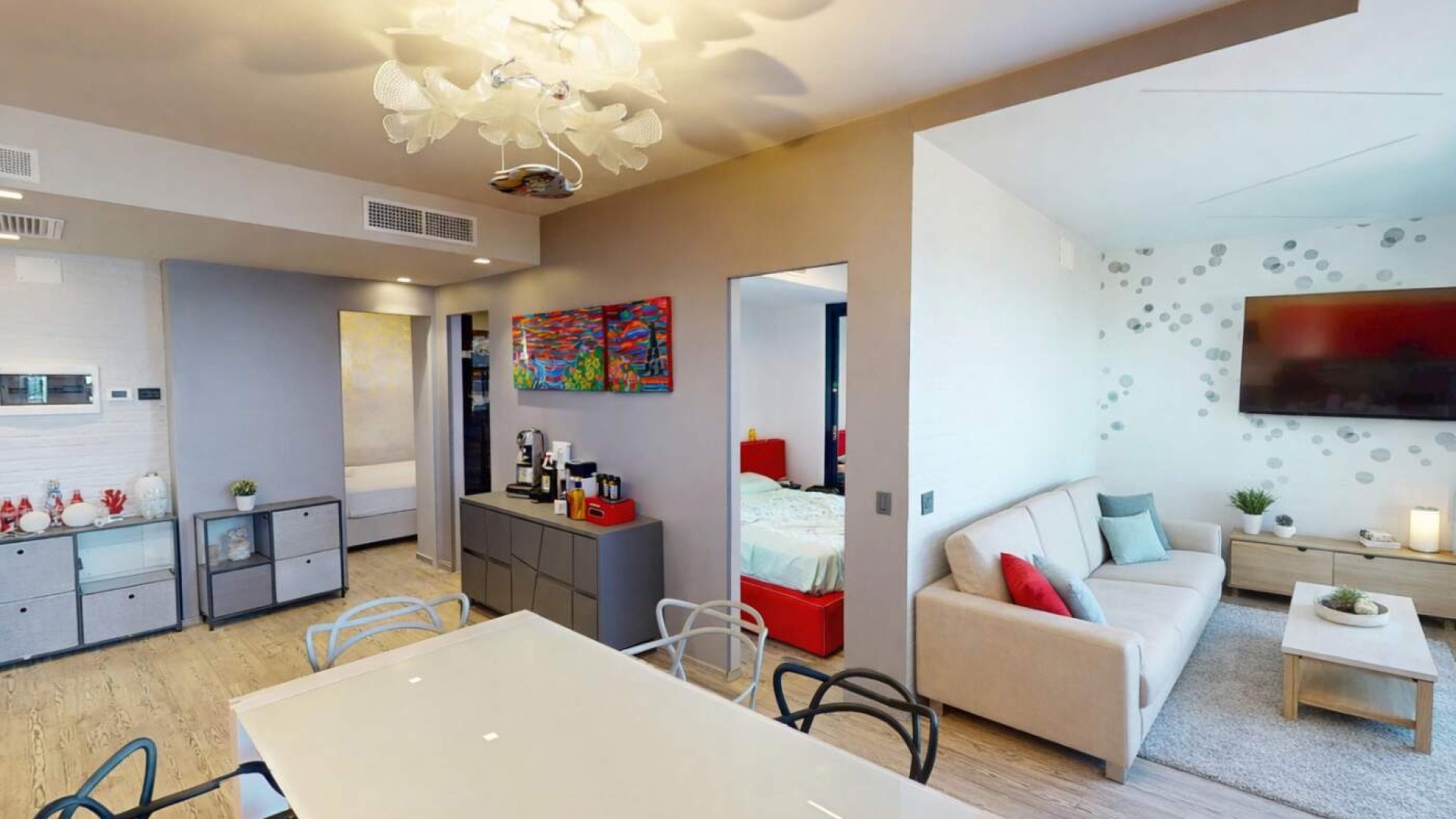 L’ingresso si apre su una zona giorno luminosa, dove il soggiorno con cucina a vista crea un ambiente moderno e conviviale, ideale per vivere appieno ogni momento della giornata.